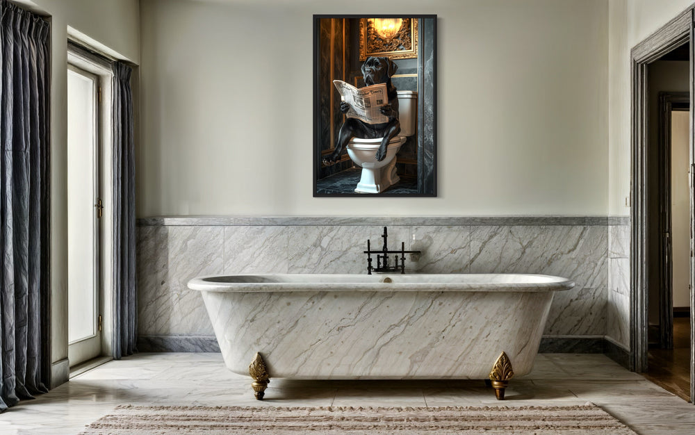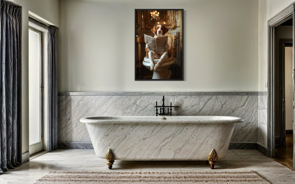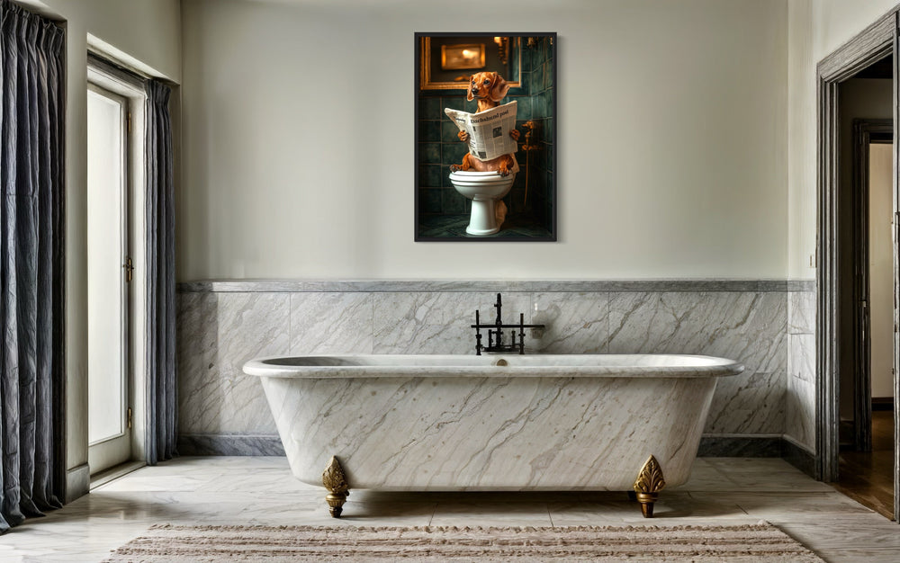 Jeder Druck des Hundes auf der Toilette der Serie besticht durch eine reiche Farbpalette, die zum Charme des Kunstwerks beiträgt. Warme Holztöne, elfenbeinfarbene Paneele, tiefes Schwarz und Spritzer in gedecktem Grün oder Marineblau bilden einen Hintergrund, der die Textur und Tiefe jedes Bildes unterstreicht. Viele Gemälde verwenden intensive Lichteffekte – goldenes Leuchten oder weiche Schatten –, die der Badezimmerszene eine dramatische und zugleich gemütliche Atmosphäre verleihen. Diese Drucke enthalten oft ergänzende Akzente wie gerollte Handtücher, geflieste Böden oder Marmorwaschbecken, die die Farbgebung verbinden und gleichzeitig den Fokus auf den zentralen humorvollen Moment richten. Hunde werden in naturgetreuen Farbtönen wiedergegeben, sei es das Braun eines Dackels, das Creme eines Golden Retrievers oder das tiefe Schwarz eines französischen Pudels. Die Zeitungen, die sie lesen, sind oft raffiniert betitelt und fügen sich in Sepia- oder Grautönen subtil in die Szene ein. Die Vielfalt der Hintergründe, von eleganten Vintage-Badezimmern bis hin zu strahlend weißen, modernen Einrichtungen, sorgt für eine Farbkombination, die zu Ihrer individuellen Einrichtung passt. Selbst kleinste Akzente – wie Zahnbürstenhalter oder Wandrahmen – sind sorgfältig aufeinander abgestimmt. Diese Gemälde wirken trotz ihres verspielten Inhalts dank ihrer einheitlichen Farbtöne und der anspruchsvollen Präsentation raffiniert. Jedes Bild mit dem auf der Toilette sitzenden und Zeitung lesenden Hund ist ein farblich ausgewogenes Werk voller Spaß und Finesse.