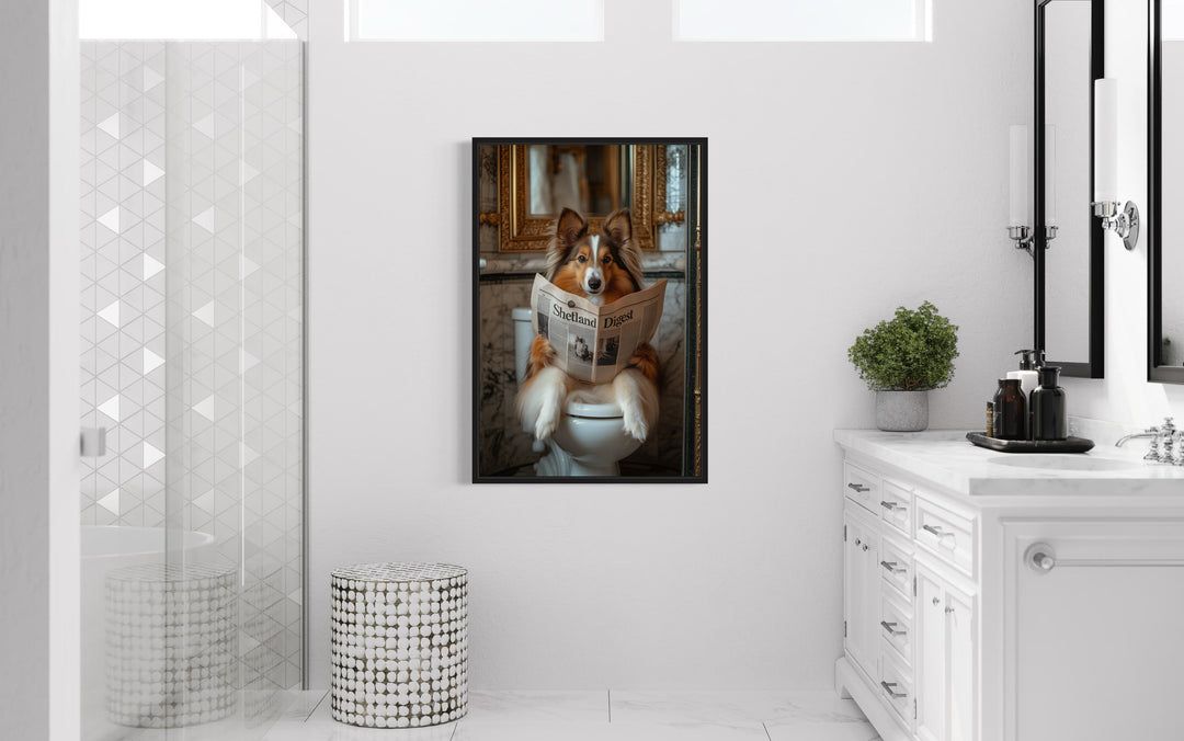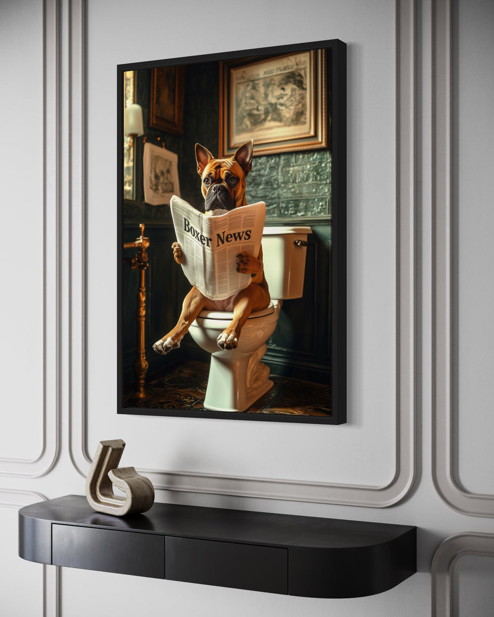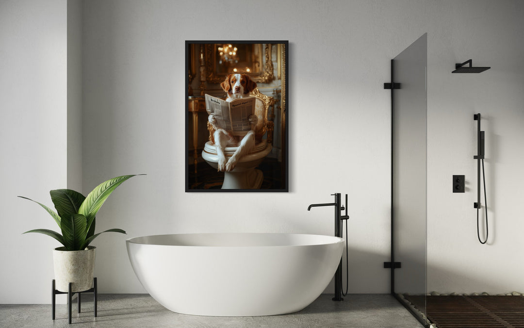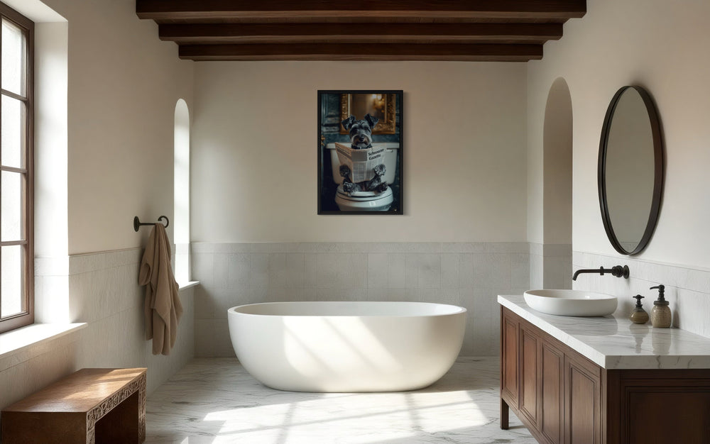 Unsere Bilder mit einem Hund, der auf der Toilette sitzt und Zeitung liest, bringen eine unerwartete Prise Humor und Persönlichkeit in Badezimmer und verwandeln den Alltag in ein wunderbares visuelles Erlebnis. Diese Gemälde im Fotografie-Stil zeigen eine große Bandbreite an Hunderassen, von würdevollen Bulldoggen bis hin zu zotteligen Labradoodles, die alle mit einer Zeitung in der Pfote auf einer Toilette sitzen und so die perfekte Balance zwischen komischem Charme und künstlerischem Detail finden. Der Gesamtstil imitiert die klassische Porträtmalerei, ergänzt durch skurrile Elemente, die jedes Gemälde zu einem echten Unikat machen. Ob ein Shetland Sheepdog, der in Ruhe Seiten umblättert, oder eine Französische Bulldogge, die in die Schlagzeilen vertieft ist – jeder Hund verleiht dem Werk seinen eigenen, schrulligen Charakter. Der fotografiebasierte Kunststil verbindet hohen Realismus mit einem Hauch von Fantasie, wobei Schatten, Texturen und Badezimmer-Settings nahezu perfekt wiedergegeben sind. Dieses Wanddekor zaubert ein Lächeln aufs Gesicht und verleiht gleichzeitig einen gehobenen Look, der sowohl in moderne als auch in traditionelle Räume passt. Das Kunstwerk wird in verschiedenen Größen auf Leinwand gedruckt und passt sich somit ideal an große und kleine Badezimmer an. Die detailreichen Badezimmerhintergründe – von Vintage-Waschtischen bis hin zu minimalistischen Interieurs – verleihen jedem Bild eine interessante Note. Ihr Raum wird sich nie wieder so anfühlen, wenn er mit einem Wandbild mit einem Hund, der auf der Toilette sitzt und Zeitung liest, aufgewertet wird.