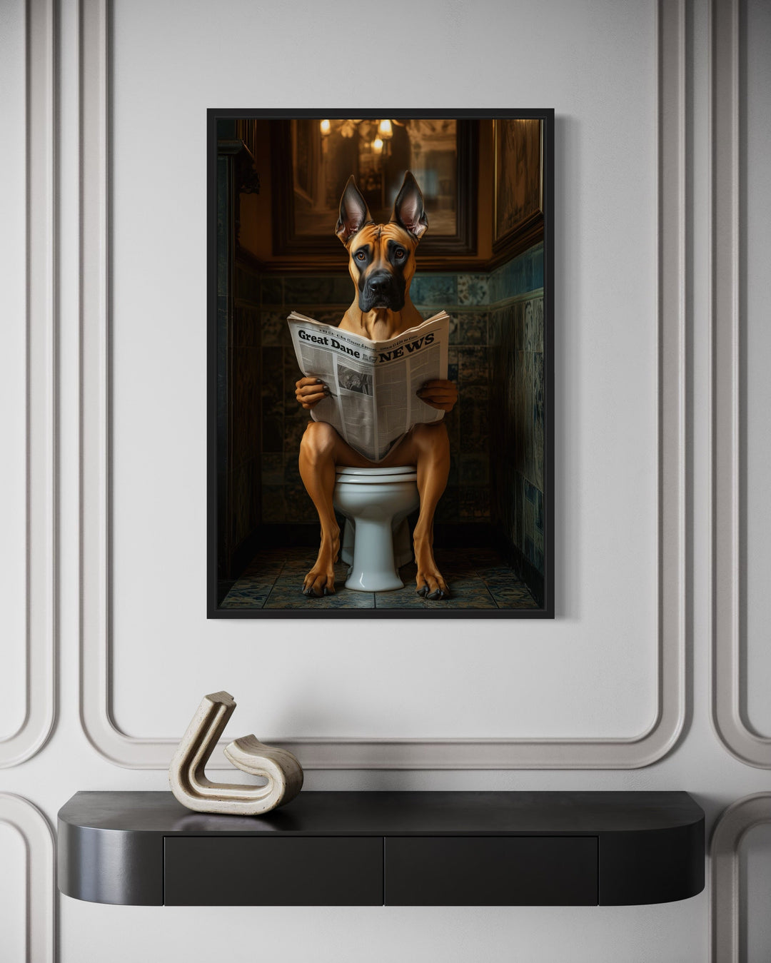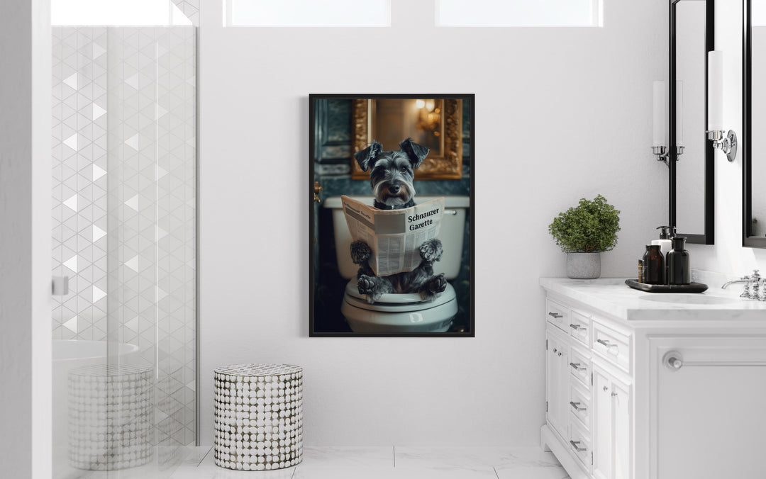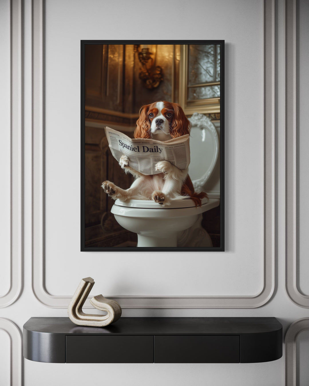 Unsere Bilder mit einem Hund, der auf der Toilette sitzt und Zeitung liest, bringen eine unerwartete Prise Humor und Persönlichkeit in Badezimmer und verwandeln den Alltag in ein wunderbares visuelles Erlebnis. Diese Gemälde im Fotografie-Stil zeigen eine große Bandbreite an Hunderassen, von würdevollen Bulldoggen bis hin zu zotteligen Labradoodles, die alle mit einer Zeitung in der Pfote auf einer Toilette sitzen und so die perfekte Balance zwischen komischem Charme und künstlerischem Detail finden. Der Gesamtstil imitiert die klassische Porträtmalerei, ergänzt durch skurrile Elemente, die jedes Gemälde zu einem echten Unikat machen. Ob ein Shetland Sheepdog, der in Ruhe Seiten umblättert, oder eine Französische Bulldogge, die in die Schlagzeilen vertieft ist – jeder Hund verleiht dem Werk seinen eigenen, schrulligen Charakter. Der fotografiebasierte Kunststil verbindet hohen Realismus mit einem Hauch von Fantasie, wobei Schatten, Texturen und Badezimmer-Settings nahezu perfekt wiedergegeben sind. Dieses Wanddekor zaubert ein Lächeln aufs Gesicht und verleiht gleichzeitig einen gehobenen Look, der sowohl in moderne als auch in traditionelle Räume passt. Das Kunstwerk wird in verschiedenen Größen auf Leinwand gedruckt und passt sich somit ideal an große und kleine Badezimmer an. Die detailreichen Badezimmerhintergründe – von Vintage-Waschtischen bis hin zu minimalistischen Interieurs – verleihen jedem Bild eine interessante Note. Ihr Raum wird sich nie wieder so anfühlen, wenn er mit einem Wandbild mit einem Hund, der auf der Toilette sitzt und Zeitung liest, aufgewertet wird.