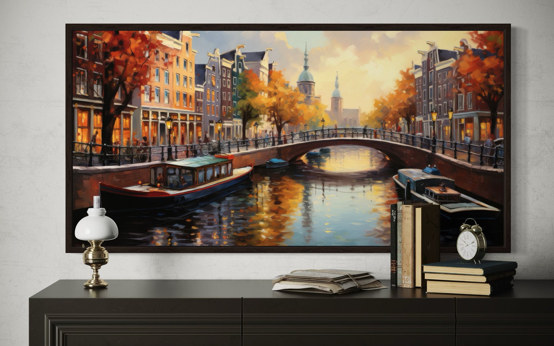 Wandbild mit Amsterdamer Kanalmotiv – Gerahmter Leinwanddruck mit urbanem Flair