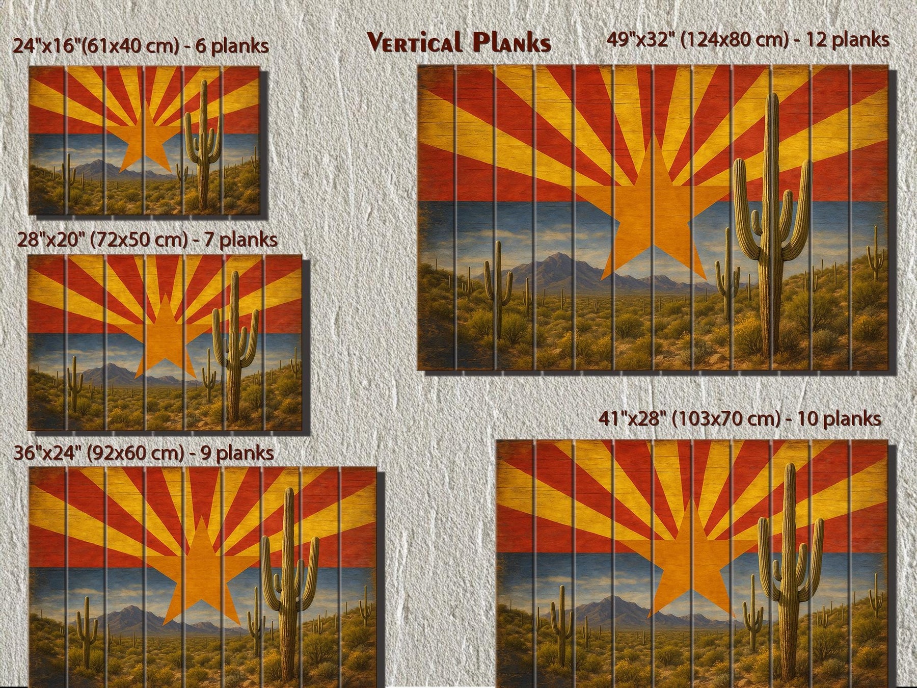Wandbild aus Altholz mit Arizona-Flagge und Wüstenmotiv