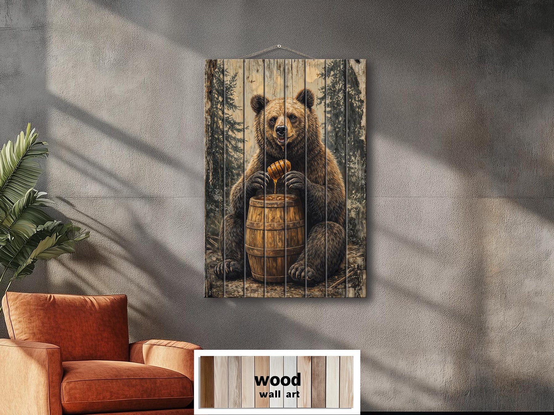Vertical wood wall art featuring a bear with a honey barrel in a rustic, forest setting.