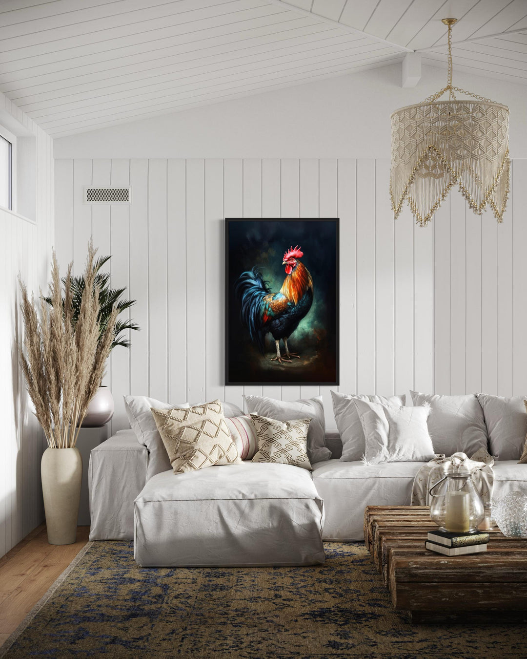 Dieses Hahn-Wandbild ist eine ausgezeichnete Wahl für Küchen, Esszimmer oder Eingangsbereiche, wo es dem Raum einen lebendigen Blickfang verleiht. Es wirkt wunderbar in Kombination mit Holzmöbeln, rustikalen Akzenten oder bäuerlich inspiriertem Dekor und verbessert die Gesamtatmosphäre. Ob über einem Esstisch, in der Nähe einer Speisekammer oder in einem Eingangsbereich platziert, dieses Kunstwerk bringt den lebendigen Geist der Landschaft in Ihr Zuhause. Seine kühne Präsenz zieht die Aufmerksamkeit auf sich und macht es zu einem ansprechenden Gesprächsaufhänger für Gäste. Dieses Stück ergänzt auch Räume mit neutralen Tönen und bietet einen Farbtupfer, der den Raum belebt. Als vielseitige Option fügt es sich nahtlos in traditionelle und moderne rustikale Innenräume ein und bietet zeitlosen Charme. Seine universelle Anziehungskraft macht es zu einem idealen Geschenk für Bauernhausliebhaber oder jeden, der das ländliche Leben schätzt. Fügen Sie Ihrem Zuhause den lebendigen Charme der Hahn-Wandkunst hinzu, um die Schönheit des Bauernlebens zu feiern.