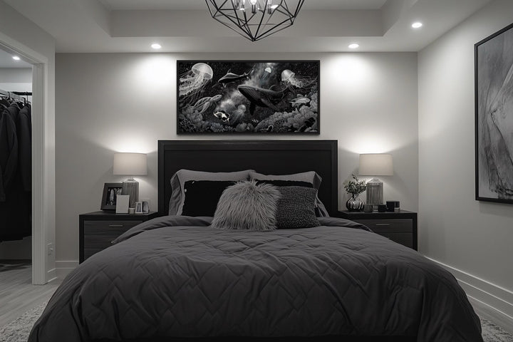 Der kräftige Stil dieses Leinwandbilds mit der schwarz-weißen Unterwasser-Ozeanszene eignet sich besonders für moderne Wohnungen, urbane Lofts oder zeitgenössische Männerhöhlen. In modernen Interieurs harmoniert die monochrome Farbpalette nahtlos mit minimalistischen Möbeln, klaren Linien und neutralen Tönen und setzt einen markanten Akzent, ohne den Raum zu überladen. In urbanen Lofts verleiht das Kunstwerk Tiefe und Faszination und ergänzt mit seinen kräftigen Grautönen Sichtmauerwerk, industrielle Texturen und metallische Akzente. In einer Männerhöhle setzt dieses schwarz-weiße Gemälde mit der Unterwasser-Ozeanszene einen eindrucksvollen Blickfang und verbindet raue Energie mit künstlerischer Raffinesse. Das Meeresleben-Thema spricht auch Meeresliebhaber, Taucher und alle an, die das Geheimnis des Meeres in ihr Zuhause holen möchten. Das Werk passt besonders gut über Sofas, Betten oder Kaminsimse, wo seine Größe und sein Kontrast sofort die Aufmerksamkeit auf sich ziehen. Seine abstrakte Qualität ermöglicht es ihm, sowohl minimalistische als auch eklektische Einrichtung zu ergänzen und verleiht Raffinesse, ohne den Raum zu überladen. Die monochromen Töne machen es vielseitig in schwarz-, grau- und weiß gehaltenen Räumen einsetzbar und heben sich gleichzeitig von kräftig farbigen Wänden ab. Dieses Leinwandbild ist sowohl dramatisch als auch vielseitig und eignet sich für Räume, die modernen Stil und starken Ausdruck zelebrieren. Mit seiner Kombination aus Meeresmotiven und markantem monochromen Design ist dieses schwarz-weiße Leinwandbild mit Unterwasserszene die ideale Ergänzung für moderne Wohnräume.