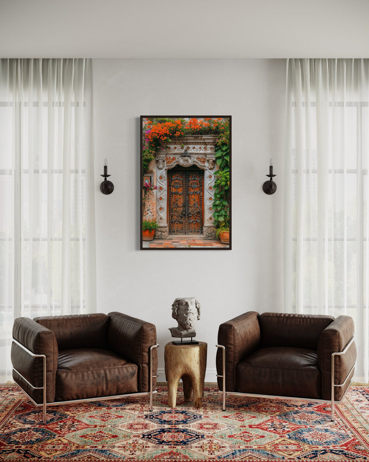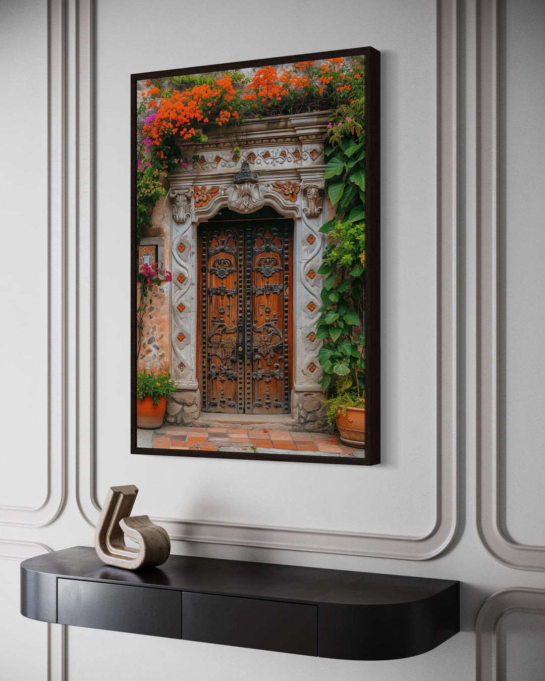Unser farbenfrohes mexikanisches Türgemälde auf Leinwand fängt den lebendigen Charme der traditionellen mexikanischen Architektur ein. Dieses bezaubernde Stück zeigt eine rustikale Holztür, die mit komplizierten Schnitzereien verziert und von lebhaften Rot-, Orange- und Blautönen umrahmt ist. Die Liebe zum Detail in den verwitterten Texturen und kräftigen Farben haucht dem Kunstwerk Leben ein und macht es zu einer Feier des reichen kulturellen Erbes Mexikos. Seine dynamische Komposition lädt Sie ein, sich die Geschichten hinter der Tür vorzustellen, und erzeugt ein Gefühl von Faszination und Wärme. Die lebensechten Pinselstriche sorgen für eine einzigartige Tiefe, als ob die Tür bereit wäre, Sie in eine lebhafte mexikanische Straße zu versetzen. Dieses atemberaubende Wandbild ist ideal für diejenigen, die kulturelle Kunst schätzen und ihrem Raum einen Hauch von Tradition verleihen möchten. Perfekt gerahmt dient es als eleganter Blickfang, der jeden Raum aufwertet. Lassen Sie dieses mexikanische Türgemälde auf Leinwand Ihrem Zuhause Wärme und Persönlichkeit verleihen.