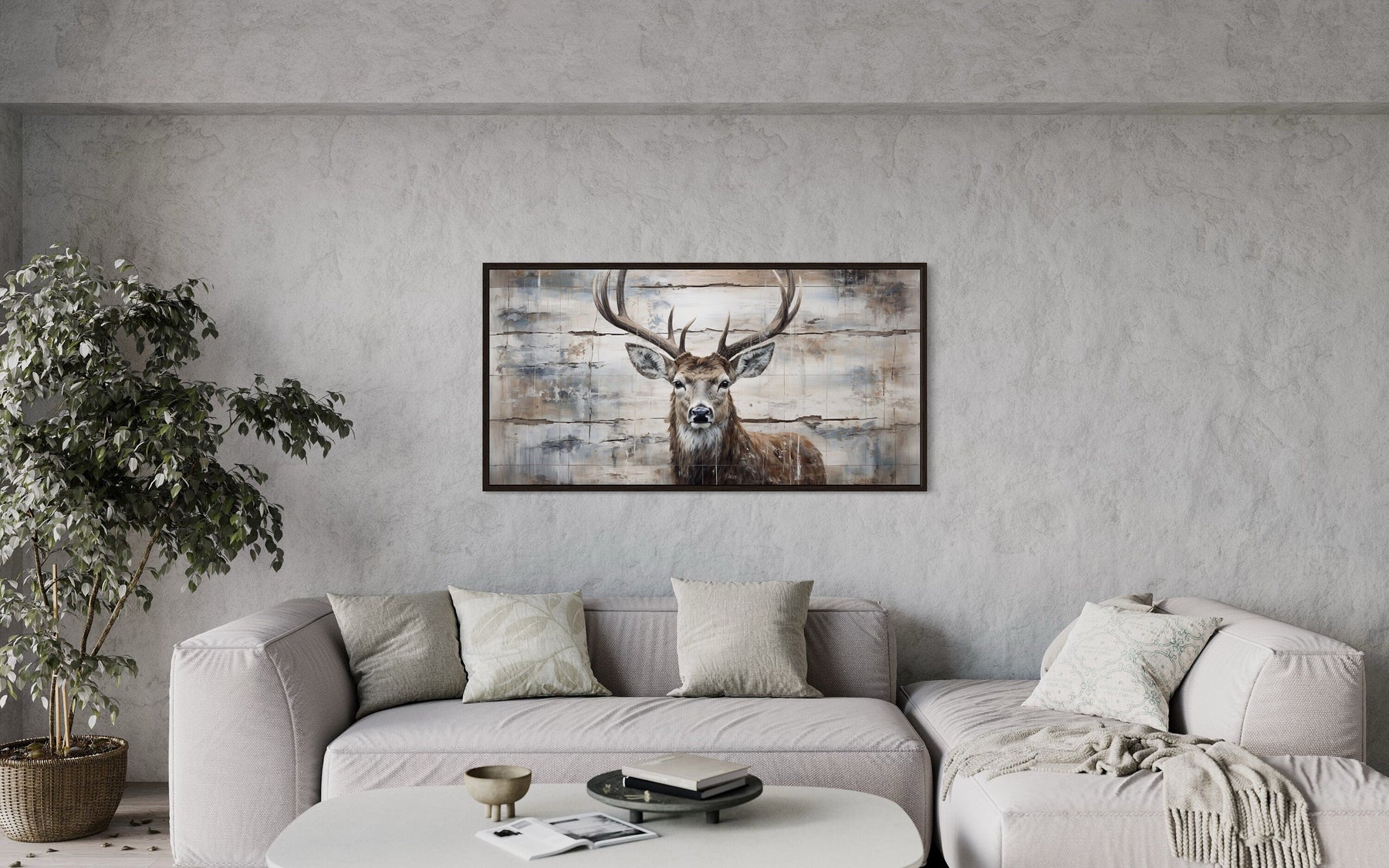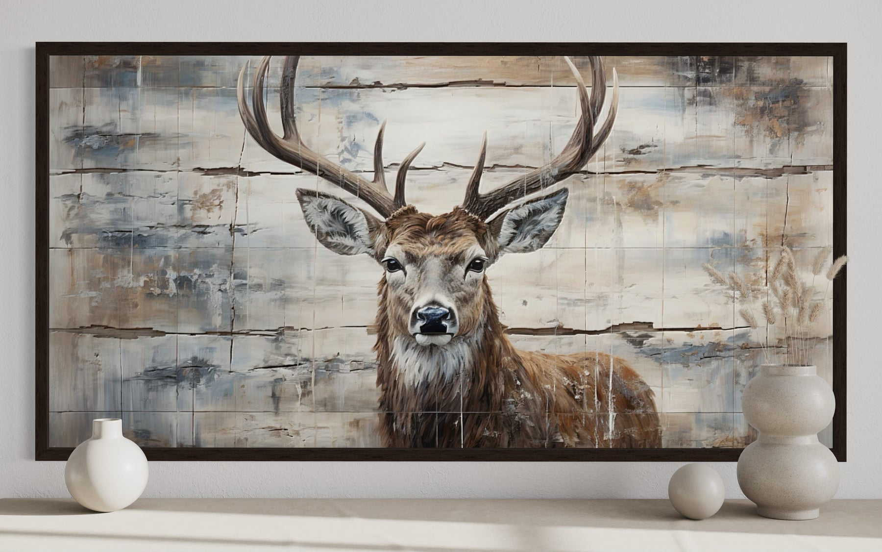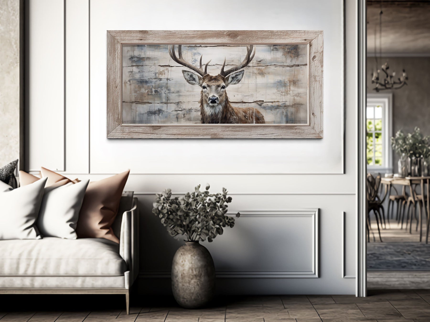 Die Farbpalette dieses Das rustikale Hirschgemälde verwendet sanfte, natürliche Töne, die das Gefühl einer rustikalen Hütte im Wald hervorrufen. Braun- und Beigetöne dominieren und spiegeln das Fell des Hirsches und den Holzhintergrund wider, während subtile Grün- und Grautöne auf den umgebenden Wald hinweisen. Diese Auswahl erdiger Farben verleiht dem Raum eine warme, einladende Atmosphäre, perfekt für Räume, die gemütlich und entspannend sein sollen. Das Kunstwerk verwendet meisterhaft Licht und Schatten, um Tiefe zu erzeugen und das realistische Erscheinungsbild des Hirsches und den strukturierten Effekt der Holzpaneele zu verbessern.