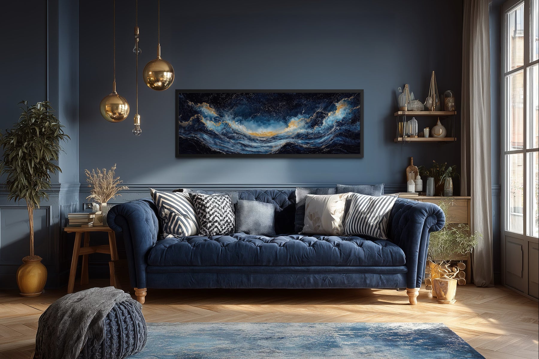 Dieses marineblaue und goldene Wandbild mit Meereswellen eignet sich perfekt für küstennahe Innenräume oder moderne Räume, in denen raffinierte Schlichtheit geschätzt wird. Es ist ideal für Schlafzimmer mit einem ruhigen Strandthema oder Wohnzimmer, die einen anspruchsvollen Blickfang suchen, und fügt sich mühelos in Räume mit hellen oder dunklen Farbschemata ein. Das lange horizontale Format macht es zu einer ausgezeichneten Wahl für die Platzierung über Betten, Sofas oder Konsolen, wo es ein Gefühl von Ausgewogenheit und Harmonie erzeugen kann. Häuser mit minimalistischem oder nautischem Dekor profitieren von den klaren Linien und dem ruhigen Thema des Kunstwerks, während diejenigen mit luxuriösen Akzenten die Goldtöne zu schätzen wissen. Dieser gerahmte Leinwanddruck ergänzt auch Räume mit natürlichen Elementen wie Holz oder Stein und verstärkt die Verbindung zum Meer. Ob in einer modernen Wohnung oder einem gemütlichen Rückzugsort an der Küste, dieses Gemälde mit Meereswellen verwandelt Ihren Raum in ein ruhiges und stilvolles Refugium. Vervollständigen Sie Ihre Einrichtung mit diesem auffälligen marineblauen und goldenen Wandbild.