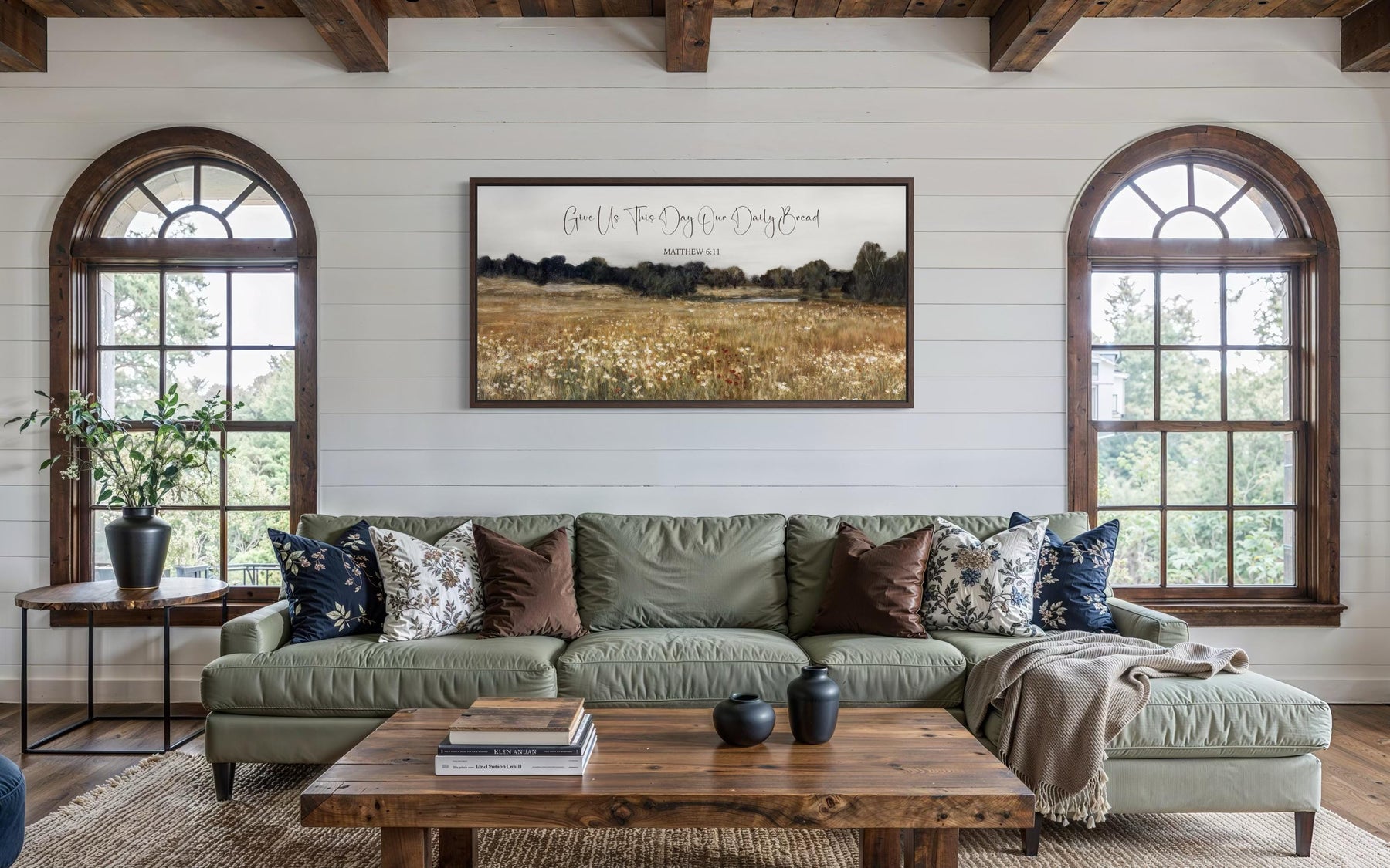 Framed landscape wall art with Matthew 6:11 scripture above a cozy, neutral-toned living room sofa.