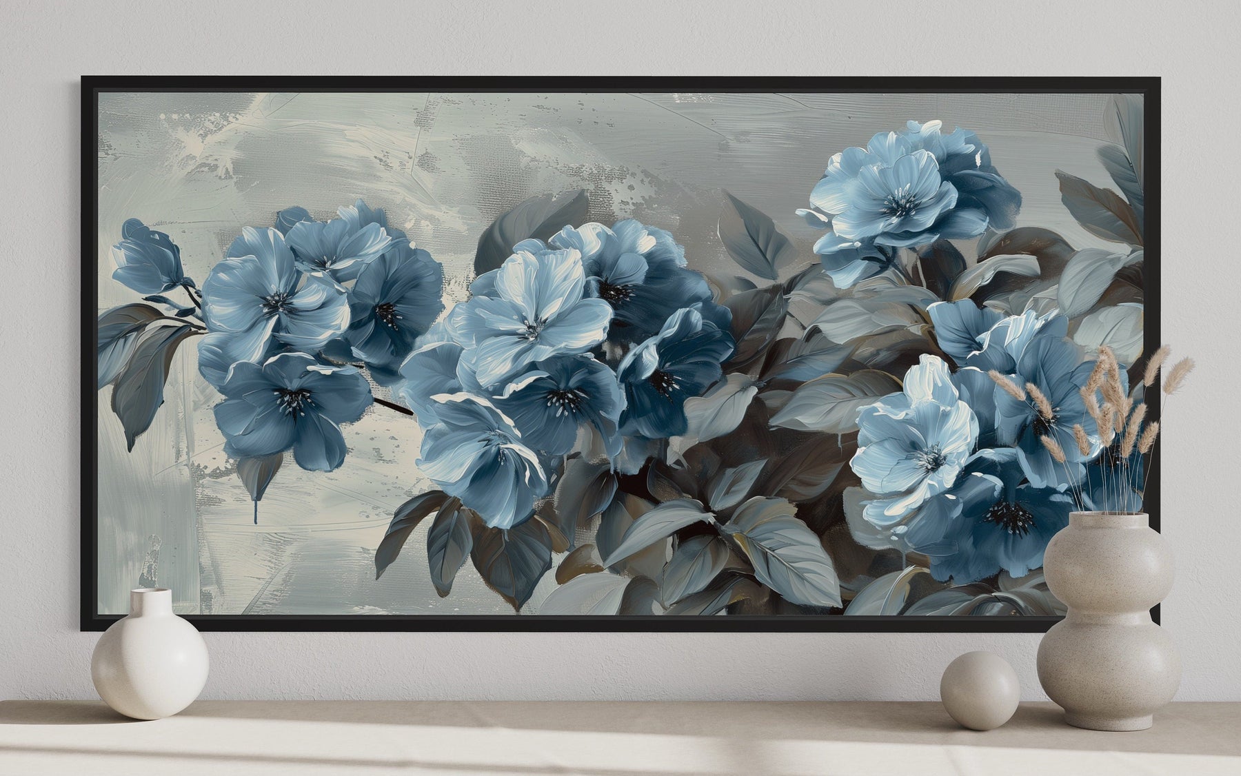 Verwandeln Sie Ihren Raum mit diesem eleganten hellblauen abstrakten Blumengemälde auf grauer Leinwand, das perfekt geeignet ist, um Ihrer Inneneinrichtung eine moderne Note zu verleihen. Dieser große Leinwanddruck zeigt zarte Blumendesigns in beruhigenden Blautönen vor einem neutralen grauen Hintergrund, wodurch eine harmonische Farbmischung entsteht. Die abstrakte Natur der Blumen verleiht ein zeitgenössisches Flair und macht dieses Kunstwerk zu einem atemberaubenden Blickfang für jedes Wohnzimmer oder Schlafzimmer. Die heitere Farbpalette und die künstlerische Komposition machen dieses Stück ideal für Räume, die einen Hauch von Ruhe und Eleganz brauchen. Egal, ob Sie Ihr Zuhause renovieren oder nach einem Statement-Stück suchen, dieses hellblaue abstrakte Blumenkunstwerk bietet eine schöne Balance aus modernem Design und künstlerischem Ausdruck. Dieses Stück ist fertig zum Aufhängen und verbessert mit seiner raffinierten Ästhetik mühelos die Atmosphäre Ihres Zuhauses.