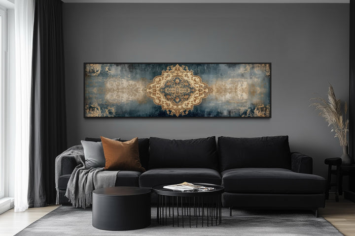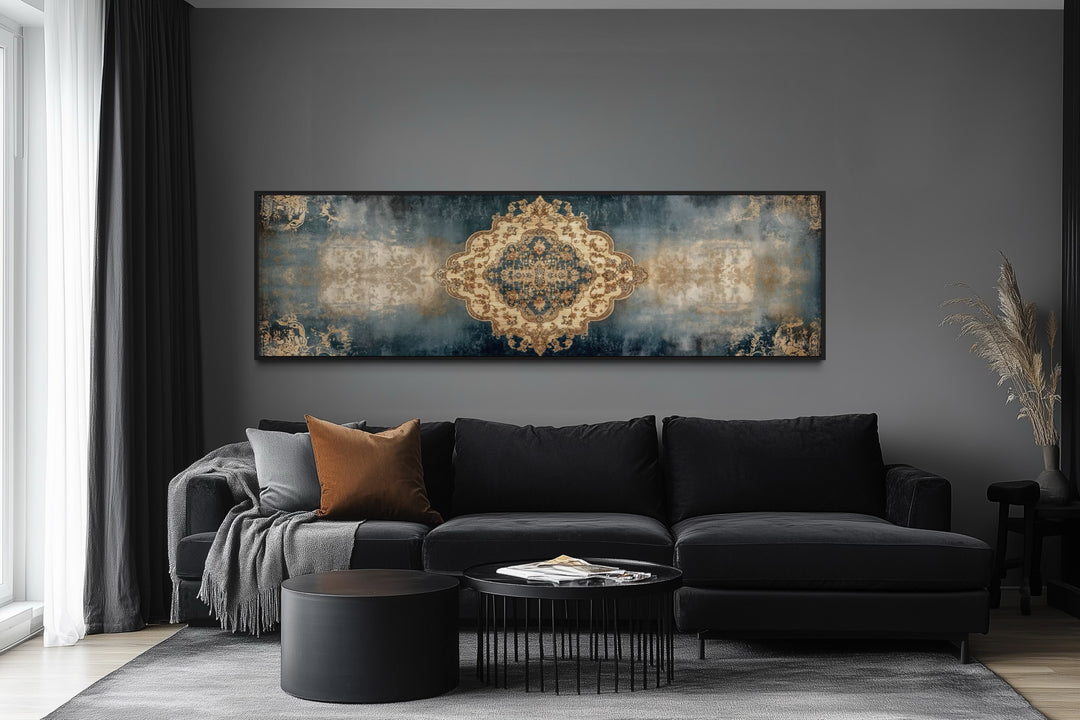 Unser langer, horizontaler, blau-beiger Perserteppich-Leinwanddruck ist eine zeitlose Verbindung von antikem Charme und moderner Präsentation und bringt die Eleganz von Vintage-Textilmustern als raffiniertes Statement in Ihr Zuhause. Der horizontale Druck imitiert das Layout und den Stil eines authentischen Perserteppichs und besticht durch ein detailreiches zentrales Medaillon, das durch filigrane Blumenmotive und symmetrische Ränder auf beiden Seiten abgerundet wird. Das Leinwandformat verwandelt traditionelles Webdesign in ein optisches Herzstück, das zugleich klassisch und klar wirkt – perfekt für alle, die traditionelle Ästhetik ohne echten Stoff oder Fransen schätzen. Das Muster wird von sanft verwitterten Kanten eingerahmt, die Tiefe und Charakter verleihen und dem Stück die abgenutzte Schönheit eines geliebten Erbstücks verleihen. Das breite Seitenverhältnis zieht den Blick über die gesamte Wand und macht es zum idealen Stück für eine großzügige horizontale Platzierung – über einem Sofa, einem Bett oder einem langen Konsolentisch. Dies ist kein lautes oder auffälliges Design, sondern eines, das mit ruhiger Raffinesse, reich an Geschichte und subtiler Komplexität besticht. Aus der Ferne wirkt die Gesamtkomposition ruhig und ausgewogen; aus der Nähe bieten die vielschichtigen Motive und verblassten Texturen ein faszinierendes Bild. Sie ist perfekt für alle, die eine Inneneinrichtung schätzen, die Tradition ehrt und gleichzeitig gepflegt und bewusst wirkt. Unser langer, horizontaler Leinwanddruck mit einem blau-beigen Perserteppich verleiht modernen Wänden eine altmodische Note.