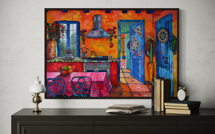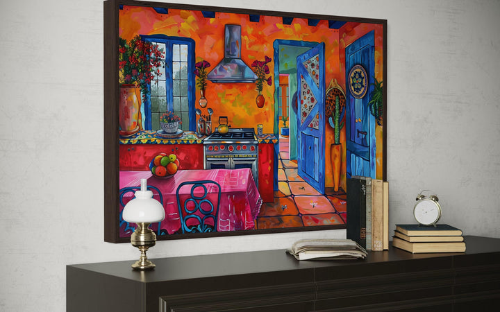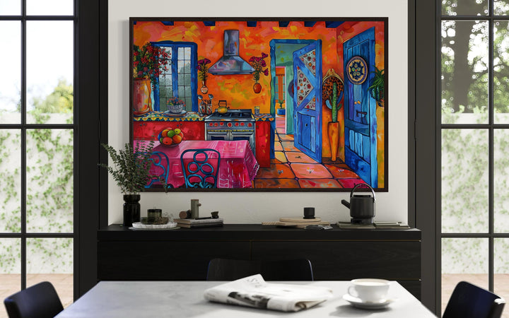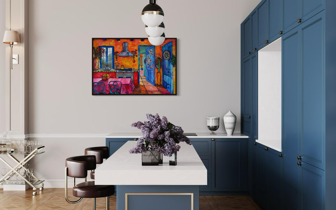Unsere gerahmten mexikanischen Küchenkunstwerke sind eine atemberaubende Ergänzung für rustikale, böhmische und traditionelle mexikanische Inneneinrichtungen. Dieses lebendige Gemälde verstärkt die lebendige Atmosphäre einer Küche und ergänzt farbenfrohes Geschirr, handgefertigte Fliesen und Holzakzente. Ein Esszimmer profitiert von der kräftigen, ausdrucksstarken Energie des Kunstwerks, das es zum perfekten Blickfang über einem Tisch macht. In einer gemütlichen Frühstücksecke verleiht dieses Kunstwerk Persönlichkeit und Wärme und schafft eine einladende und fröhliche Atmosphäre. Das horizontale Format ermöglicht es, es nahtlos in offene Wände einzufügen, wodurch seine visuelle Wirkung maximiert und gleichzeitig die Balance gewahrt wird. Die helle, handgefertigte Ästhetik passt wunderbar zu Terrakotta-Töpfen, schmiedeeisernen Details und gewebten Textilien. Ob in einem Haus im südwestlichen Stil, einer von einer Hacienda inspirierten Umgebung oder einem modernen Raum, der nach einem kulturellen Akzent sucht, dieses Gemälde fällt wunderschön auf. Unsere gerahmten mexikanischen Küchenkunstwerke verwandeln jeden Raum in eine Feier von Tradition, Kunstfertigkeit und festlichem Charme.