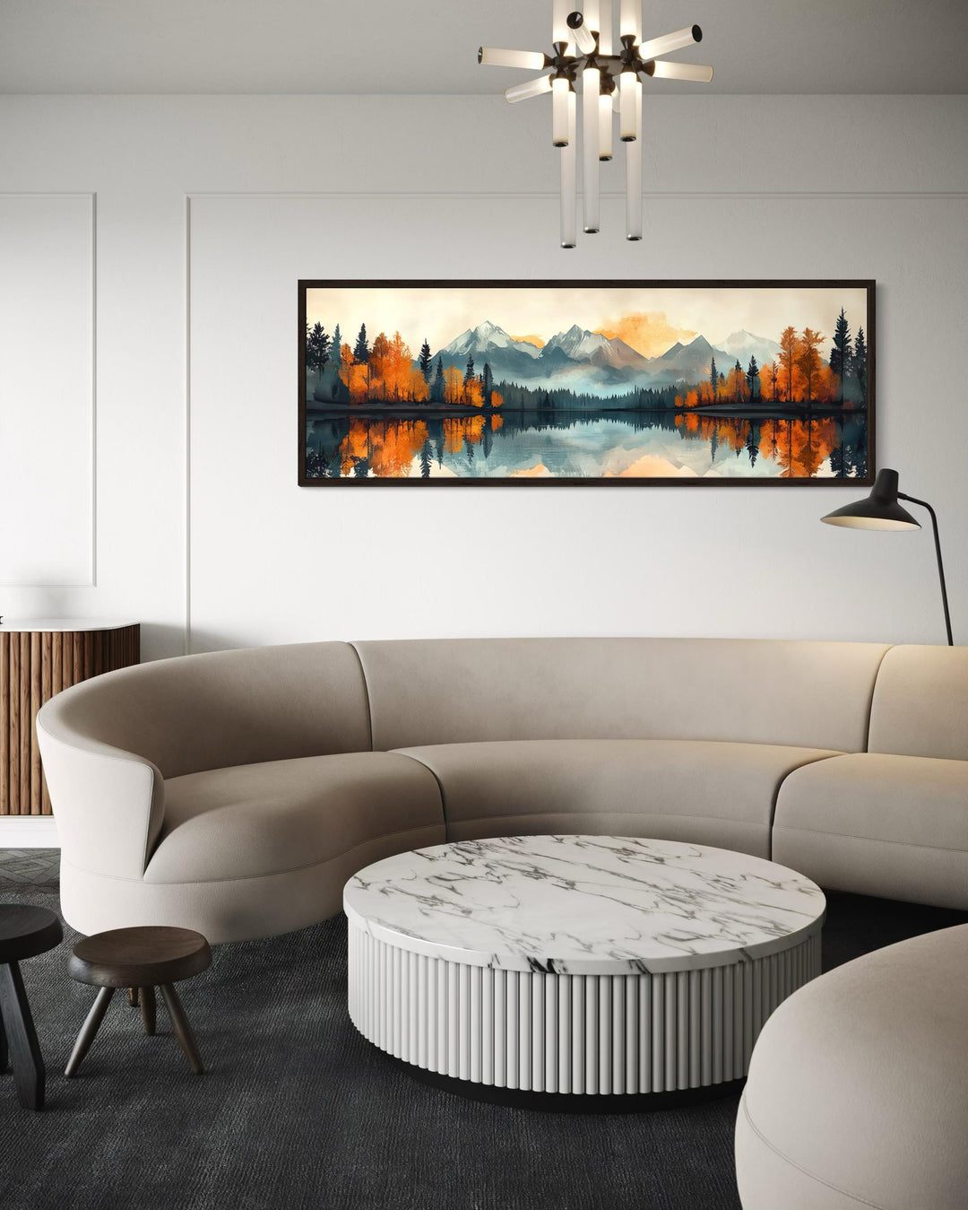 Unser Mid-Century Modern Seelandschafts-Wandbild fängt Stille und Symmetrie mit lebendigem Twist ein und ist mit gestochen scharfen Details und kräftigen Spiegelungen auf Leinwand gedruckt. Die Szene zeigt einen spiegelglatten See, in dem sich eine Reihe stilisierter Berge aus der Mitte des Jahrhunderts spiegelt, wobei der Horizont das Bild sauber in zwei Hälften teilt. Auf der einen Seite erheben sich geometrische Gipfel in Anthrazit-, Umbra- und Blaugrüntönen, während sich ihre Spiegelung darunter sanft in feurige Orange- und Dunkelrottöne verwandelt. Der Spiegeleffekt des Sees sorgt für Harmonie und Ausgewogenheit und unterstreicht die modernistische Liebe zu klarer Form und Dualität. Bäume in warmen Herbstfarben säumen die Ränder und bieten gerade genug natürliche Weichheit, um den kräftigen architektonischen Fluss zu kontrastieren. Jedes Element der Landschaft ist im Stil der Mid-Century-Ästhetik gehalten, wird jedoch durch natürliche Motive und stimmungsvolles Licht gemildert. Die Szene wirkt naturverbunden und zugleich gestalterisch gestaltet – zielgerichtet, strukturiert und emotional. Bei diesem Werk geht es nicht nur um Schönheit, sondern um Rhythmus, Linie und visuelle Ruhe. Unsere Wandkunst im Mid-Century-Modern-Stil mit Seelandschaft bringt Ausgewogenheit und Klarheit in den Raum und mündet in der ruhigen Kühnheit der Wandkunst im Mid-Century-Modern-Stil mit Seelandschaft.