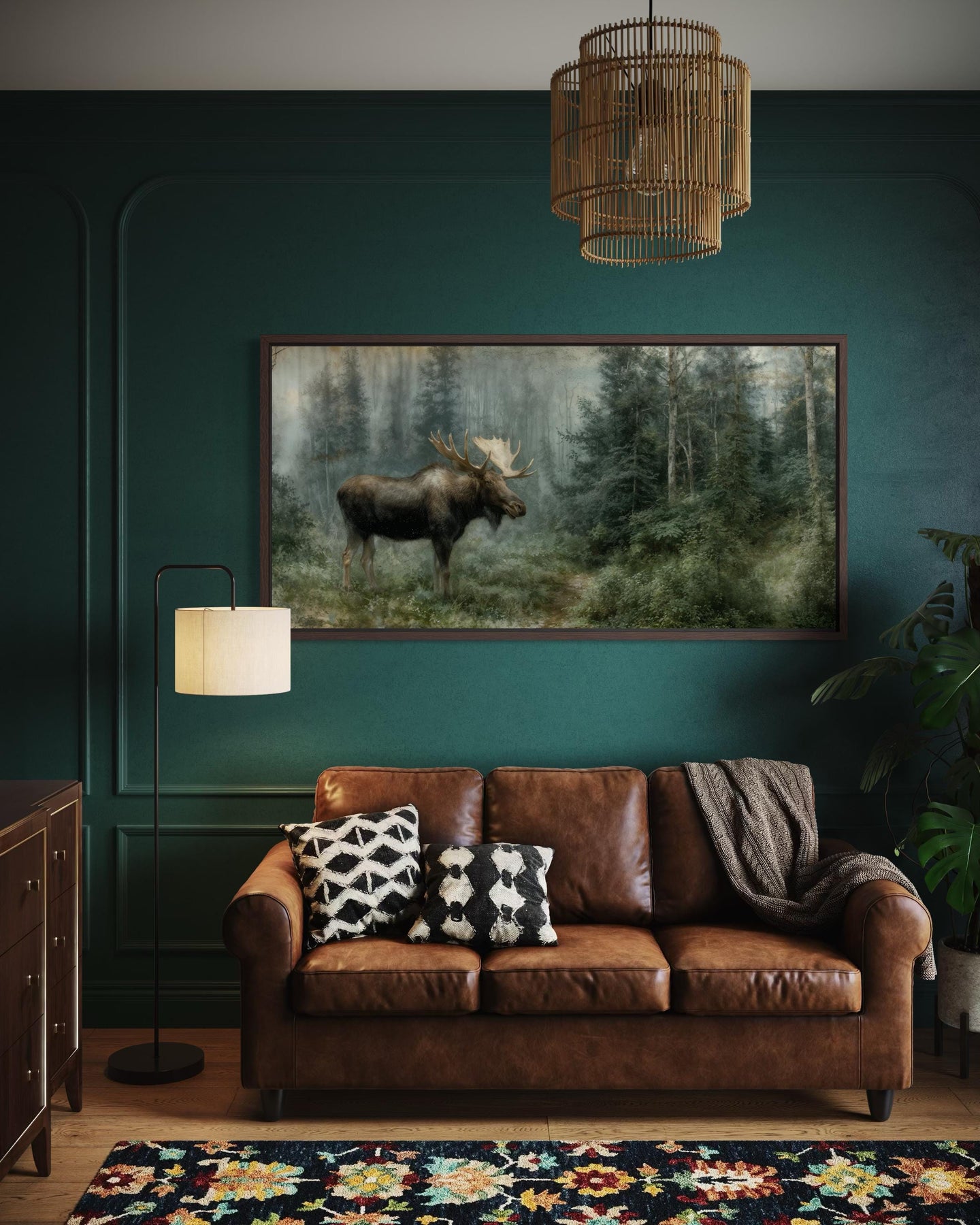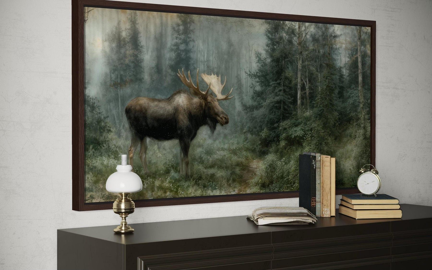 Die Palette dieses Elchgemäldes ist tief, stimmungsvoll und reich an Naturalismus. Dunkle Waldgrüntöne dominieren den Hintergrund, das dichte Kieferndach bildet eine Wand aus kühler, schattiger Farbe, die wunderschön in die neblige Ferne zurückweicht. Der Nebel selbst bringt sanfte Grau- und Blauweiß-Töne mit sich, die durch die Bäume ziehen und dem Mittelgrund eine ätherische, atmosphärische Qualität verleihen. Das Fell des Elchs ist ein tiefes, warmes Braun – in den Schatten fast schwarz, aufgehellt zu sattem Schokolade und Bernstein, wo das Licht seine Flanken und sein Geweih trifft. Erdige Töne von Moos, Rinde und Waldboden ziehen sich durch den unteren Teil der Komposition und verankern die Szene in den Texturen echter Wildnis. Es gibt Momente kühlen, gedämpften Himmels, der in sanften Graublau-Tönen durch das Baumdach schimmert und Leichtigkeit hinzufügt, ohne die stimmungsvolle, bewaldete Atmosphäre zu stören. Die Gesamtpalette ist dunkel, erdig und zutiefst maskulin – eine Farbgeschichte, die aus den tatsächlichen Tönen der Wildnis und nicht aus einer Dekorateur-Palette entstanden ist. Es ist eine stimmungsvolle, immersive Kombination, die sich in Räumen, die tiefe, satte, natürliche Farben bevorzugen, völlig zu Hause fühlt. Nichts hier ist hell oder künstlich – jeder Ton wirkt verdient und echt. Das Farbschema dieser Elch-Wanddekoration ist so ehrlich und kompromisslos wie das Motiv selbst.