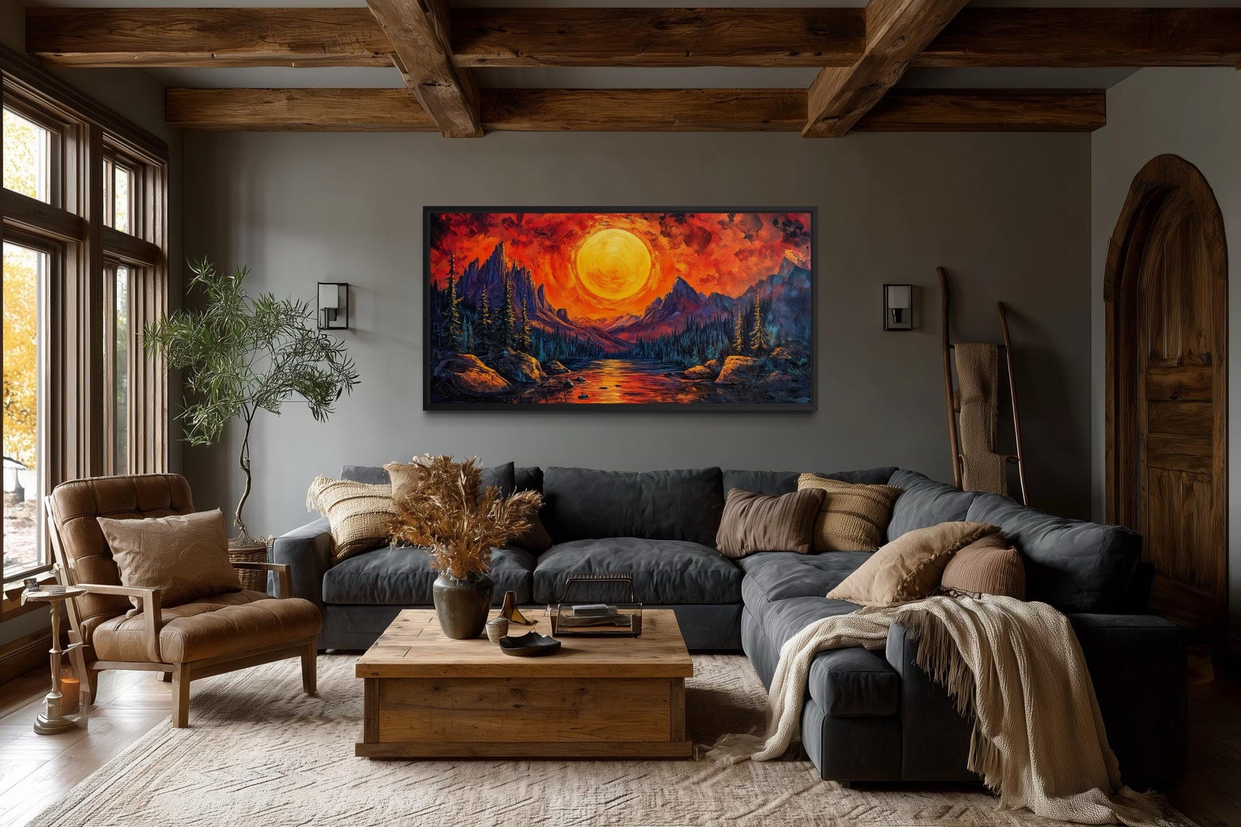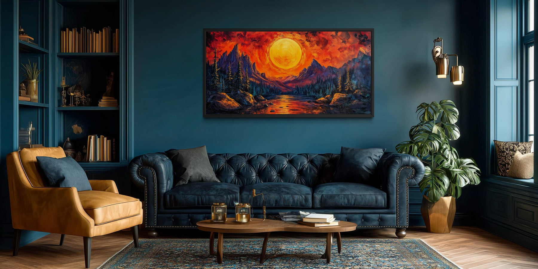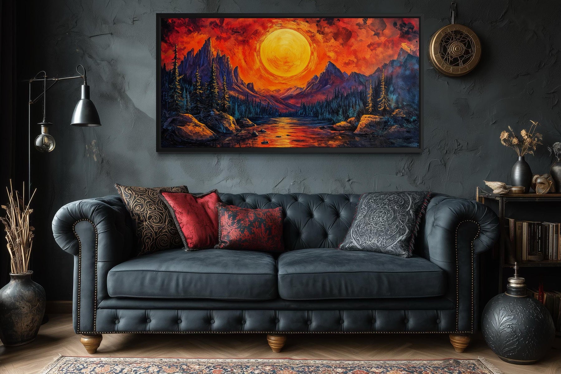 Dieses Kunstwerk wurde speziell für moderne Wohnzimmer und maskuline Lounge-Bereiche geschaffen, in denen ein markanter Panorama-Fokus die gesamte Atmosphäre des Raumes prägt. Über einem dunklen Sofa oder einer eleganten Medienwand wird die leuchtende Landschaft zum zentralen Blickfang und verwandelt den Raum in eine Galerie. Die intensive Farbpalette harmoniert perfekt mit Interieurs, die sich durch anthrazitfarbene Wände, Ledersessel, Metallelemente und gedämpftes Umgebungslicht auszeichnen. Dieses Wandbild mit einem feurigen Sonnenuntergang über einem Bergsee ist ideal für Räume, die eher für gesellige Abende, angeregte Gespräche und ein ausdrucksstarkes Dekor als für einen sanften, minimalistischen Stil konzipiert sind. Die Panoramagröße füllt große Wände souverän aus und macht mehrere kleinere Bilder überflüssig. Sein ausdrucksstarker Stil ergänzt zeitgenössische Interieurs, die Kunst als dominantes Gestaltungselement einsetzen. Der Kontrast zwischen warmen und kühlen Tönen verleiht Räumen mit dunkleren Farbschemata Tiefe. Die leuchtende Spiegelung im Wasser verstärkt die Atmosphäre und lässt den Raum selbst bei schwachem Licht dynamisch wirken. Das Kunstwerk wird zum Blickfang, zieht sofort die Aufmerksamkeit auf sich und setzt die emotionale Stimmung. Der Gesamteindruck ist einer von Energie, Dramatik und moderner Raffinesse, der durch das Leinwandbild „Feuriger Sonnenuntergang am Bergsee“ zum Ausdruck kommt.