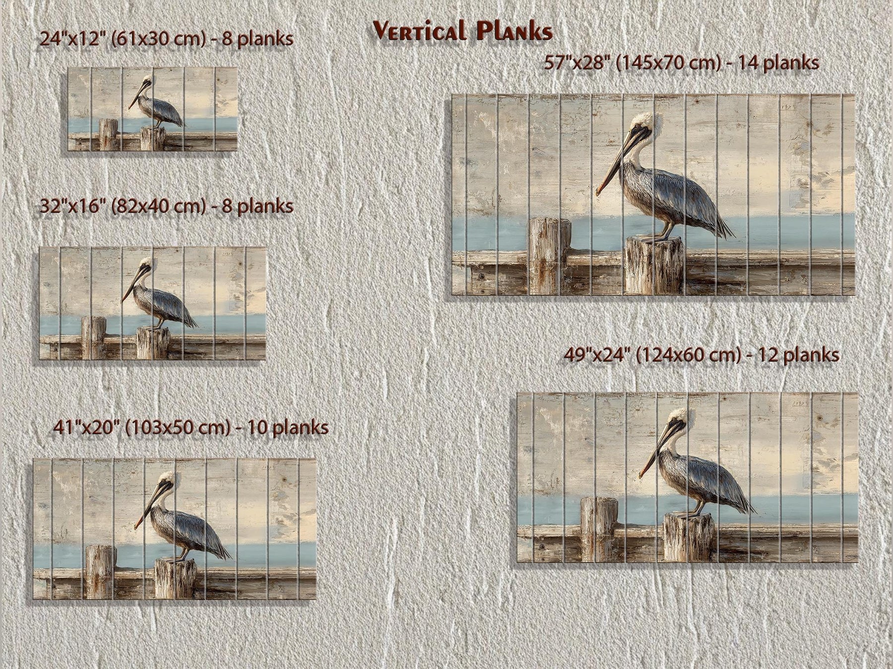 Unsere Distressed-Holz-Wandkunst „Pelikan steht auf Holzsteg“ ist ein Druck auf Echtholz, der einen ruhigen Küstenmoment mit einem einzelnen Pelikan einfängt, der still auf einem verwitterten Steg sitzt und auf das Wasser blickt. Die Komposition ist einfach und ausgewogen, der Pelikan ist leicht außermittig platziert, um ein natürliches Gefühl von Raum und Stille in der Szene zu erzeugen. Der Steg erstreckt sich horizontal, seine gealterten Planken verleihen Charakter und unterstreichen die entspannte Küstenatmosphäre. Der Hintergrund zeigt weiches Wasser und einen fernen Horizont, was dem Kunstwerk ein offenes und luftiges Gefühl ohne unnötige Details verleiht. Der Pelikan selbst ist mit subtilem Realismus dargestellt, seine Haltung ist ruhig und aufmerksam, was zum friedlichen Ton des Stücks beiträgt. Die Distressed-Holz-Wandkunst-Oberfläche lässt die natürliche Holzmaserung durch das Bild scheinen und verleiht Wärme und einen leicht abgenutzten Look, der das Küstenthema unterstreicht. Die Textur ist Teil des Druckstils und vermittelt den Eindruck von Alter, während das Holz selbst solide und neu bleibt. Der Gesamtstil tendiert zu rustikal-küstennah und kombiniert Einfachheit mit natürlichen Elementen, die sich leicht und entspannt anfühlen. Diese Distressed-Holz-Wanddekoration „Pelikan steht auf Holzsteg“ wirkt geerdet und authentisch, nicht übermäßig stilisiert oder künstlich. Die Szene fängt einen ruhigen Moment am Wasser ein und wirkt dadurch natürlich und einladend. Die Komposition ist klar und aufgeräumt, sodass das Motiv und die Umgebung klar zur Geltung kommen. Distressed-Holz-Wandkunst „Pelikan steht auf Holzsteg“.