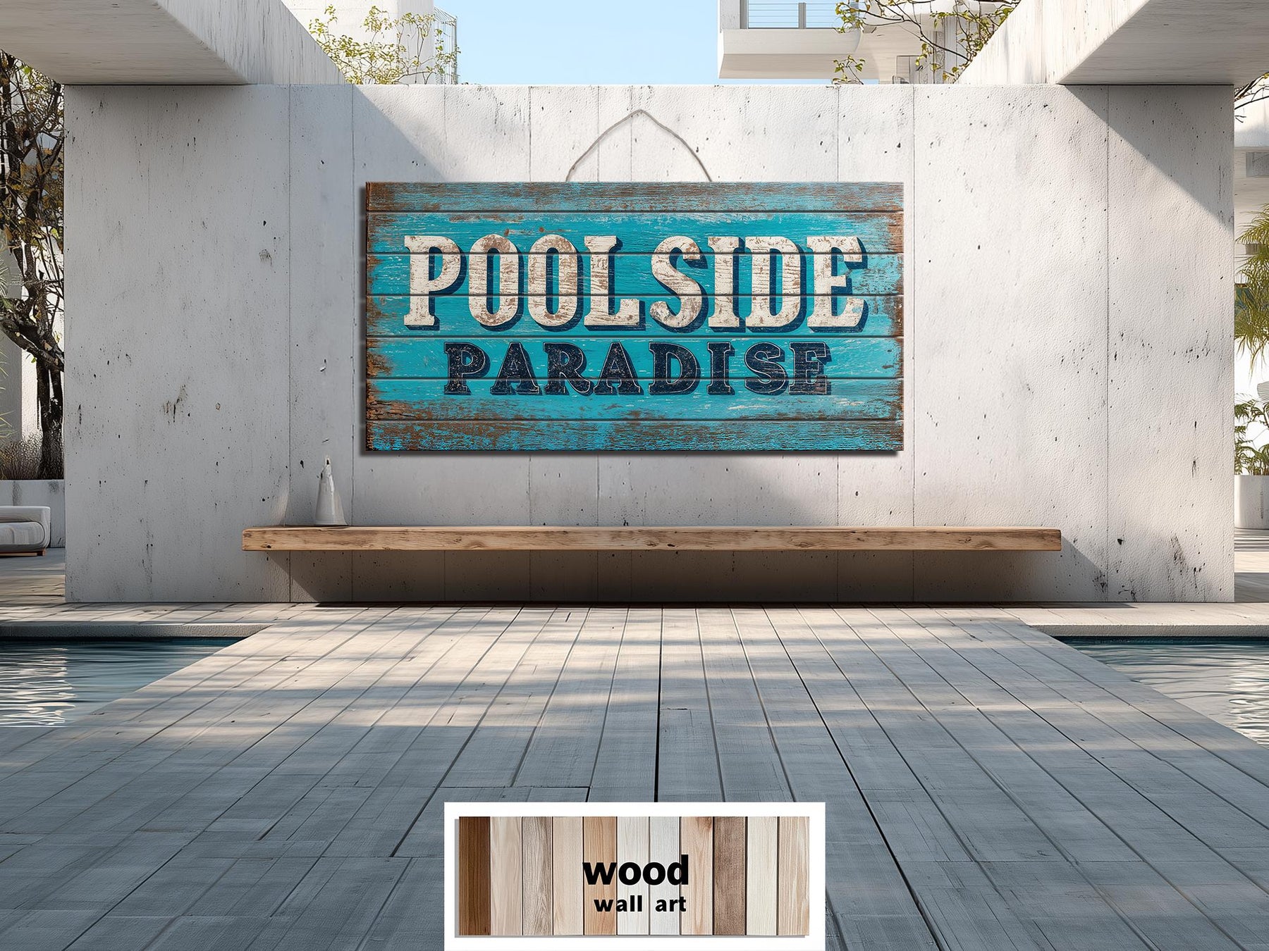 Unser Wandbild „Poolschild“ aus Holz im Used-Look ist ein lebendiges, rustikales Terrassenschild, das direkt auf echte Holzplanken gedruckt wird. Das Motiv erhält dadurch einen verwitterten Effekt, während das Holz selbst neu, massiv und stabil bleibt. Das Design präsentiert den markanten Schriftzug „Poolside Paradise“ im Vintage-Stil in leuchtendem Türkis und klarem Weiß und schafft so sofort eine entspannte Resort-Atmosphäre am Wasser. Die natürlichen, vertikalen Fugen der Planken bleiben durch das Bild sichtbar und verleihen dem Schild eine authentische Textur und unterstreichen seinen handgefertigten Charakter. Die Used-Optik wird nur auf den Druck angewendet und erzeugt einen sonnengebleichten, gealterten Look, ohne die saubere, frische Oberfläche des Holzes zu beeinträchtigen. Dezente Schattierungen um die Schriftzüge herum sorgen für Tiefe und gute Lesbarkeit auch bei hellem Tageslicht. Das längliche, horizontale Format sorgt für eine ausgewogene Komposition und lässt das Schild wie einen klassischen Strandpromenadenfund wirken. Sein Retro-Küstenstil verbindet nostalgischen Charme mit moderner Fertigungsqualität und macht es so dekorativ und langlebig. Die leicht abgenutzten Farbdetails wecken Erinnerungen an vergangene Sommertage, während der neue Holzsockel für Stabilität und Langlebigkeit sorgt. Jedes Element ist darauf ausgelegt, vom ersten Moment an Urlaubsstimmung zu verbreiten. Schaffen Sie mit diesem Wandbild aus Altholz mit Pool-Motiv die richtige Atmosphäre für Entspannung im Freien.