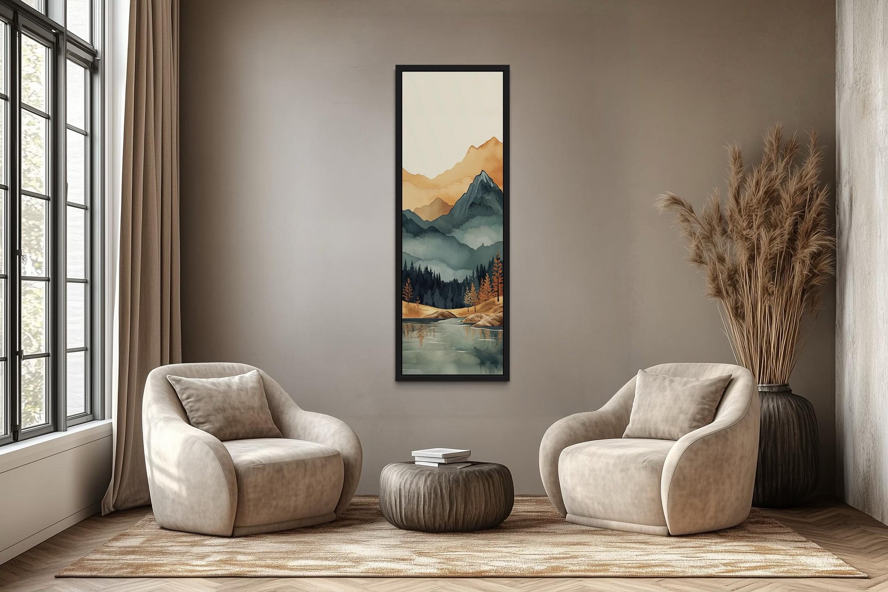 Dieses Berglandschaft-Leinwandbild passt hervorragend zu rustikalen Hütten, Berghütten und modernen minimalistischen Häusern gleichermaßen. In rustikalen Innenräumen harmoniert es mühelos mit Holztönen, Steinakzenten und Ledermöbeln und verleiht dem Raum Wärme und Authentizität. In modernen oder skandinavisch inspirierten Räumen bringen die gedeckten Farben und das klare Hochformat Textur und Ruhe, ohne das minimalistische Gleichgewicht zu stören. Die hohe Form macht es perfekt für schmale Wände und erzeugt die Illusion von größerer Höhe und Offenheit. Seine ruhige Präsenz ergänzt neutrale Paletten und organische Materialien wie Leinen, Jute und Naturholz. In Wohnräumen im Landhausstil verleiht dieses vertikale Landschaftsbild einen raffinierten rustikalen Charme, der sich sowohl gemütlich als auch elegant anfühlt. In Rückzugsorten am See oder Schlafzimmern mit Naturthema spiegelt es die Ruhe der Natur wider und fördert Entspannung und Harmonie. Die subtilen Farbtöne fügen sich nahtlos in warme Weiß-, Beige- und sanfte Grüntöne ein und schaffen so Kohärenz über verschiedene Einrichtungsstile hinweg. Dieser vielseitige Berg-Leinwanddruck verbindet rustikalen Charme und modernes Design mit stiller Eleganz. Unser Berglandschaft-Wandbild bringt Wärme, Ruhe und zeitlose Schönheit in das Herz des Hauses.