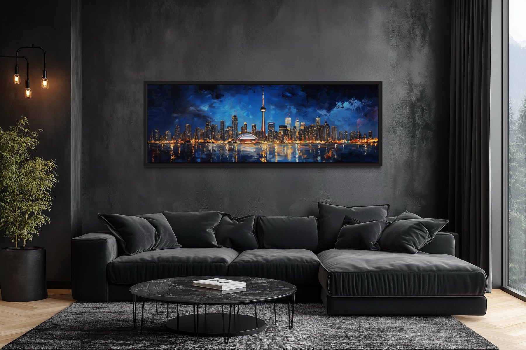 Dieser gerahmte Leinwanddruck der Toronto-Skyline ist ideal für moderne Wohnungen, Büros und zeitgenössische Räume, die Kunst mit starkem Charakter schätzen. In Wohnzimmern dient er als Blickfang über einem Sofa und zieht mit seiner breiten Panorama-Komposition die Aufmerksamkeit auf sich. Büros und Arbeitsräume profitieren von seiner urbanen Energie und passen perfekt zu Berufstätigen, die sich von der Stadt inspirieren lassen möchten. Seine horizontale Form eignet sich ideal für lange Wände, insbesondere über Schreibtischen, Sideboards oder Mediencentern. In Lofts und Apartments spiegelt er die Energie des Stadtlebens wider und verstärkt das Ambiente des modernen Großstadtlebens. Seine ausdrucksstarken Striche und sein nicht-fotorealistischer Stil machen ihn auch für vielseitige Wohnungen geeignet, die Kunst eher wegen ihrer Atmosphäre als wegen präziser Genauigkeit schätzen. In kreativen Studios wird er zu einer inspirierenden Kulisse, die Fantasie und Energie widerspiegelt. Die gerahmte Ausführung sorgt für ein edles Aussehen und ist sofort aufhängbereit, wodurch jedem Interieur ein perfekter Abschluss verliehen wird. Sein Design spricht besonders diejenigen an, die urbane Kunst als Ausdruck von Identität und Stolz schätzen. Dieses Leinwandbild der Toronto-Skyline ist sowohl stilvoll als auch ausdrucksstark und die perfekte Möglichkeit, Kanadas ikonische Stadt durch die Linse moderner Kunst zu feiern.