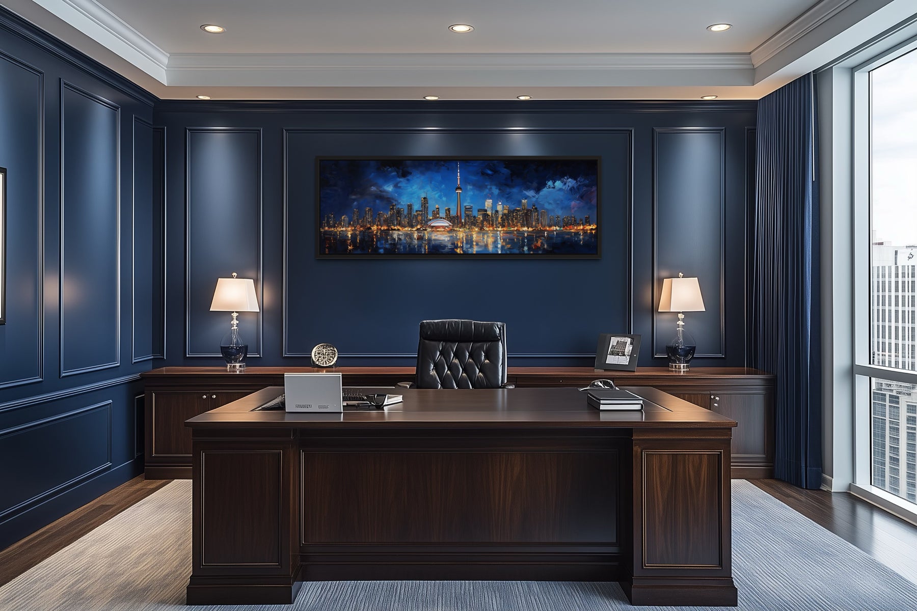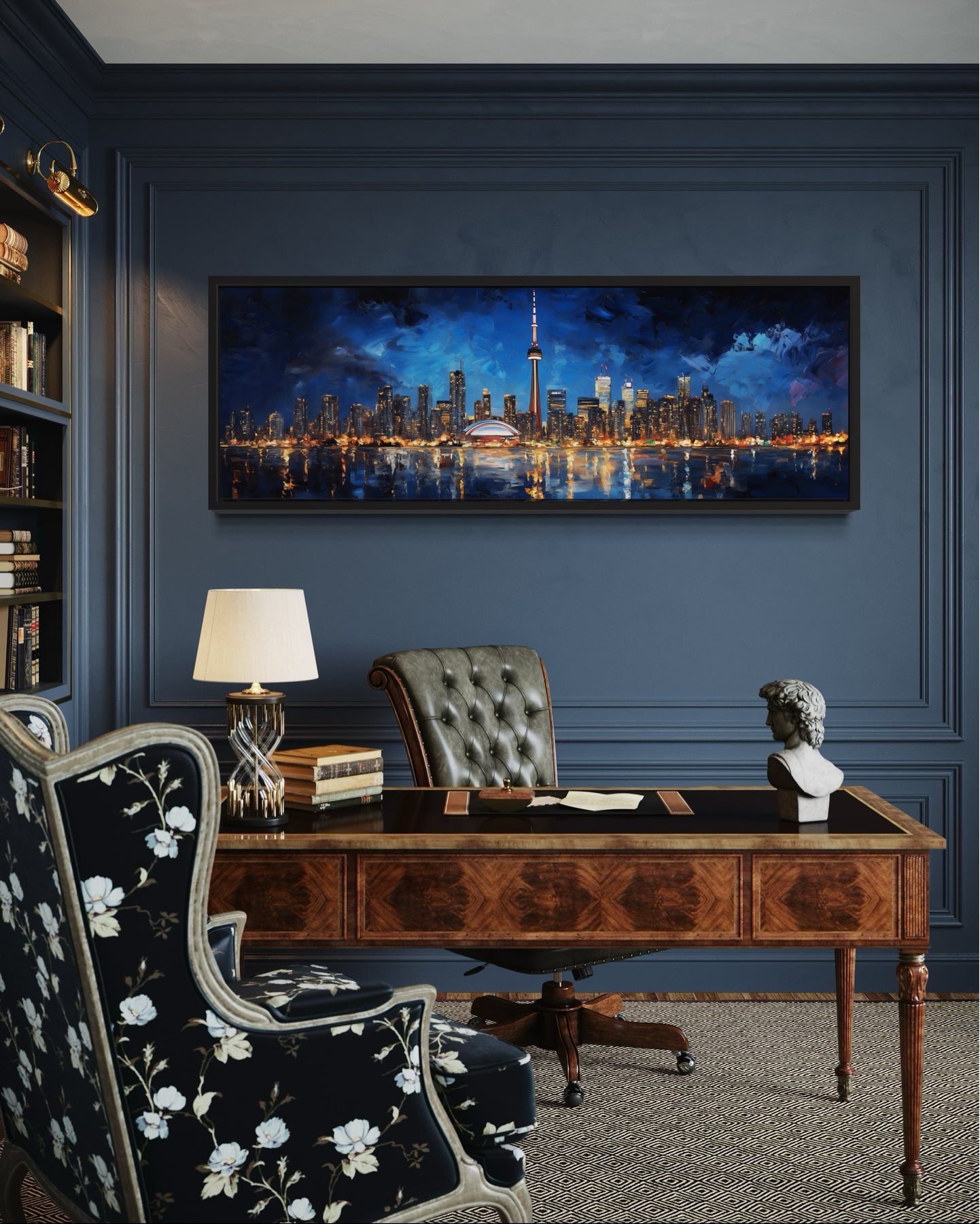 Die Farbpalette dieses Toronto-Stadtbild-Leinwandbildes setzt auf satte Blautöne, tiefes Indigo und kräftige Lichtakzente, wodurch eine dramatische nächtliche Stimmung entsteht. Der Himmel ist in schichtweisen Tönen von dunklem Marineblau und gedämpftem Violett gemalt, was den Eindruck einer stimmungsvollen Abendkulisse erweckt. Die Skyline leuchtet mit Spritzern aus hellem Gold, warmem Bernstein und klarem Weiß und ahmt die Stadtlichter nach, jedoch mit einer künstlerischen Weichheit, die ausdrucksstark wirkt. Andeutungen von Türkis und subtilen Violetttönen brechen in die Schatten ein und bringen Farbvariationen ein, die das Bild optisch ansprechend halten. Spiegelungen im Ontariosee spiegeln diese Töne wider, wenn auch weniger präzise, gemalt in lockeren, wellenförmigen Strichen aus Blau, Türkis und Grau. Schatten werden mit Kohle- und Schiefer-Tönen vertieft, wodurch die helleren Highlights durch starken Kontrast geerdet werden. Weiche, pinselartige Übergänge zwischen den Farben betonen die Textur und verleihen dem Gemälde eine handwerkliche und kreative Note. Die warmen Glühen gleichen sich mit dem kühlen Hintergrund aus und schaffen Spannung und Harmonie in der Stadtszene. Diese Mischung aus tiefen, stimmungsvollen Farbtönen mit hellen, ausdrucksstarken Highlights fängt die Energie Torontos ein, ohne feine, fotografische Details zu benötigen. Das Ergebnis ist ein Farbschema, das urban, modern und künstlerisch ist und perfekt für eine von der Stadt inspirierte Wanddekoration geeignet ist.