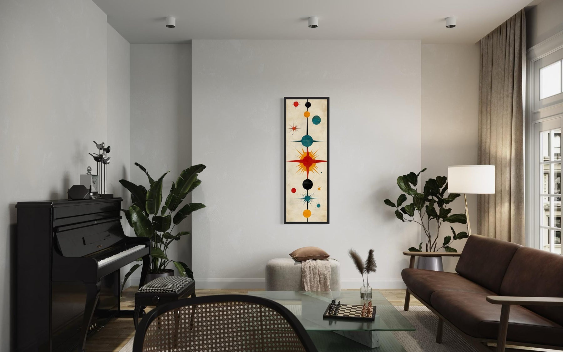 Dieses schmale, vertikale Wandbild im Mid-Century-Modern-Stil eignet sich besonders für ein Wohnzimmer im Mid-Century-Stil oder ein modernes Homeoffice, in dem klare Linien und Retro-Design bewusst zelebriert werden. In einem Wohnzimmer mit Nussbaum- oder Teakholzmöbeln, konischen Beinen, niedrigen Sitzmöbeln und geometrischen Teppichen ergänzt das hohe Format die architektonischen Linien des Raumes und setzt gleichzeitig einen markanten Blickfang. Zwischen zwei Sesseln oder neben einem hohen Fenster platziert, betont die schlanke, vertikale Komposition die Raumhöhe, ohne die Wand zu überladen. In einem modernen Büro mit geradlinigen Schreibtischen, offenen Regalen und skulpturalen Leuchten unterstreicht das Atommotiv Kreativität und einen zukunftsorientierten Stil. Das Kunstwerk harmoniert perfekt mit Ledersitzen, Messingakzenten und schwarzen Metalldetails, die typisch für Mid-Century-Interieurs sind. Dank seiner schmalen Proportionen ist es ideal für kleinere Wandabschnitte wie Eingangsbereiche, Säulen oder Nischen zwischen Einbauschränken, wo breitere Kunstwerke unproportioniert wirken würden. Die klare geometrische Struktur sorgt für ein aufgeräumtes Raumgefühl, während der lebendige Sterneneffekt für Energie sorgt. Dieses abstrakte Leinwandbild „Atomsternexplosion“ fügt sich nicht unauffällig in den Hintergrund ein, sondern verleiht jedem Raum eine selbstbewusste Retro-Präsenz. Es kommt in Interieurs, die Vintage-Einflüsse mit moderner Klarheit schätzen, besonders gut zur Geltung und ist ein herausragendes Beispiel für schmale, vertikale Leinwandbilder im Mid-Century-Modern-Stil, die sich nahtlos in ein durchdachtes Design einfügen.