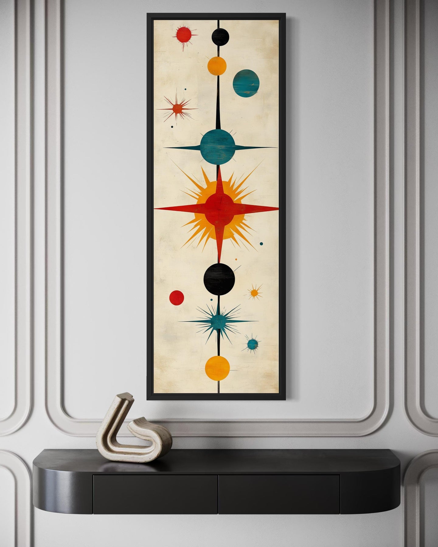 Unser schmales, vertikales Wandbild im Mid-Century-Modern-Stil ist ein raffinierter Leinwanddruck mit einer hohen, schlanken Komposition. Im Zentrum steht ein markanter, abstrakter Atomstern, der sich vor einem klaren weißen Hintergrund abhebt und so Höhe und Symmetrie betont. Der strahlende Stern explodiert in warmen Orange- und Rottönen und wird sofort zum Blickfang des Bildes. Um ihn herum sind sorgfältig angeordnete, kreisförmige Akzente in verschiedenen Größen vertikal gestapelt, die den Blick nach oben lenken. Feine schwarze Linien erstrecken sich wie zarte Speichen vom zentralen Stern und verleihen dem Bild Bewegung und Rhythmus, ohne die klare Mid-Century-Struktur zu stören. Das längliche Format verstärkt die architektonische Präsenz des Kunstwerks und lässt es bewusst skulptural und nicht wie ein dekoratives Füllstück wirken. Jedes geometrische Element ist scharf definiert und verleiht diesem schmalen, vertikalen Wandbild im Mid-Century-Modern-Stil ein edles, galerieähnliches Finish. Das Design wirkt authentisch retro und gleichzeitig modern und verbindet Einflüsse der Atomära mit minimalistischer Klarheit. Dieses abstrakte Atomstern-Leinwandbild besticht durch seinen selbstbewussten Vintage-Charakter in einer eleganten, vertikalen Präsentation, die sowohl anspruchsvoll als auch visuell beeindruckend ist.