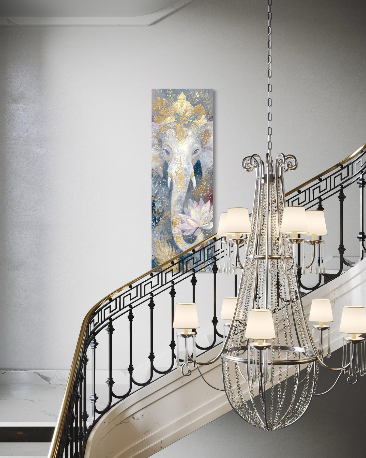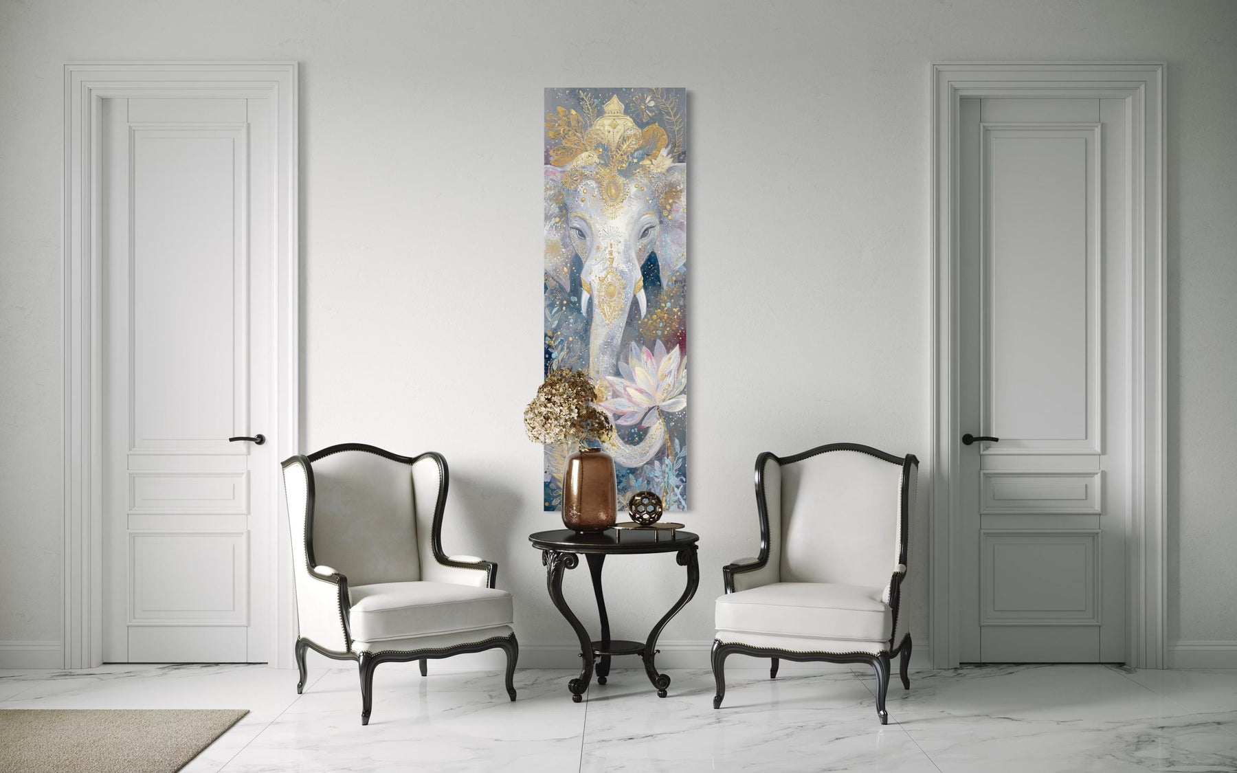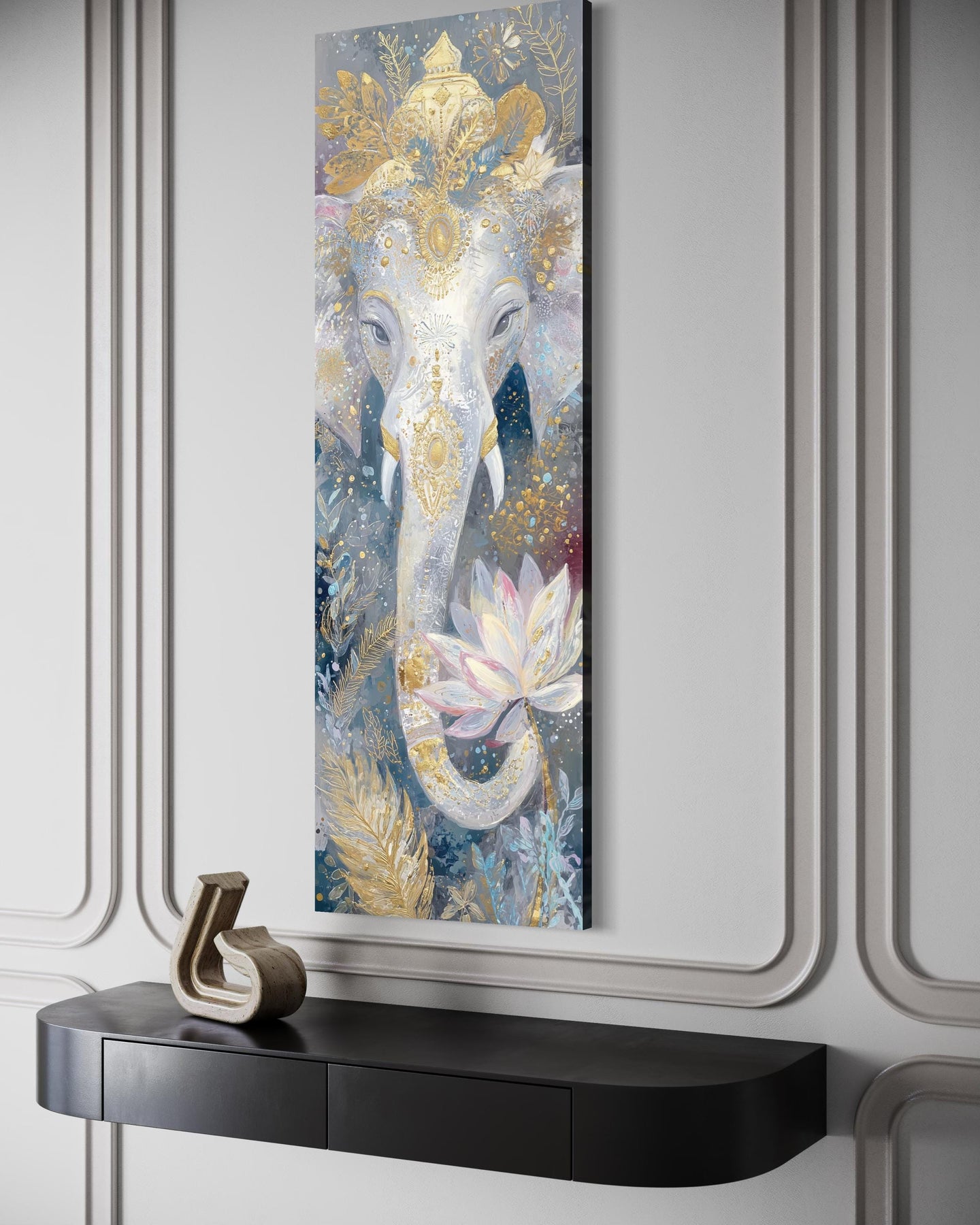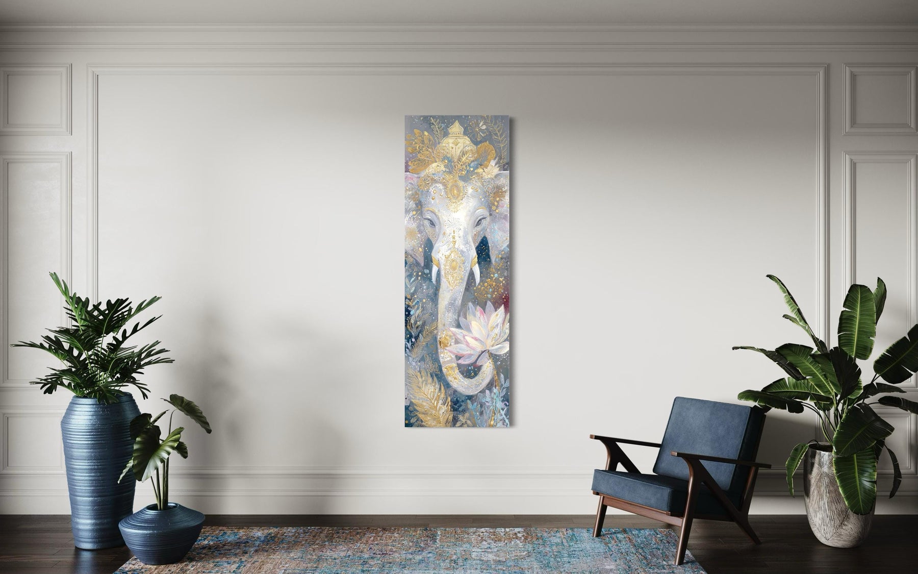 Zen-Ganesha-Wandbild – Schmaler, vertikaler Leinwanddruck mit Lotusblume | Dekoration für Meditationsräume