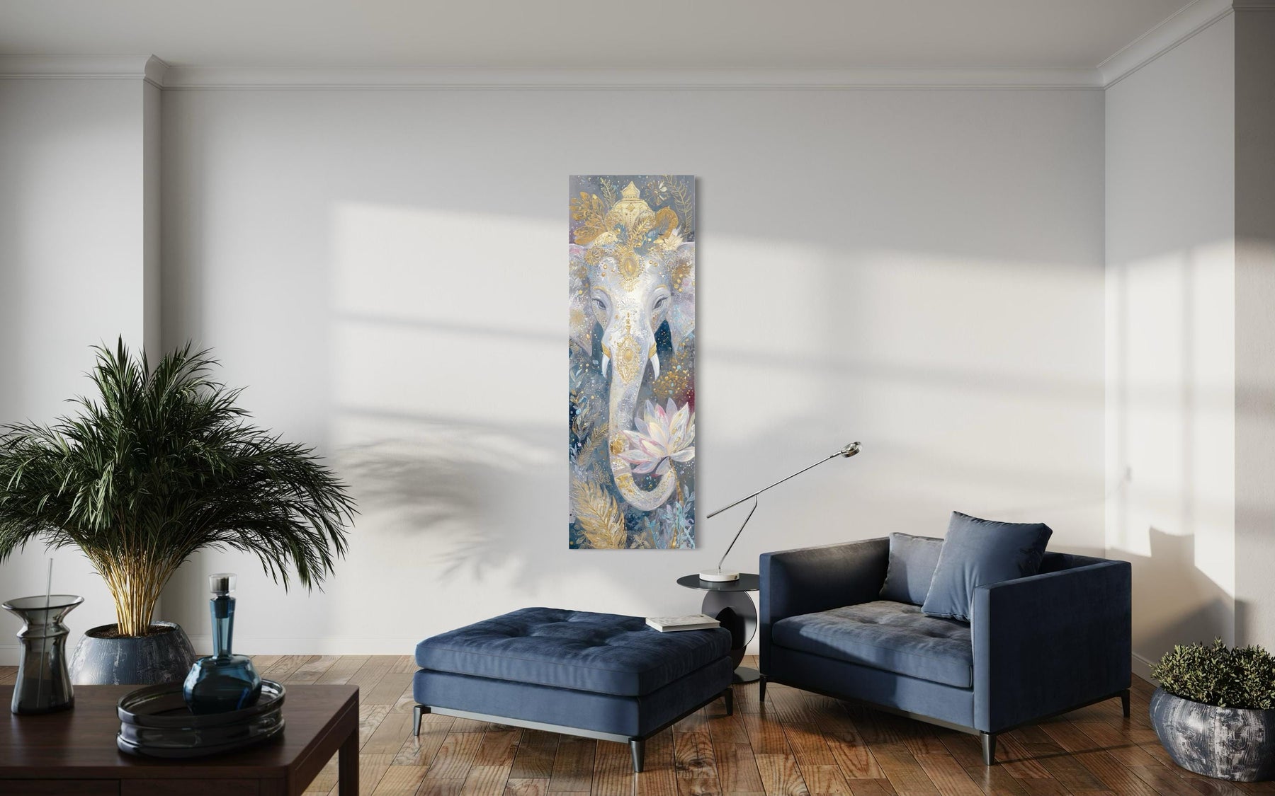 Dieses Zen-Ganesha-Wandbild ist ideal für Meditations- oder Yogaräume, wo eine sanfte, ruhige Atmosphäre und ein spirituelles Zentrum gefragt sind. Dank seiner schmalen, vertikalen Form passt es perfekt neben ein Fenster, zwischen Altarregale oder als Blickfang hinter einem Kissen oder einer Yogamatte. Im Meditationsraum dient das Bild nicht nur als Dekoration, sondern auch als symbolischer Anker – seine Bildsprache wurzelt in Klarheit, göttlicher Weisheit und achtsamer Präsenz. Die sanften Farben harmonieren perfekt mit Naturholz, elfenbeinfarbenen Matten, Rattanaccessoires und flackernden Kerzen. Für Yogastudios oder Rückzugsorte zu Hause, die der Stille und dem Atem gewidmet sind, bietet dieses Bild Ruhe und Inspiration und spendet während der täglichen Praxis sanfte visuelle Energie. Es passt wunderbar zu Duftöl-Diffusoren, Keramik-Räucherstäbchenhaltern und niedrigen Sitzmöbeln und verleiht dem Raum eine spirituelle Anmut. Die Größe wirkt intim und gleichzeitig erhaben und lässt selbst eine kleine Wand heilig und weitläufig erscheinen. In minimalistischen Wohnungen, wo weniger mehr ist, bringt dieses Bild Sanftheit und Sinnhaftigkeit ein, ohne die Sinne zu überfordern. Sein friedvoller Ausdruck und die fließenden Farben beruhigen das Auge und heben die Atmosphäre des Raumes auf subtile Weise. Dieses schmale, elegante Zen-Ganesha-Leinwandbild rundet den Raum der Ruhe und Besinnung perfekt ab.
