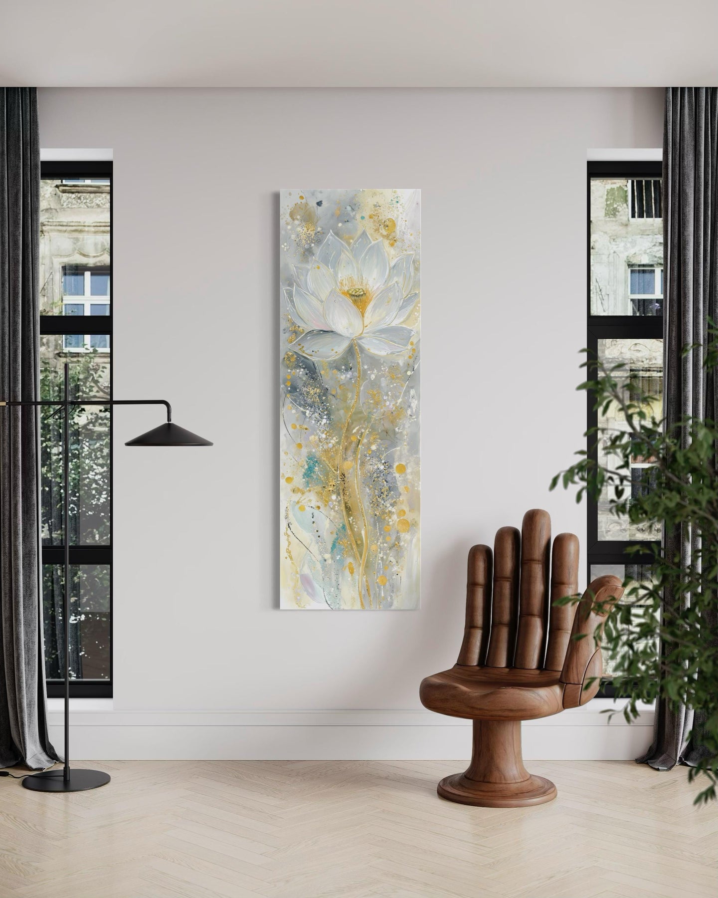 Vertical narrow canvas print of an abstract white and gold lotus flower on a neutral wall.