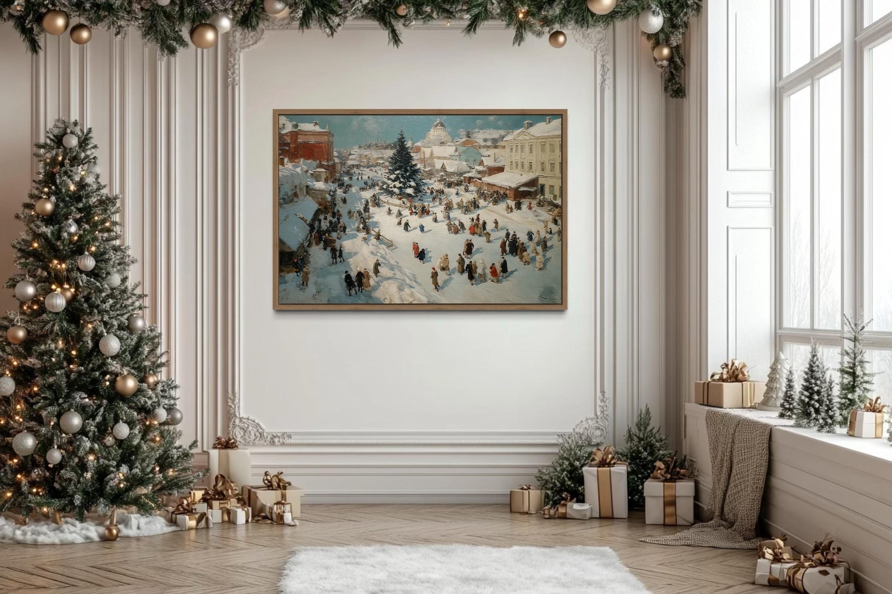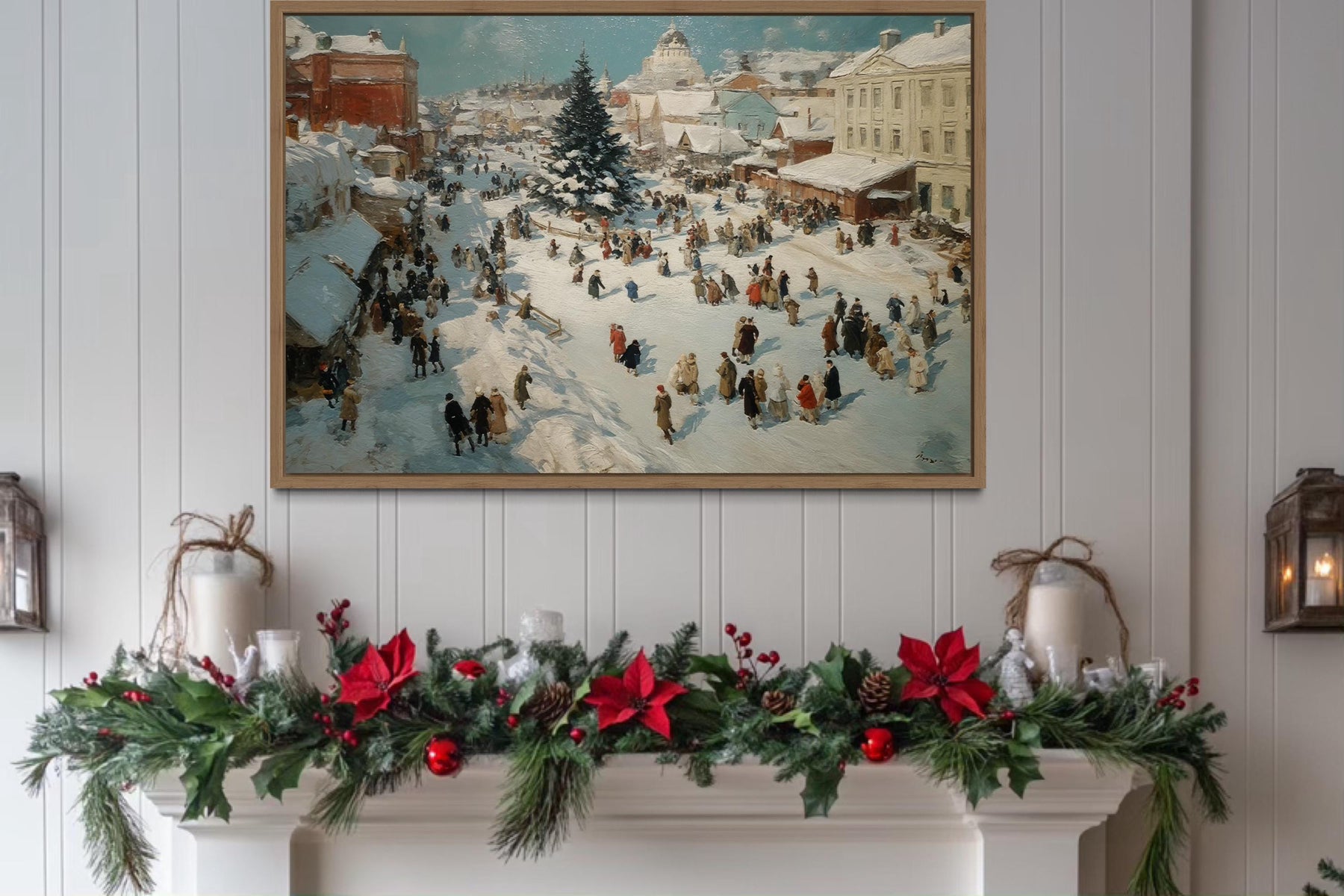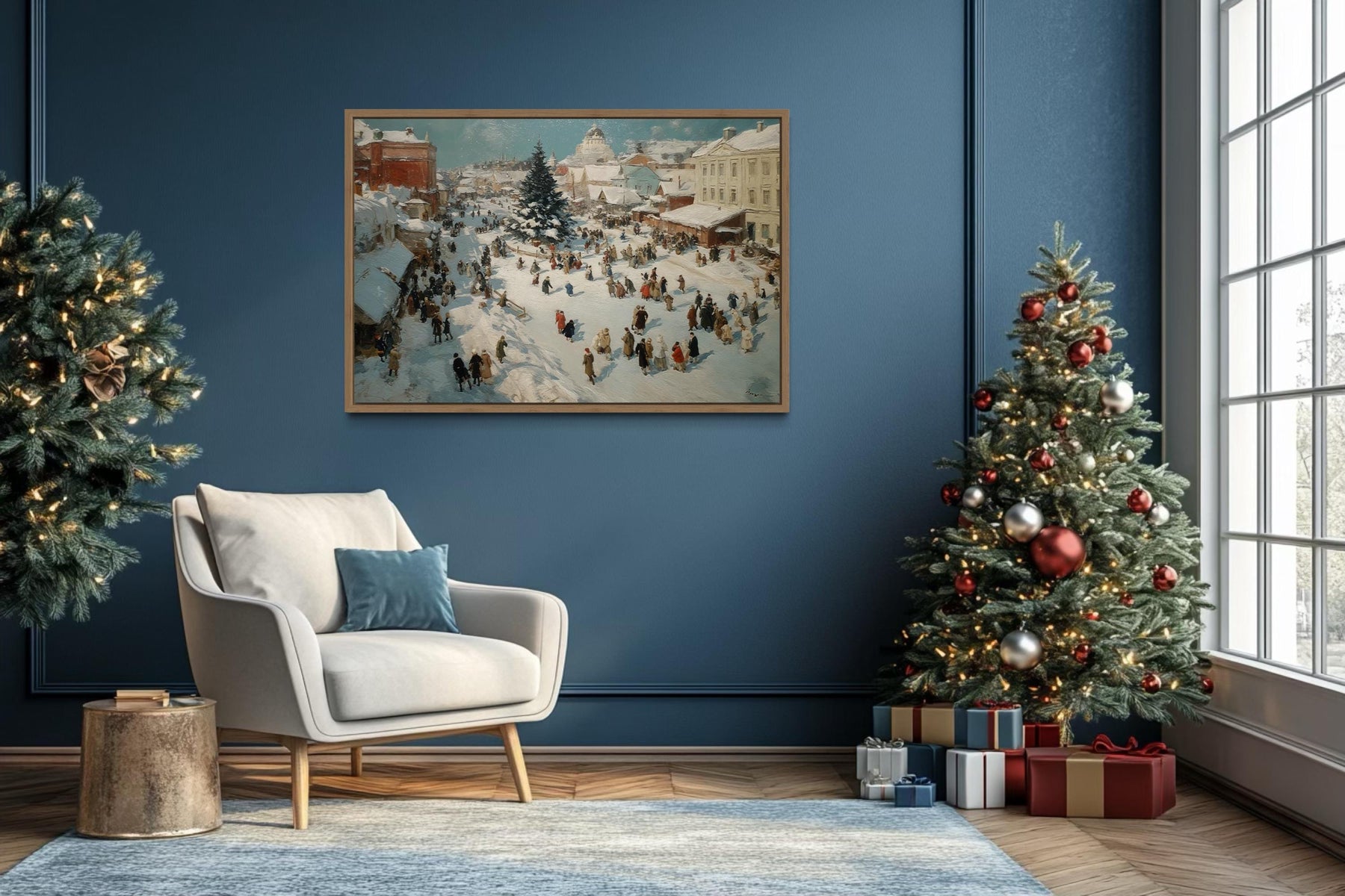 Dieses antike Winterdorf-Leinwandbild ist ideal für traditionelle Wohnzimmer und Familienräume, in denen Urlaubserinnerungen geschätzt und geteilt werden. In einem klassischen Wohnzimmer, das mit Vintage-Ornamenten und elegantem Grün geschmückt ist, bildet es einen unvergesslichen Blickfang über einem Kaminsims oder Sofa. Familienzimmer profitieren von der lebhaften und dennoch friedlichen Atmosphäre des Gemäldes und bilden die perfekte Kulisse für gemütliche Abende und den Austausch von Geschenken. Sein antikes Design und seine warme Farbpalette passen nahtlos zu Naturholzmöbeln, Kerzenlicht und Erbstückdekorationen. Ob als Teil einer größeren Weihnachtsbilderwand oder als eigenständiges, großartiges Weihnachtsstatement präsentiert, strahlt das Bild ein Gefühl altmodischer Freude aus. Die fertig zum Aufhängen vorbereitete Leinwand macht die saisonale Dekoration mühelos, und ihre robuste Konstruktion sorgt dafür, dass sie viele Weihnachten lang Freude bereitet. Die langlebige Druckqualität bedeutet, dass sie nach Jahren des Ausstellens genauso fesselnd bleibt wie am ersten Weihnachtsmorgen. Sammler von Kunst im Vintage-Stil werden die feinen Details und die getreue Wiedergabe historischer Weihnachtsmärkte zu schätzen wissen. Ob zum Begrüßen von Gästen in einem Eingangsbereich oder zur Anregung festlicher Gespräche in einem Esszimmer, es verbreitet stets die Magie eines Winterfestes. Mit dauerhafter Schönheit und herzlicher Tradition vollendet unser antikes Winterdorf-Weihnachtsmarktszenen-Leinwandbild jedes weihnachtlich inspirierte Zuhause mit Charme und zeitlosem Weihnachtsgeist.