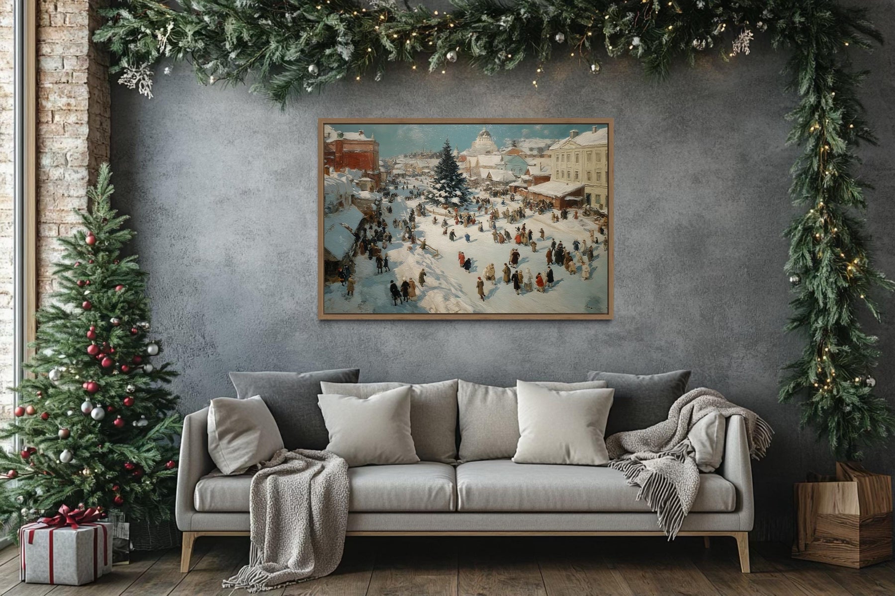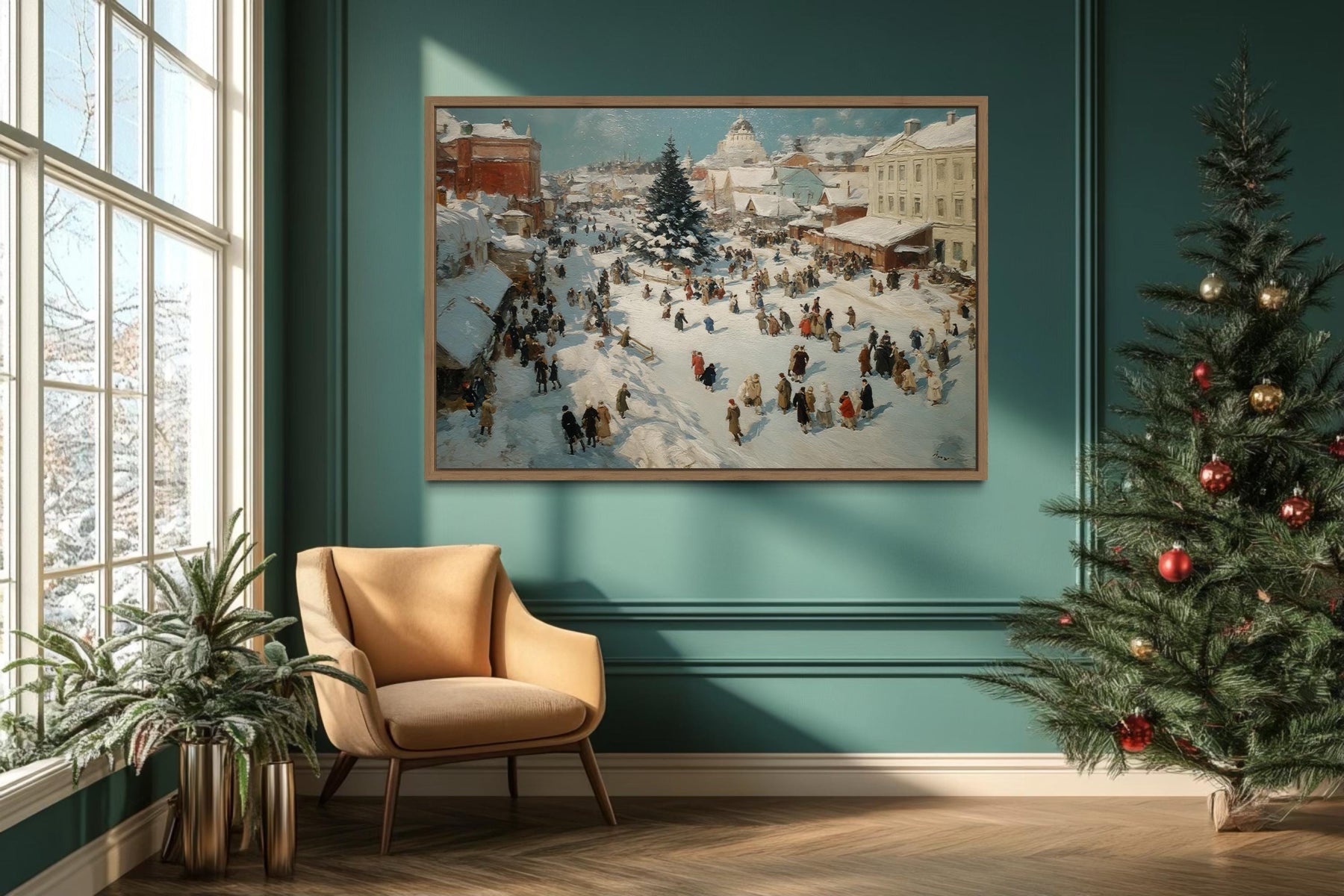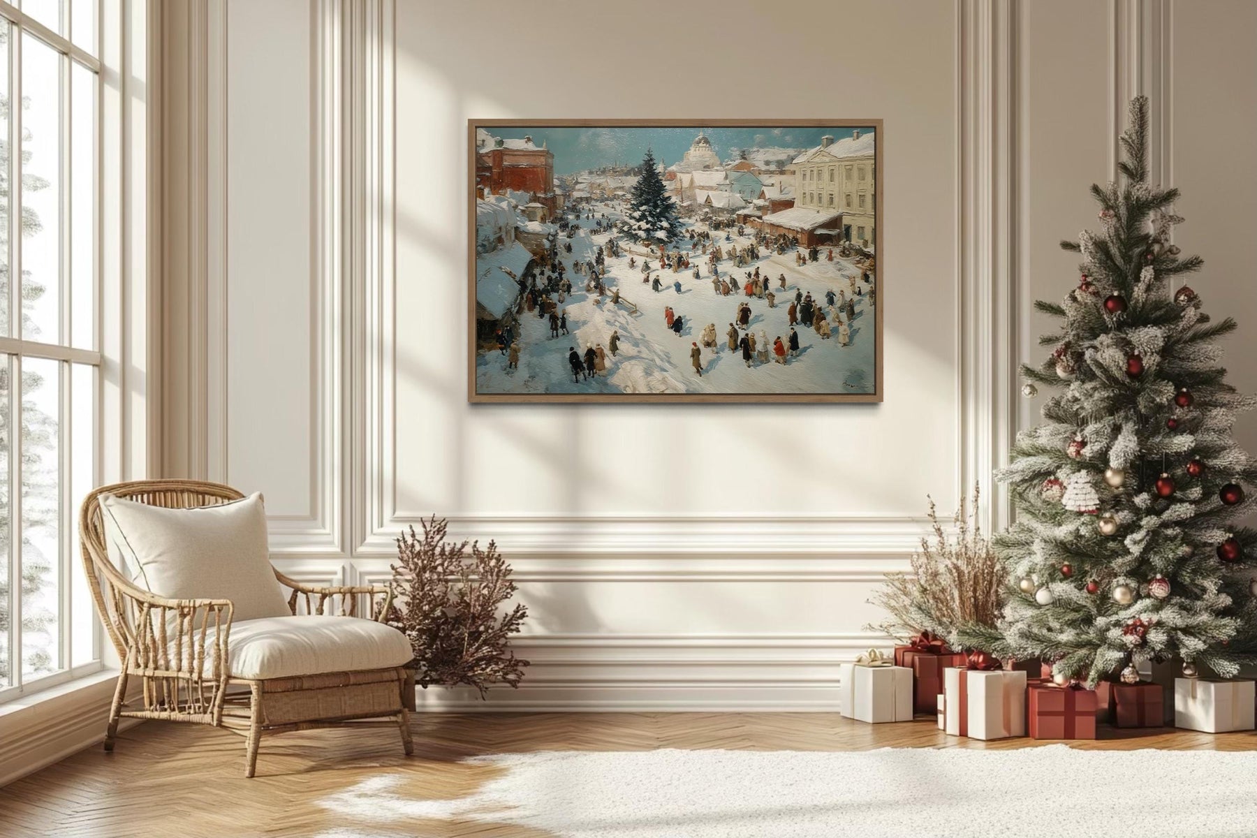 Dieses antike Winterdorf-Leinwandbild ist ideal für traditionelle Wohnzimmer und Familienräume, in denen Urlaubserinnerungen geschätzt und geteilt werden. In einem klassischen Wohnzimmer, das mit Vintage-Ornamenten und elegantem Grün geschmückt ist, bildet es einen unvergesslichen Blickfang über einem Kaminsims oder Sofa. Familienzimmer profitieren von der lebhaften und dennoch friedlichen Atmosphäre des Gemäldes und bilden die perfekte Kulisse für gemütliche Abende und den Austausch von Geschenken. Sein antikes Design und seine warme Farbpalette passen nahtlos zu Naturholzmöbeln, Kerzenlicht und Erbstückdekorationen. Ob als Teil einer größeren Weihnachtsbilderwand oder als eigenständiges, großartiges Weihnachtsstatement präsentiert, strahlt das Bild ein Gefühl altmodischer Freude aus. Die fertig zum Aufhängen vorbereitete Leinwand macht die saisonale Dekoration mühelos, und ihre robuste Konstruktion sorgt dafür, dass sie viele Weihnachten lang Freude bereitet. Die langlebige Druckqualität bedeutet, dass sie nach Jahren des Ausstellens genauso fesselnd bleibt wie am ersten Weihnachtsmorgen. Sammler von Kunst im Vintage-Stil werden die feinen Details und die getreue Wiedergabe historischer Weihnachtsmärkte zu schätzen wissen. Ob zum Begrüßen von Gästen in einem Eingangsbereich oder zur Anregung festlicher Gespräche in einem Esszimmer, es verbreitet stets die Magie eines Winterfestes. Mit dauerhafter Schönheit und herzlicher Tradition vollendet unser antikes Winterdorf-Weihnachtsmarktszenen-Leinwandbild jedes weihnachtlich inspirierte Zuhause mit Charme und zeitlosem Weihnachtsgeist.