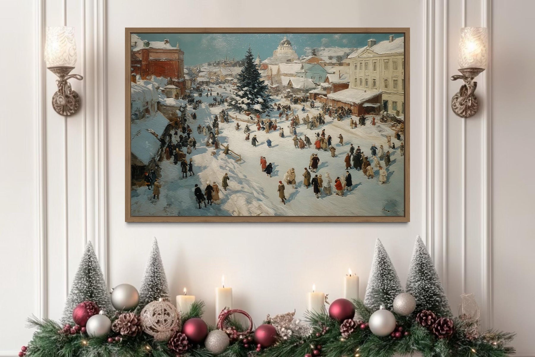 Antique Winter Village Christmas Market Scene Canvas Wall Art