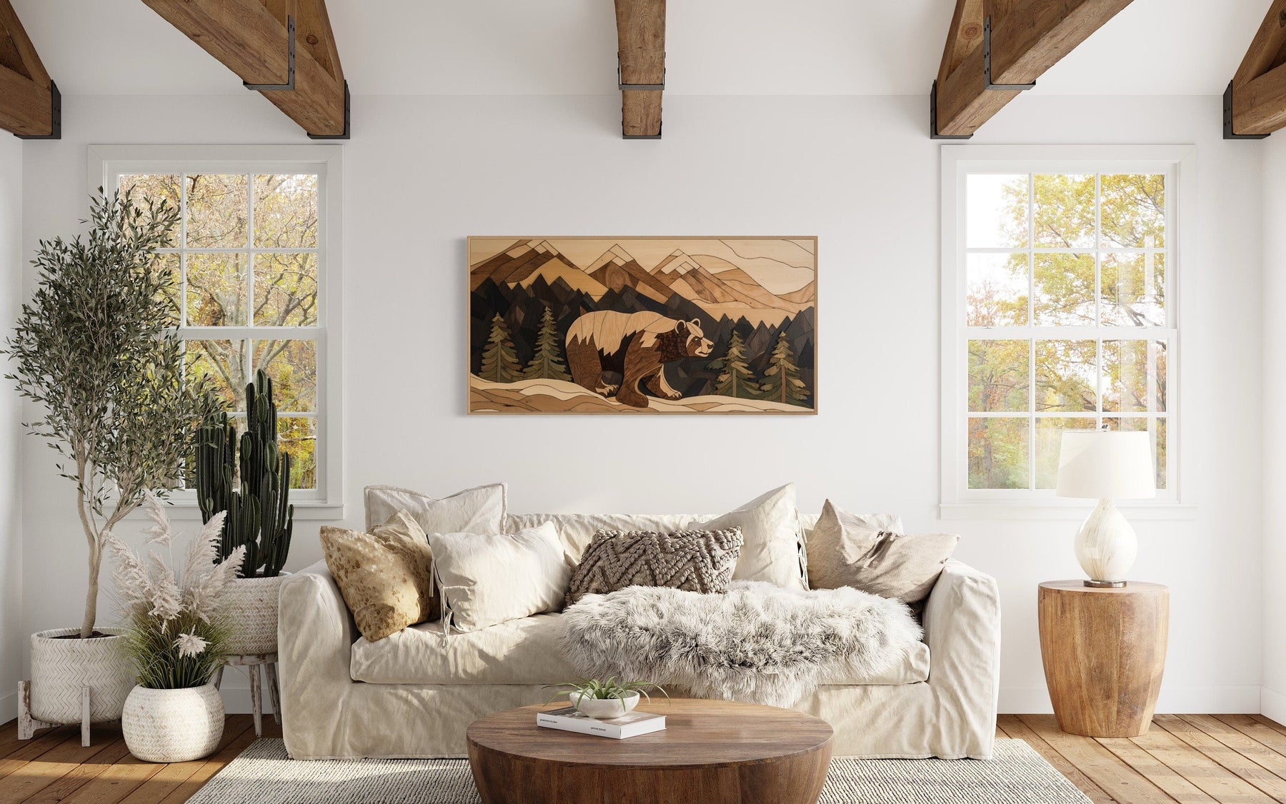 Die Wanddekoration „Bär in den Bergen“ ist eine perfekte Ergänzung für rustikale Hütten, gemütliche Lodges oder Berghäuser. Seine raue Ästhetik und sein natürliches Thema machen es ideal für Wohnzimmer, Arbeitszimmer oder über Steinkaminen, wo es als markanter Blickfang dienen kann. Kombinieren Sie es mit Holzmöbeln, Ledersofas und gewebten Textilien, um ein warmes, von der Natur inspiriertes Interieur zu schaffen, das die Schönheit der Natur feiert. In Schlafzimmern verleiht dieses Kunstwerk eine heitere Note und verwandelt den Raum in einen ruhigen Rückzugsort, umgeben vom Charme der Wildnis. In Essbereichen wertet es rustikale Tischlandschaften mit einem Hintergrund aus Erdtönen und natürlichen Texturen auf. Der Holzpaneeleffekt sorgt dafür, dass es Häuser im Landhausstil und traditionelle Lodge-Dekoration nahtlos ergänzt. Dieses Gemälde „Bär in den Bergen“ bringt die Erhabenheit der Natur in Räume, die rustikale Eleganz und natürliche Gelassenheit feiern.