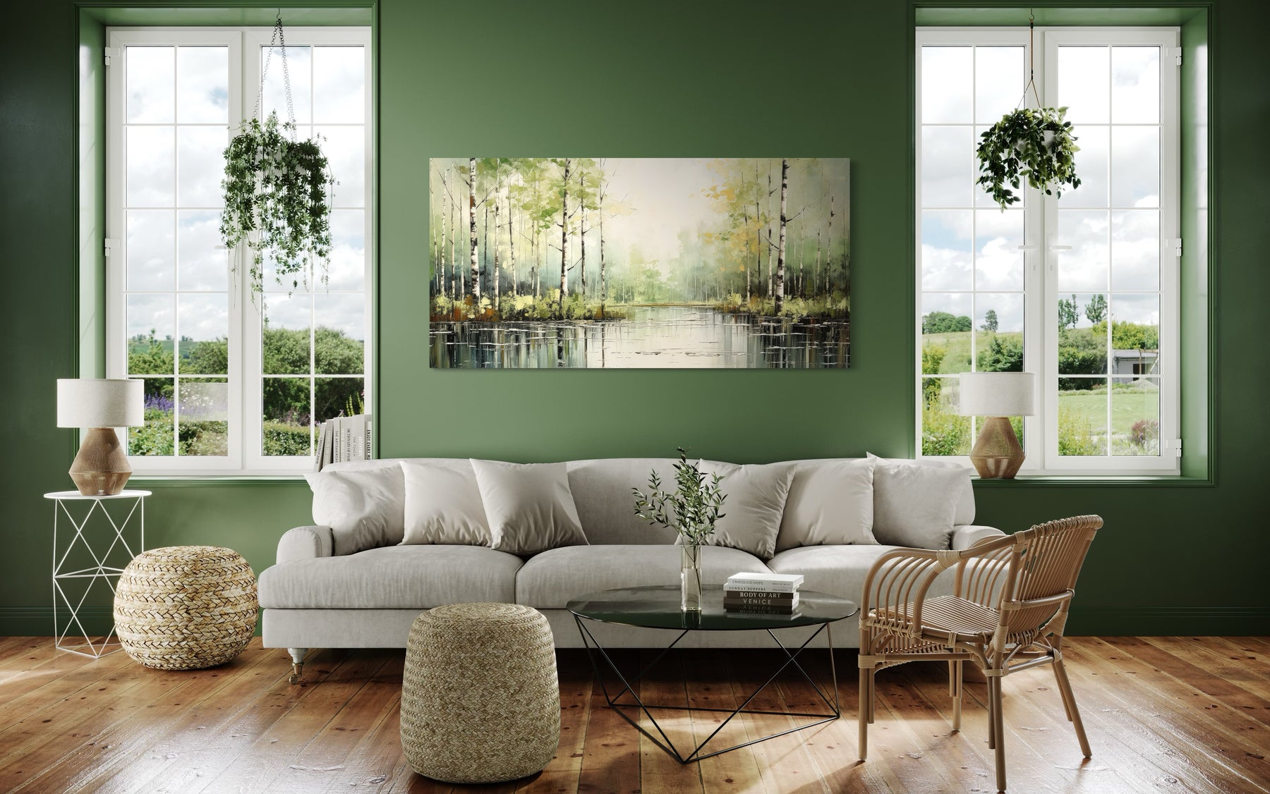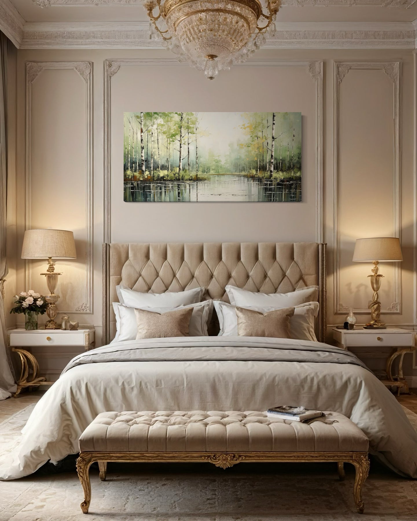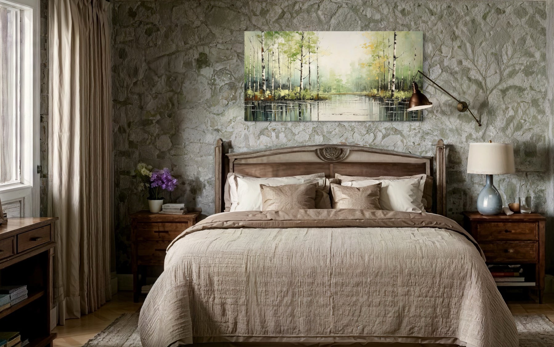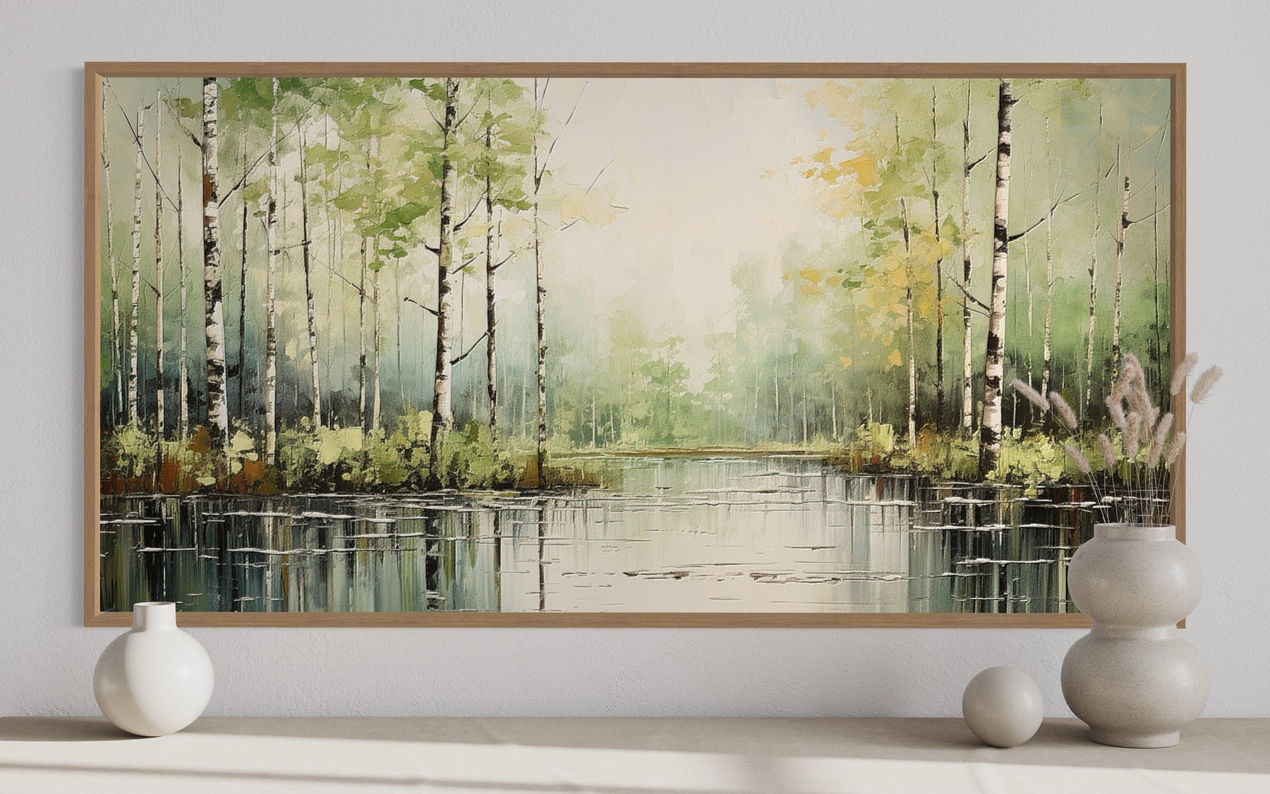 Das Farbschema dieses Birkenwaldgemäldes besteht aus sanften Grüntönen, gedämpften Weißtönen und sanften Brauntönen, die eine harmonische und beruhigende Wirkung erzeugen. Das dezente Grün des Laubes harmoniert wunderbar mit der weißen Rinde der Birken und vermittelt ein Gefühl von Frische und Gelassenheit. Die erdigen Töne des Waldbodens verleihen Wärme und Tiefe und verbessern die Gesamtkomposition. Licht und Schatten werden gekonnt eingesetzt, um ein Gefühl von Dimension und Realismus zu erzeugen. Diese beruhigenden Farben sorgen dafür, dass das Kunstwerk eine Vielzahl von Inneneinrichtungen ergänzt, von rustikal bis modern. Die natürliche Palette bringt einen Hauch von Natur ins Innere und verleiht Ihrem Raum eine stärkere Verbindung zur Natur.