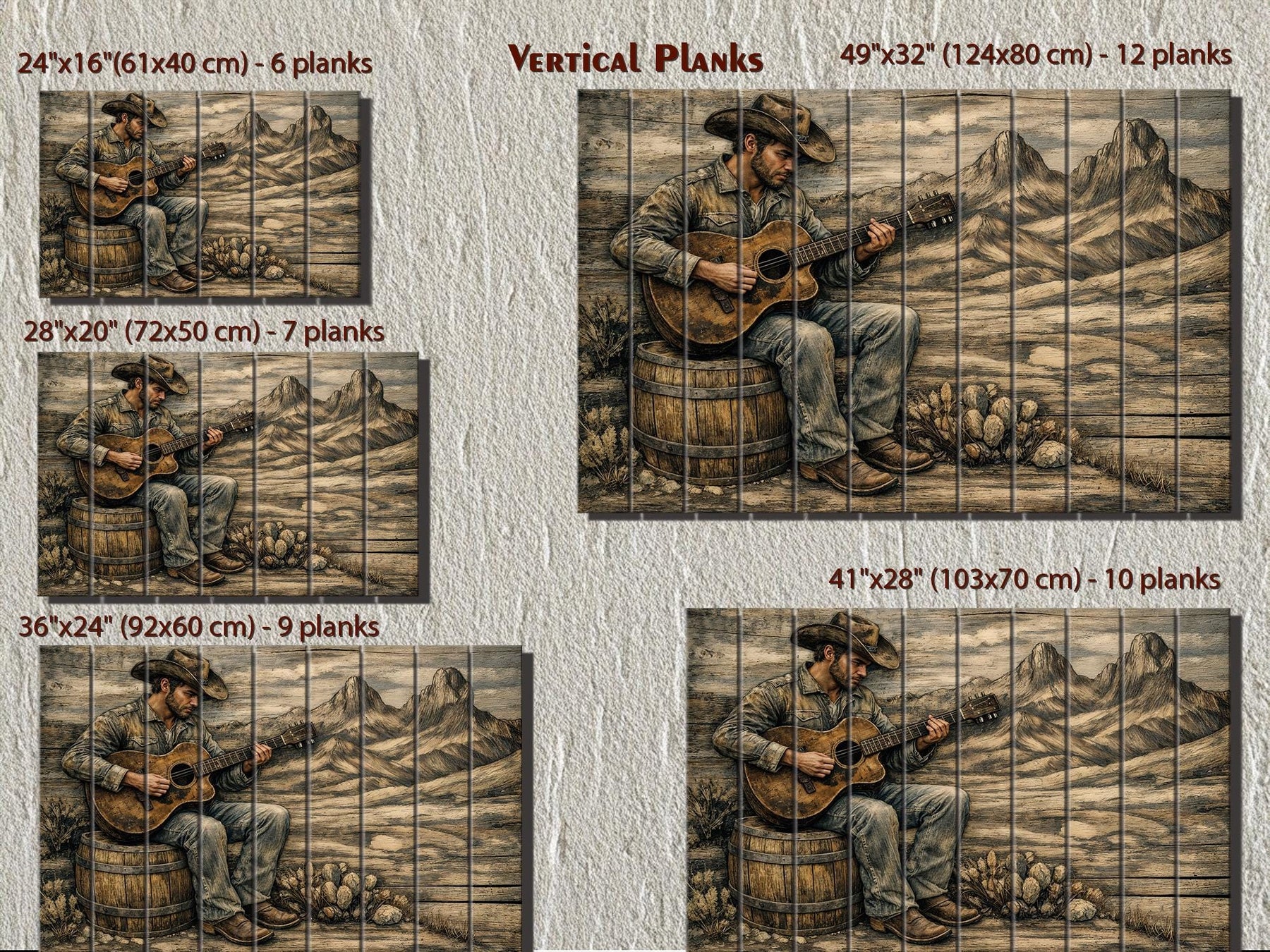 Rustic western wood wall art featuring a cowboy playing guitar, available in five vertical plank sizes.