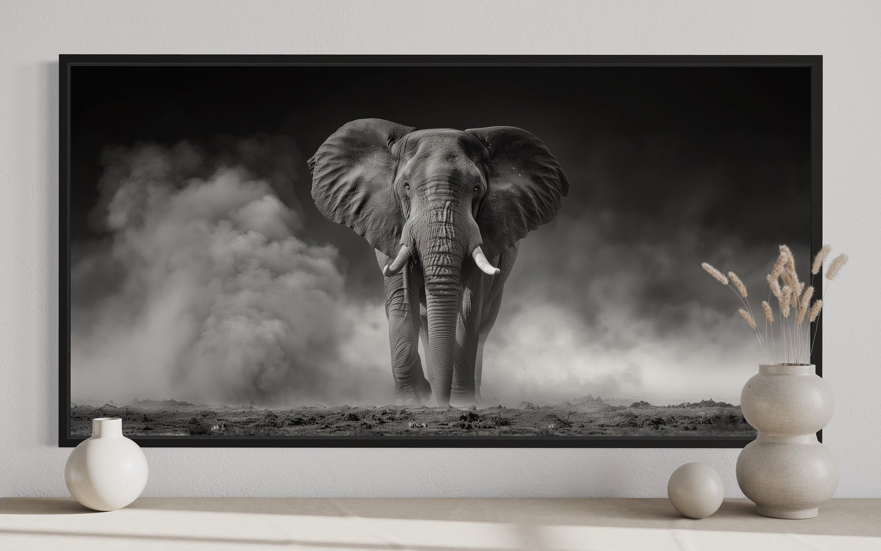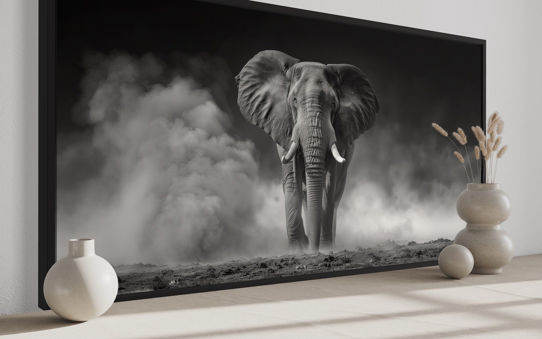 Die Farbpalette dieser Elefanten-Wanddekoration besteht aus einer harmonischen Mischung aus Schwarz, Weiß und subtilen Grautönen. Die monochromatischen Töne erzeugen einen starken Kontrast und heben die komplizierten Details des Elefanten und des wirbelnden Staubs hervor. Die sanften Farbverläufe verleihen dem Bild eine dreidimensionale Qualität und fügen Tiefe und Realismus hinzu. Das Zusammenspiel von Licht und Schatten erzeugt eine geheimnisvolle und ätherische Atmosphäre und fängt die Essenz der rauen Schönheit der Savanne ein. Diese neutralen Töne ermöglichen es dem Kunstwerk, eine Vielzahl von Farbschemata zu ergänzen, von dunklen und stimmungsvollen Innenräumen bis hin zu hellen und minimalistischen Räumen. Die elegante Schlichtheit von Schwarz und Weiß verleiht der Komposition einen zeitlosen Charme. Lassen Sie diese Elefantenfotografie ein Gefühl von Gelassenheit und Raffinesse in Ihr Zuhause bringen. Seine raffinierte Palette verkörpert sowohl die Rauheit als auch die Eleganz der Natur.