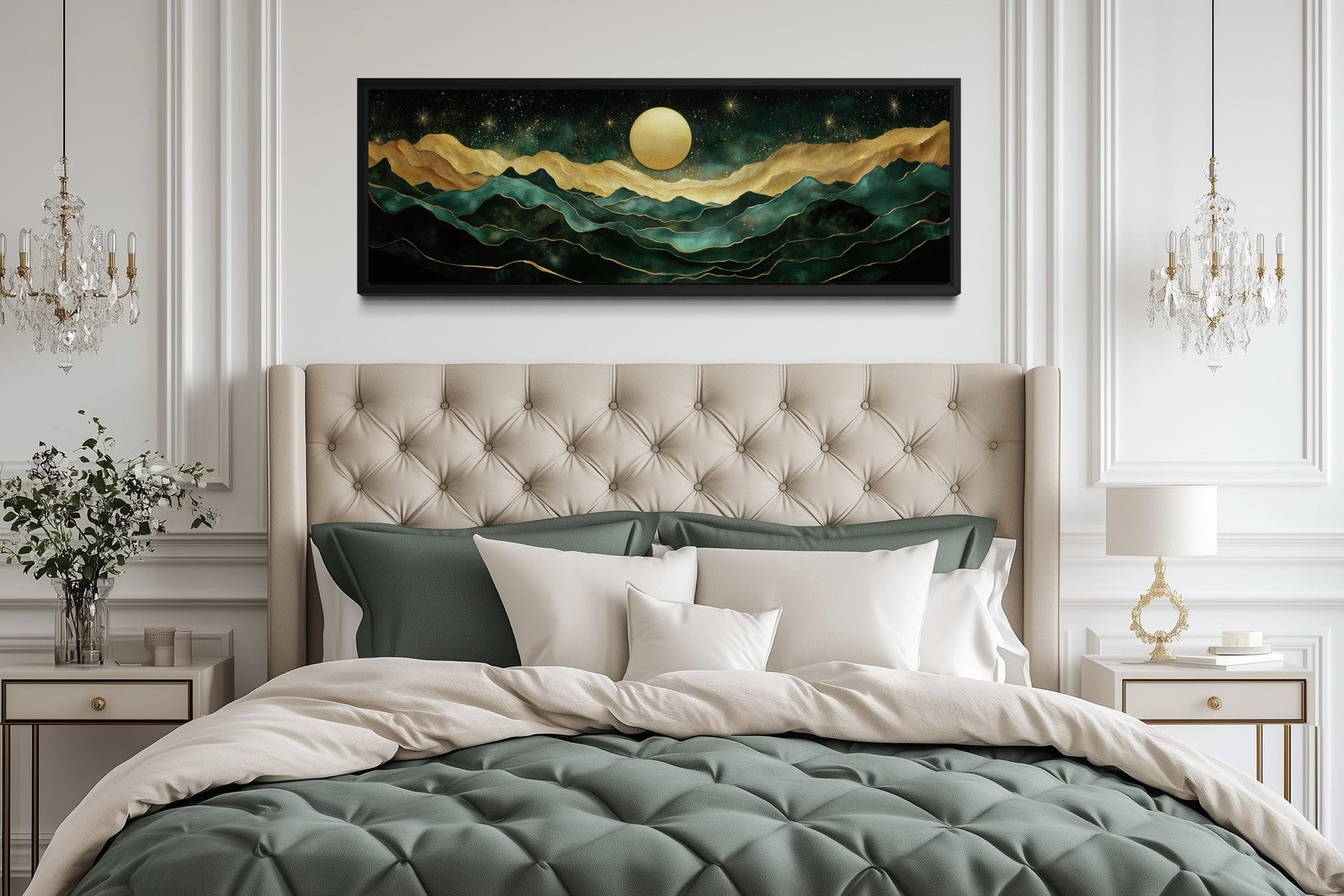 Dieses längliche, schmale Wandbild in Smaragdgrün wurde für Interieurs mit einem eleganten und hochwertigen Stil entworfen und ist ideal für ein modernes Wohnzimmer, in dem klare Linien, skulpturale Möbel und edle Materialien ein stimmiges Ambiente schaffen. Über einem Sofa platziert, erweitert das Panoramaformat die Wand optisch und wird zum zentralen Blickfang, der dem Raum Struktur verleiht. Die juwelenfarbene Farbpalette harmoniert perfekt mit Samtbezügen, goldenen Leuchten und Oberflächen aus Marmor oder Glas und unterstreicht so ein stimmiges Luxus-Thema. In einem modernen Schlafzimmer schaffen die ruhigen Bergformen und der leuchtende Mond eine friedliche Atmosphäre und behalten gleichzeitig ihre starke visuelle Wirkung. Dieses Wandbild mit smaragdgrünen und goldenen Bergmotiven passt besser in Räume, die bewusst mit dunkleren Tönen und metallischen Akzenten arbeiten, als in legere oder rustikale Umgebungen. Seine schlanke, horizontale Form ergänzt lange Kopfteile und flache Möbel und betont die architektonische Linienführung des Raumes. Die reflektierenden Goldelemente interagieren mit dem Umgebungslicht und verleihen dem Raum abends Wärme. Das Kunstwerk macht mehrere kleinere Dekorationselemente überflüssig, da es als vollständiges Blickfang-Element fungiert. Jedes Element trägt zu einem Gefühl von Raffinesse und moderner Eleganz bei. Der gesamte Raum wird durch die filmreife Präsenz unseres smaragdgrünen Goldberg-Wandbildes aufgewertet.