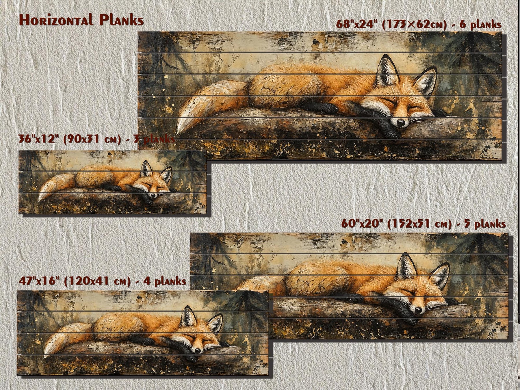 Unser Wandbild „Schlafender Fuchs auf einem Baumstamm“ ist auf neuem Massivholz gedruckt und fängt einen friedvollen Waldmoment ein: Ein zusammengerollter Fuchs ruht an einem umgestürzten, strukturierten Baumstamm, sein Körper entspannt und still, während der Waldboden in sanften Schatten verschwimmt. Die längliche Komposition folgt der natürlichen Linie des Stammes und lässt das Tier sich über die gesamte Fläche erstrecken, wodurch es zum stillen Mittelpunkt der Szene wird. Eine bewusst gealterte Optik verleiht der Oberfläche den Charakter von altem Hüttenholz, doch das Holz darunter bleibt glatt, robust und edel – eine gelungene Kombination aus rustikalem Charme und präziser Verarbeitung. Die detaillierte Fellzeichnung erzeugt Tiefe und Wärme, während dezente Lichtreflexe an Rücken und Schwanz die Form vom erdigen Hintergrund abheben. Der Hintergrund ist bewusst zurückhaltend gehalten, sodass der ruhende Fuchs im Mittelpunkt steht und das Kunstwerk zu einer friedvollen Erzählung statt einer lebhaften Tierillustration wird. Sanfte Tonwertverläufe auf der Holzplanke verstärken die Illusion von gealterten Brettern und verleihen dem Bild Tiefe, ohne vom Motiv abzulenken. Dieses rustikale Wandbild mit Waldtiermotiv vereint den Charme antiker Hütten mit einem natürlichen Waldthema und wirkt wie ein Refugium für einen ruhigen Rückzugsort. Die horizontale Anordnung verleiht der Szene Weite und vermittelt den Eindruck eines stillen Waldmoments, der sich über die Ränder des Bildes hinaus erstreckt. Die Gesamtstimmung dieses Kunstwerks – ein Fuchs auf einem Baumstamm – ist warm, geerdet und eng mit dem ruhigen Rhythmus der Natur verbunden.