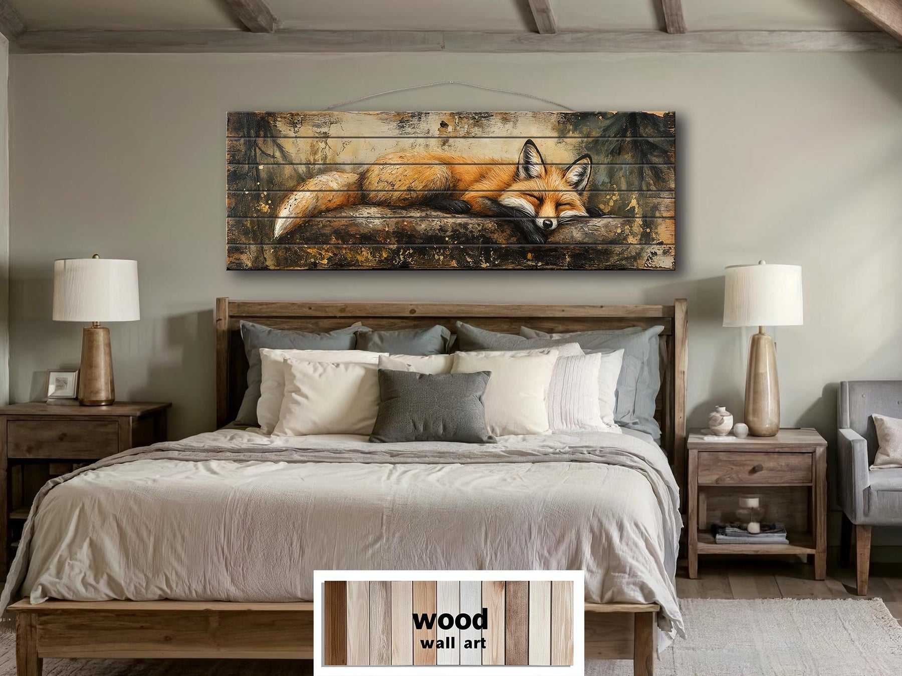 Dieses Kunstwerk wurde speziell für Schlafzimmer in Blockhütten und Wohnzimmer im Lodge-Stil geschaffen, wo massive Materialien, sanftes Licht und von der Natur inspirierte Texturen die Atmosphäre prägen. Der ruhende Fuchs wird hier zum Symbol für Wärme und Ruhe. Über einem Holzbett oder einem tiefen Polstersofa aufgehängt, spiegelt das längliche, horizontale Format die klaren architektonischen Linien dieser Interieurs wider und hält das schlafende Tier als visuellen Ankerpunkt. Die Echtholzkonstruktion verleiht dem Kunstwerk das nötige Gewicht, um sich natürlich an Blockwände, Holzvertäfelungen oder leicht strukturierten Putz anzufügen, ohne provisorisch zu wirken. Umgeben von karierten Textilien, gewebten Teppichen und Vintage-Holzmöbeln verstärkt der Fuchs auf dem umgestürzten Baum das Gefühl eines abgeschiedenen Waldrefugiums. Seine friedliche Haltung macht ihn besonders geeignet für Räume, die eher zum Entspannen, Lesen und für einen gemütlichen Morgen als für lebhafte Aktivitäten gedacht sind. Die erdigen Farbtöne harmonieren perfekt mit Geweihdekorationen, Ledersesseln und warmer, neutraler Bettwäsche, während das ruhige Wildtiermotiv die Struktur des Raumes auflockert. Die längliche Form des Baumstamms passt ideal über massive Möbelstücke und verleiht der Komposition optische Stabilität. Im Wohnzimmer einer Blockhütte verleiht der schlafende Fuchs dem Raum Charakter und erzählt eine Geschichte, ohne dabei an Eleganz und Gelassenheit einzubüßen. Dieses Wandbild eines schlafenden Fuchses auf einem Baumstamm passt perfekt in Interieurs, die Ruhe und Behaglichkeit, natürliche Materialien und eine tiefe Verbundenheit mit der Waldumgebung zelebrieren.