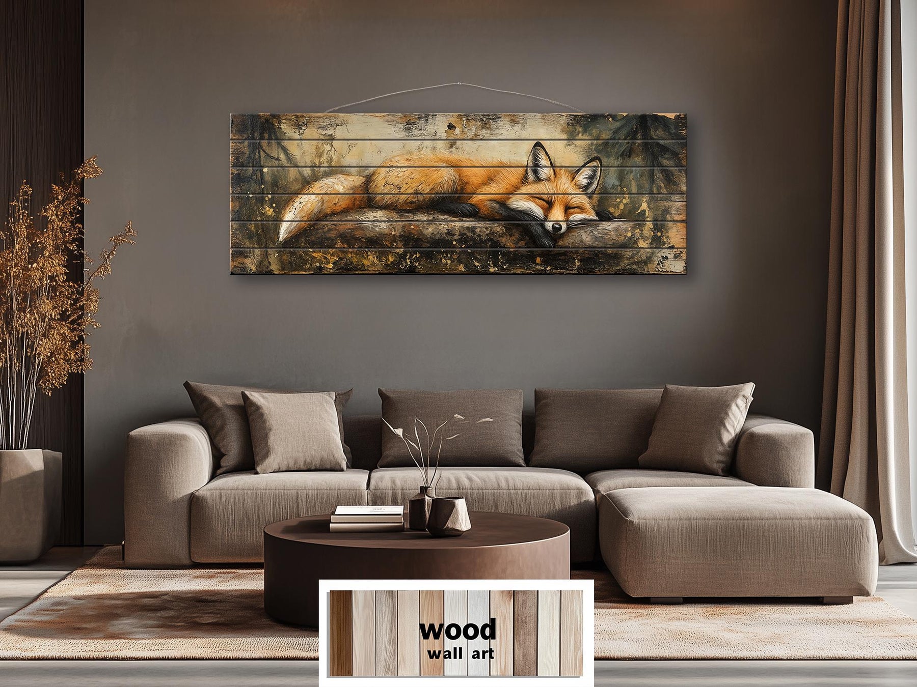 Ein tiefer, rindenbrauner und gerösteter Walnusston spiegelt die natürlichen Farben von Waldboden und verwittertem Holz wider und bildet eine erdige Basis, die den schlafenden Fuchs trägt, ohne ihn zu erdrücken. Sattes Kupfer, Bernstein und sanftes Rostrot durchziehen das Fell des Tieres und erzeugen einen sanften Glanz, der den Blick fesselt und gleichzeitig beruhigend und natürlich wirkt. Cremiges Beige und gedeckte Sandtöne heben die Oberfläche des Baumstamms hervor und sorgen für einen Kontrast, der die Komposition optisch ausgewogen hält. Nuancen von Moos und Olivgrün im umgebenden Boden verleihen Frische und verhindern, dass die Farbpalette zu schwer wirkt. Die aufgedruckte Gebrauchsspur erzeugt dezente Tonwertvariationen, die das Aussehen gealterter Dielen imitieren und gleichzeitig für eine glatte und gleichmäßige Oberfläche sorgen. Sanfte Anthrazit-Schatten unter dem Baumstamm verankern das Bild und verleihen der Szene eine geerdete, plastische Wirkung. Warme Mitteltöne im gesamten Werk schaffen eine einladende, gemütliche Kaminatmosphäre. Dank dieser natürlichen Farben harmoniert das Gemälde des Waldfuchses mühelos mit Ledersitzen, Wolldecken und Möbeln aus naturbelassenem Holz. Das Gleichgewicht zwischen warmen und neutralen Farbtönen verleiht dem Kunstwerk Ruhe und visuelle Behaglichkeit. Die sorgfältig abgestufte Farbpalette verleiht dem Wandbild „Schlafender Fuchs auf einem Baumstamm“ eine behagliche Ausstrahlung, die rustikale Interieurs aufwertet, ohne sie zu dominieren.