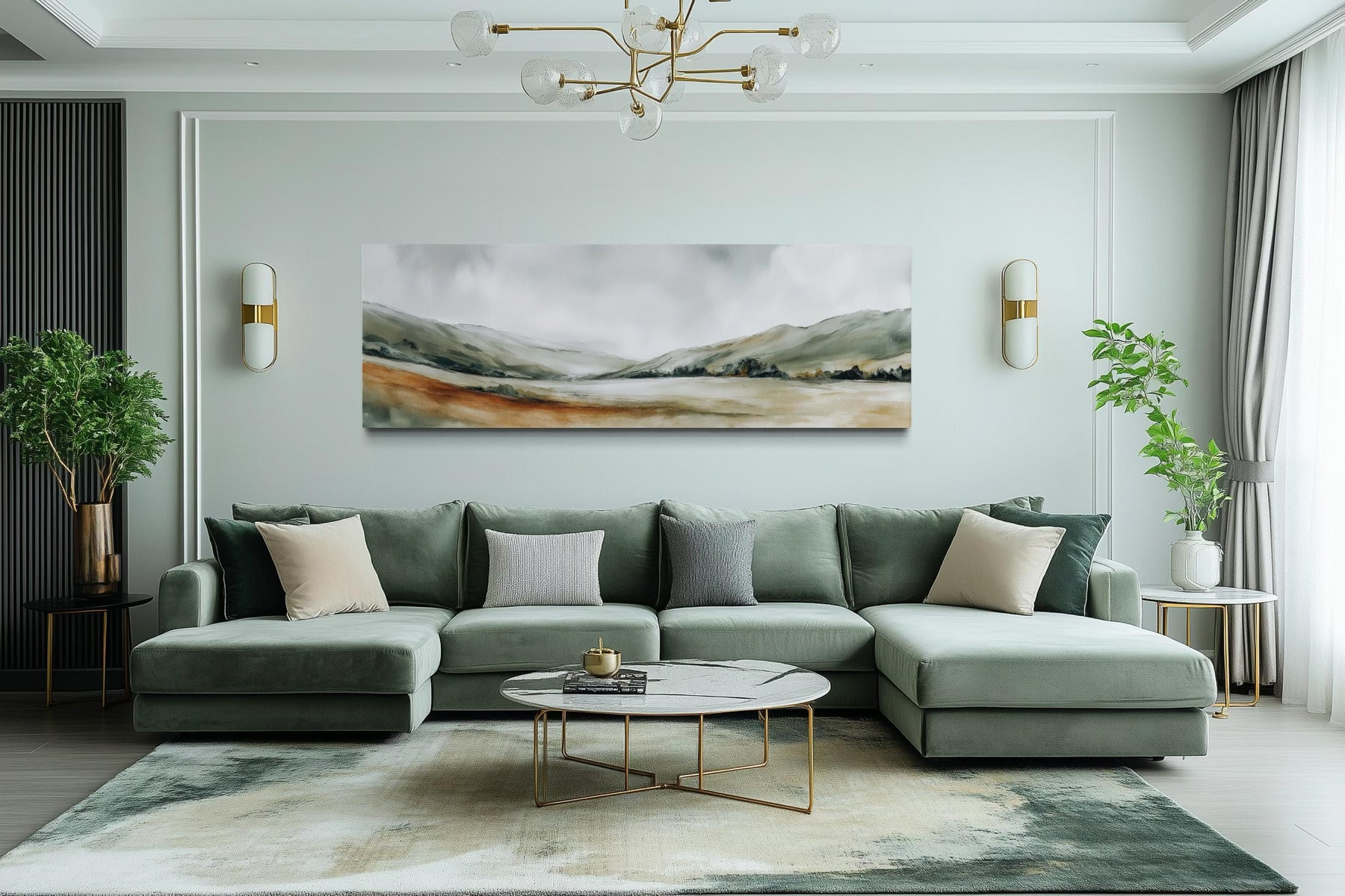 Dieses grüne Landschaftsbild passt hervorragend in ein minimalistisches Wohnzimmer mit flachen Möbeln, einem langen, neutralen Sofa und freier Wandfläche, wo das horizontale Format die klaren architektonischen Linien widerspiegelt. Es harmoniert mit Interieurs, die auf sanften Texturen, hellem Holz, Bouclé, Leinen und matter Keramik basieren, anstatt auf verschnörkelter Dekoration. Über einer großzügigen Sitzgruppe erweitert die Panoramaform den Raum optisch und verstärkt das Gefühl von Ausgewogenheit und Ordnung. In einem ruhigen Schlafzimmer mit einem langen, gepolsterten Kopfteil und schlichten, schwebenden Nachttischen verleiht die Landschaft Tiefe, ohne optisch zu wirken. Räume mit einer salbeigrünen Akzentwand oder warmweißen Wänden profitieren von der tonalen Harmonie des Kunstwerks. Die zurückhaltende Komposition fördert eine ruhige Atmosphäre zum Entspannen, Lesen oder für Gespräche. Anstatt mit Möbeln und Beleuchtung zu konkurrieren, verbindet sie diese durch gemeinsame Farbe und Proportionen. Große, leere Wände erhalten Struktur, ohne dass eine Bildergalerie nötig ist. Der Gesamteindruck ist ruhig, modern und natürlich. Ein zurückhaltendes Interieur findet in unserem grünen Landschaftsbild den perfekten Abschluss.