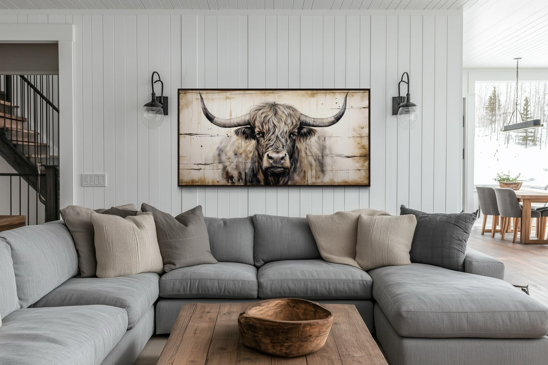 Dieses Wandkunstwerk mit einem Highland-Bullen fängt mit seiner markanten rustikalen Komposition die Stärke und den rauen Charme der Landschaft ein. Das Kunstwerk zeigt einen majestätischen Highland-Bullen vor einem Hintergrund mit Holzstruktur und schafft so eine perfekte Mischung aus Natur und Kunstfertigkeit. Jeder Pinselstrich hebt die komplizierten Details des Fells, der Hörner und der Haltung des Bullen hervor und erweckt das Werk mit Realismus und Tiefe zum Leben. Dieses Gemälde soll ein Gefühl von Tradition und Erbe hervorrufen und ist eine zeitlose Ergänzung für Inneneinrichtungen im Bauernhaus- oder Landhausstil. Die warmen und erdigen Töne verstärken seinen rustikalen Reiz und machen es sowohl einladend als auch optisch fesselnd. Sein gerahmtes Design verleiht ihm ein poliertes Finish und sorgt dafür, dass das Kunstwerk als Mittelpunkt hervorsticht. Dieses Gemälde ist perfekt für diejenigen, die den Charme der Landschaft bewundern, und verkörpert den Geist des Bauernhofs und des rustikalen Lebens. Verleihen Sie Ihrem Zuhause mit diesem Wandkunstwerk mit einem Highland-Bullen auf Leinwand einen Hauch ländlicher Eleganz.