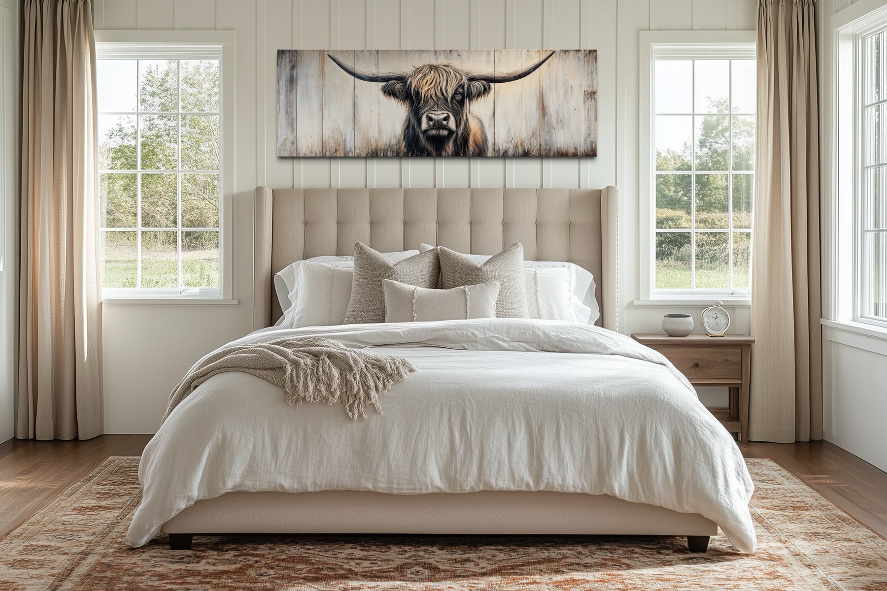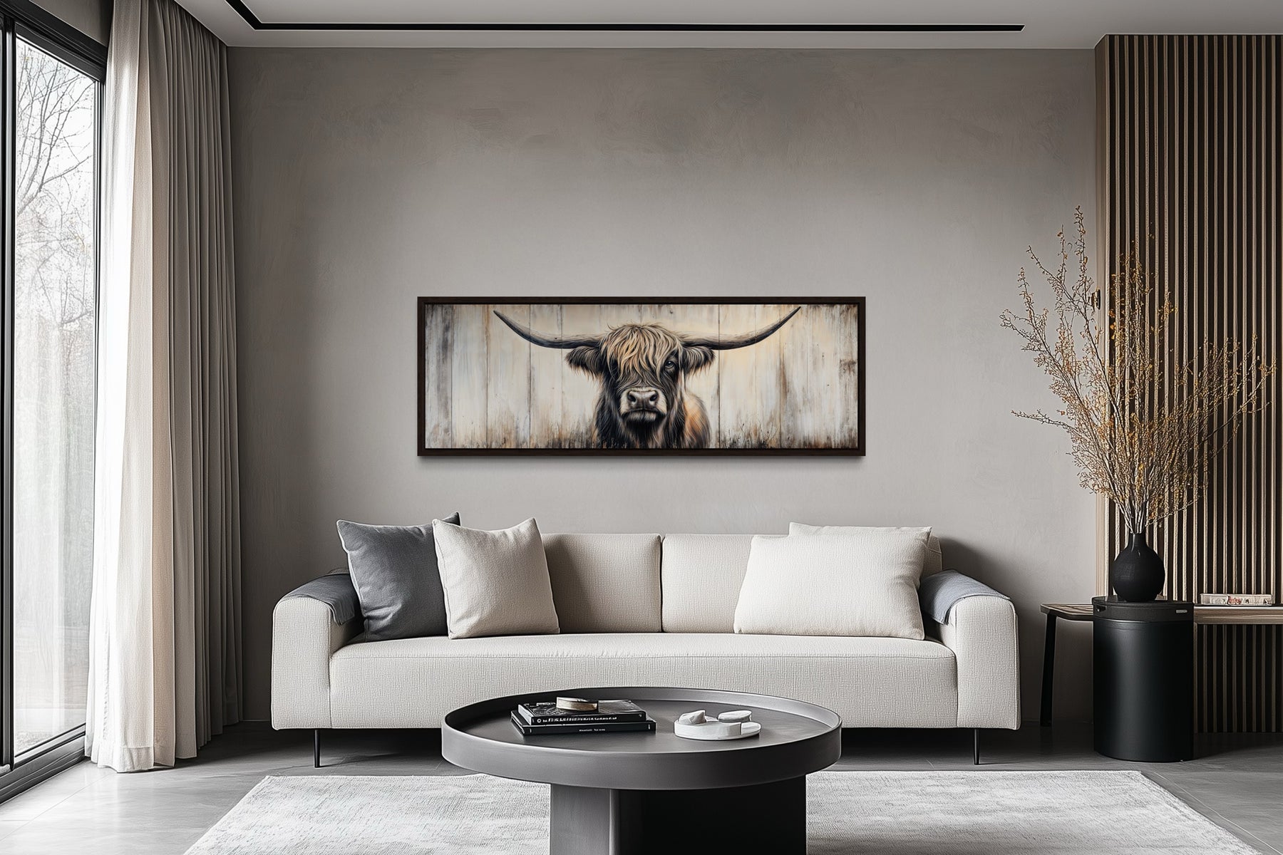 Dieses rustikale Wandbild mit einer auf Holz gemalten Hochlandkuh ist eine perfekte Ergänzung für Häuser, die rustikale, bäuerliche oder ländlich inspirierte Einrichtung bevorzugen. Es ist ideal, um eine gemütliche, einladende Atmosphäre in Wohnzimmern, Essbereichen oder sogar Schlafzimmern zu schaffen. Die natürlichen Texturen und erdigen Farben machen es zu einem vielseitigen Stück, das sowohl traditionelle als auch zeitgenössische Inneneinrichtungen ergänzen kann. Das Kunstwerk eignet sich auch wunderbar für eklektische oder böhmische Räume, wo seine einzigartige Mischung aus rustikalem Charme und natürlicher Schönheit wirklich zur Geltung kommt. Egal, ob Sie Ihre Liebe zu Nutztieren feiern oder Ihrer Einrichtung einfach einen Hauch von Landleben verleihen möchten, dieses Wandbild mit einer Hochlandkuh bringt Wärme und Charakter in Ihr Zuhause.