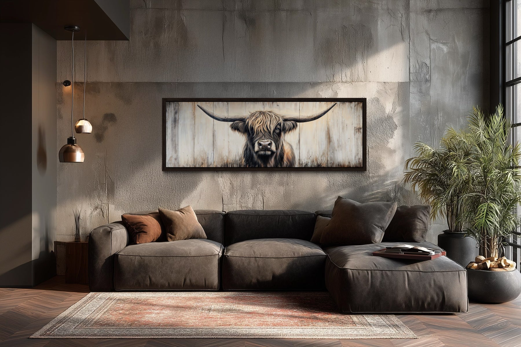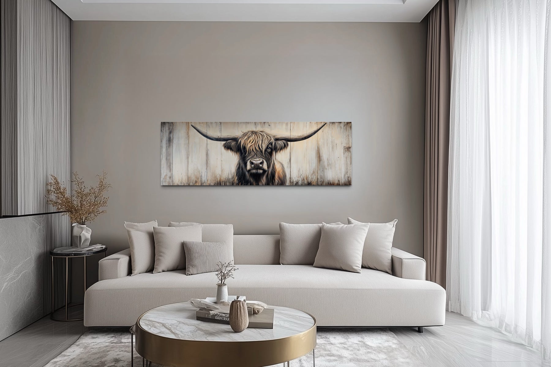 Dieses auf Holz gemalte rustikale Wandbild einer Hochlandkuh fängt den Charme und die Rauheit der schottischen Highlands wunderschön ein. Das Kunstwerk zeigt eine detaillierte und lebensechte Darstellung einer Hochlandkuh mit ihren charakteristischen langen Hörnern und ihrem zotteligen Fell vor einem rustikalen Holzhintergrund. Die natürlichen Texturen des Holzes verstärken die Authentizität des Stücks und verleihen ihm ein rohes, erdiges Gefühl, das das wilde und ungezähmte Aussehen der Kuh perfekt ergänzt. Dieses rustikale Wandbild ist ideal für diejenigen, die das Landleben und die natürliche Schönheit von Nutztieren schätzen, und bringt einen Hauch der Highlands in Ihr Zuhause. Egal, ob Sie einem Wohnzimmer, Schlafzimmer oder einer Küche Wärme und Charakter verleihen möchten, dieses Stück ist fertig zum Aufhängen und verwandelt Ihren Raum mit seinem rustikalen Charme.
