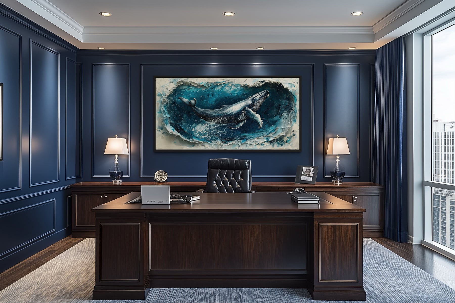 Die Farbpalette dieses nautischen Gemäldes besteht aus dramatischen Meerestönen – Mitternachtsblau, Marineblau, Schiefergrau und schäumendem Weiß – und soll das Gefühl sturmgepeitschter See und mondbeschienener Küsten hervorrufen. Der Körper des Wals ist in tiefem Indigo und Stahlblau gehalten, wobei hellere Glanzlichter seine Kurven und Flossen vor der Welle konturieren. Das umgebende Wasser ist eine stimmungsvolle Mischung aus Marineblau und Schwarz, unterbrochen von hellen Gischtkämmen und silbrigen Reflexen. Dezente Anklänge von Blaugrün und Aquamarin tauchen im Schaum und an den Rändern der Dünung auf und verleihen der Szene visuelle Tiefe ohne überwältigenden Kontrast. Die Glanzlichter wirken wie natürliche Lichtreflexe, die den Sturm durchbrechen und die Aufmerksamkeit auf die Bewegung des Wals und die Kraft der Welle lenken. Strukturelle Pinseleffekte imitieren Ölmalerei-Techniken und verleihen der Leinwand visuelle Fülle. Obwohl die Szene dramatisch ist, bleiben die Farbtöne raffiniert. Sie vermeiden Primärfarben und orientieren sich stattdessen an einer reifen, atmosphärischen Ästhetik. Das Werk ist über die gesamte Oberfläche hinweg tonal konsistent und lässt sich daher problemlos mit Küsten-, Marine- oder minimalistischen Farbpaletten kombinieren. Dieses Buckelwal-Gemälde verwendet kräftige aquatische Farbtöne, um Intensität und Gelassenheit in perfekter Balance zu vermitteln.