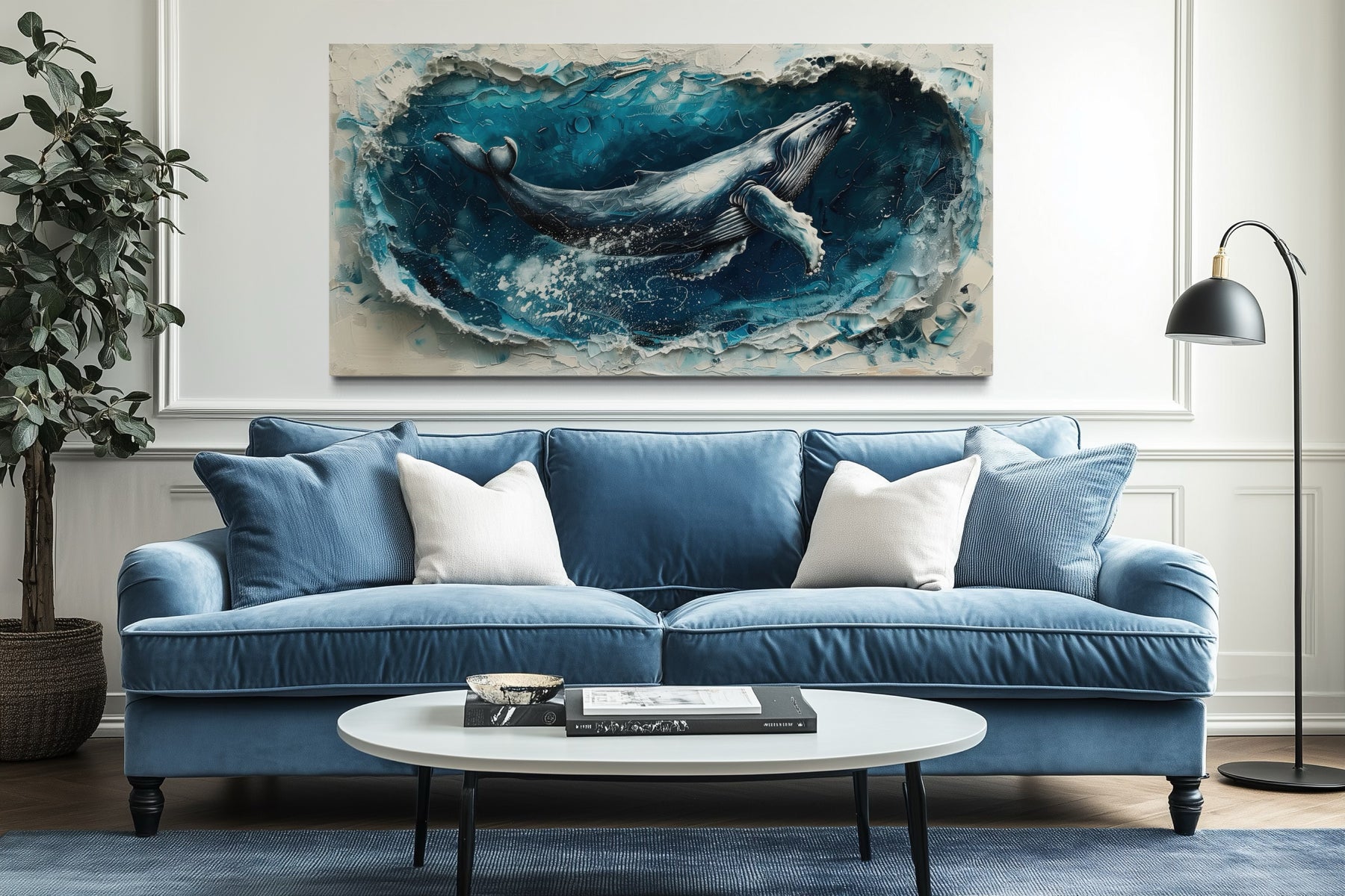 Diese vom Meer inspirierte Leinwand eignet sich perfekt für Küstenhäuser, Junggesellen-Lofts und Männerhöhlen, die eine dramatische und dennoch raffinierte nautische Wanddekoration suchen. Seine stark horizontale Ausrichtung macht es zu einer ausgezeichneten Wahl über einem Ledersofa, einem Holzsideboard oder hinter einem Bett mit dunkler oder neutraler Bettwäsche. Das Thema und die Farben machen es besonders ansprechend in Räumen, in denen ein maskuliner, abenteuerlicher Ton gewünscht ist – wie Spielzimmer, Arbeitszimmer oder Hausbars mit maritimen oder Entdeckermotiven. Für Häuser mit einem modernen Küstenflair bringt dieses Walkunstwerk Energie und Bewegung ohne die Klischees einer helleren Stranddekoration. Es passt gut zu Metallakzenten, Altholz und dunkleren Wandtönen, die die Blau- und Grautöne des Werks wirklich hervorheben. In Cottages oder Häusern am Meer bietet es einen Kontrast zu helleren Textilien und unterstreicht gleichzeitig die Liebe zum Meer und seinen Lebewesen. Die Kombination aus feinen Details und rustikaler Druckstruktur macht es in gehobenen Küsteninterieurs genauso gut wie in entspannteren, nautischen Hütten. Das Panorama-Layout erfüllt den Raum mit Präsenz und Geschichte und verleiht ihm eine besondere Atmosphäre, ohne dass zusätzliche Kunstwerke erforderlich sind. Dieses Buckelwal-Leinwandbild bringt ausdrucksstarke Meeresgeschichten in moderne, nautische Innenräume.