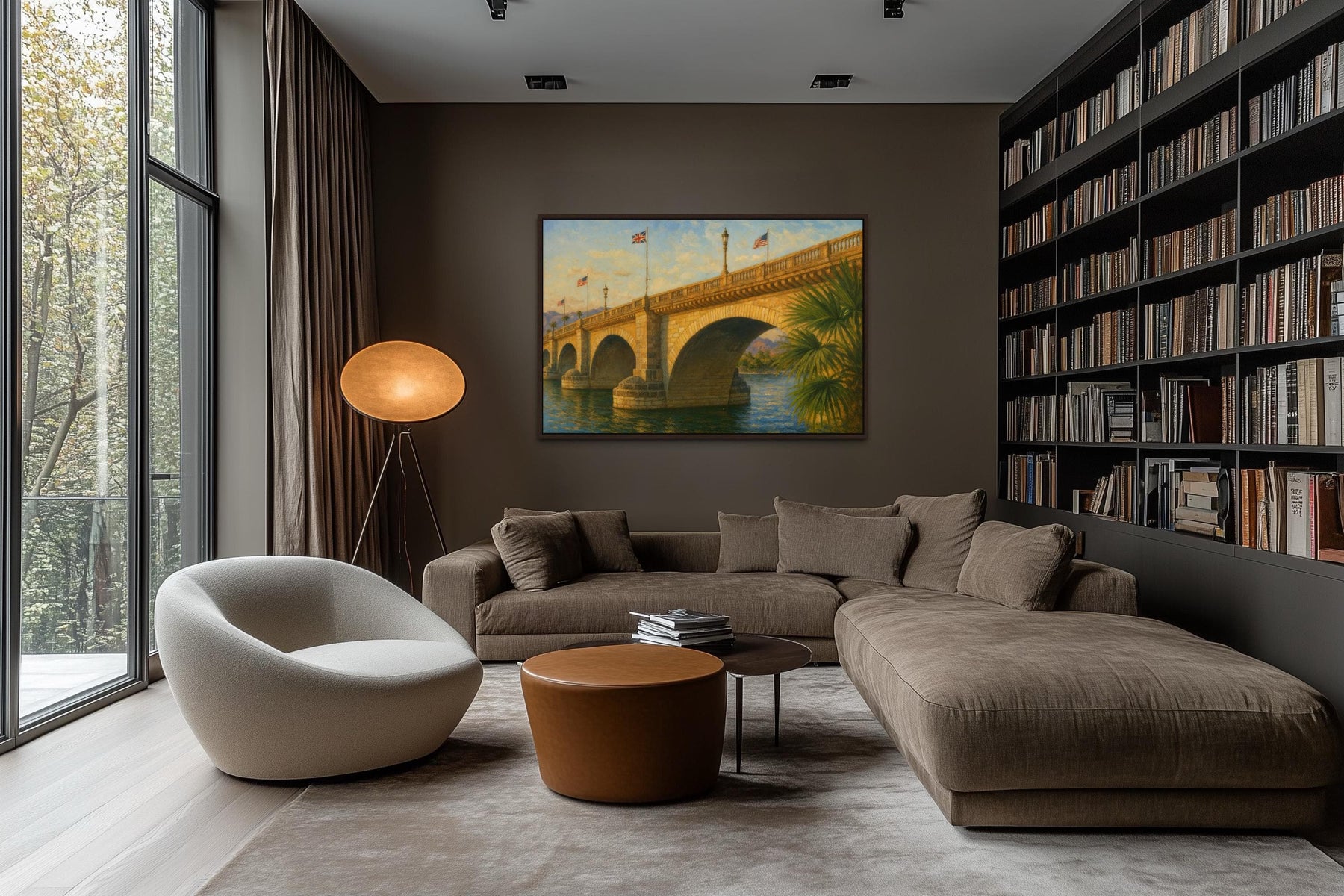 Dieses Kunstwerk fügt sich harmonisch in Wohnzimmer von Seehäusern, Küstenräumen, Ferienhäusern und entspannten Interieurs im Südwest-Stil ein, wo warme, neutrale Töne und sonnige Atmosphäre geschätzt werden. So wird die Wanddekoration „London Bridge“ zum Blickfang, der sowohl malerische als auch vertraute Elemente vermittelt. Ihre sanften Farben harmonieren mit Korbmöbeln, hellen Hölzern, sandfarbenen Tönen, Leinenstoffen und Räumen, die von Wasser und Reisen inspiriert sind. Besonders gut kommt sie über Sofas, Konsolentischen oder Betthäuptern in Häusern zur Geltung, die ein offenes, luftiges Ambiente bevorzugen. Die ruhige Energie der Landschaft passt ideal zu Orten der Entspannung wie Leseecken, Wintergärten und gemütlichen Treffpunkten. Das Kunstwerk vereint einen Hauch Geschichte mit dem Charme einer Küstenstadt und wirkt dadurch besonders eindrucksvoll, ohne den Raum zu dominieren. Es wertet Räume auf, in denen Licht, Wärme und natürliche Helligkeit wichtig sind. Ferienwohnungen und Airbnb-Unterkünfte in der Nähe von Seen oder Wüstenregionen profitieren von seiner malerischen Wirkung und dem wiedererkennbaren Motiv. Das Kunstwerk fügt sich gleichermaßen in moderne Seehäuser und klassische Räume im Reisestil ein. Seine entspannte Stimmung sorgt für eine sofort einladende Atmosphäre. Mit unserem Wandbild „London Bridge“ rundet das Kunstwerk die unkomplizierte Atmosphäre von Innenräumen perfekt ab.