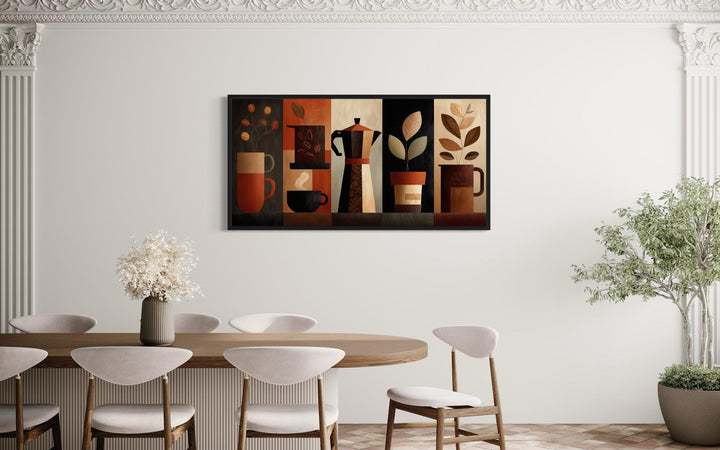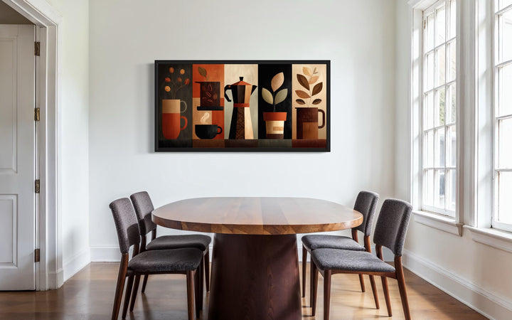 Dieser Leinwanddruck mit Kaffeemotiv eignet sich ideal für Küchen, Essbereiche oder Frühstücksecken, die eine moderne, retro-inspirierte oder skandinavische Ästhetik widerspiegeln. Seine klaren Linien und die gedämpfte Farbpalette harmonieren wunderbar mit Möbeln aus der Mitte des Jahrhunderts – insbesondere mit Naturholztischen, Vintage-Stühlen und Sitzbänken in neutralen Tönen. Dieses Kunstwerk eignet sich auch gut für moderne Wohnungen oder minimalistische Häuser, die von einem dezenten Akzent profitieren, ohne das Design zu überladen. Es verleiht kleineren Räumen wie Café-Ecken, Kaffeebars oder offenen Regalen neben Keramiktassen und -gefäßen eine einladende Atmosphäre. In größeren Esszimmern oder Küchen mit hohen Wänden sorgt es für optisches Interesse und verankert den Raum mit seiner symmetrischen Struktur. Ob Sie eine Wohnküche inszenieren, einen kurzen Flur in der Nähe der Speisekammer gestalten oder Ihre Lieblingswand neben der Espressomaschine verschönern – dieses Kunstwerk vermittelt Wärme und Gelassenheit. Es ist auch ein aufmerksames Geschenk für Kaffeeliebhaber oder alle, die Vintage-inspirierte Ästhetik in Kombination mit moderner Ausführung schätzen. Die gerahmte, aufhängefertige Leinwand lässt sich einfach anbringen und verwandelt Ihren Raum sofort in einen gepflegteren und gemütlicheren Ort. Alles vereint sich in der entspannten Schönheit unserer modernen Kaffee-Wandkunst aus der Mitte des Jahrhunderts.