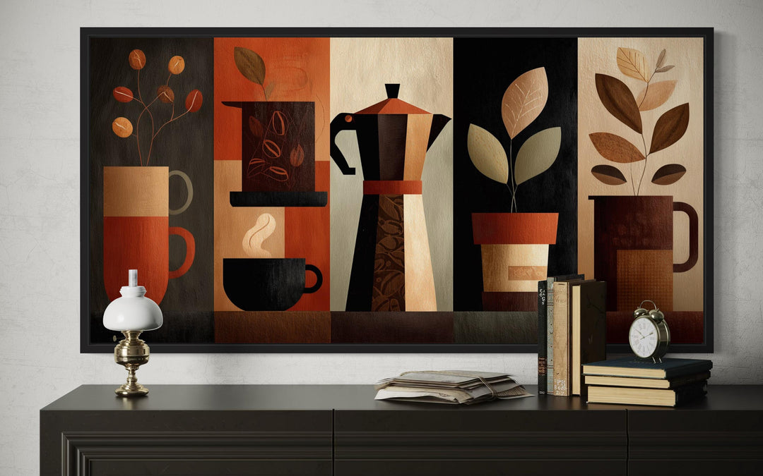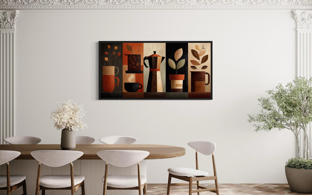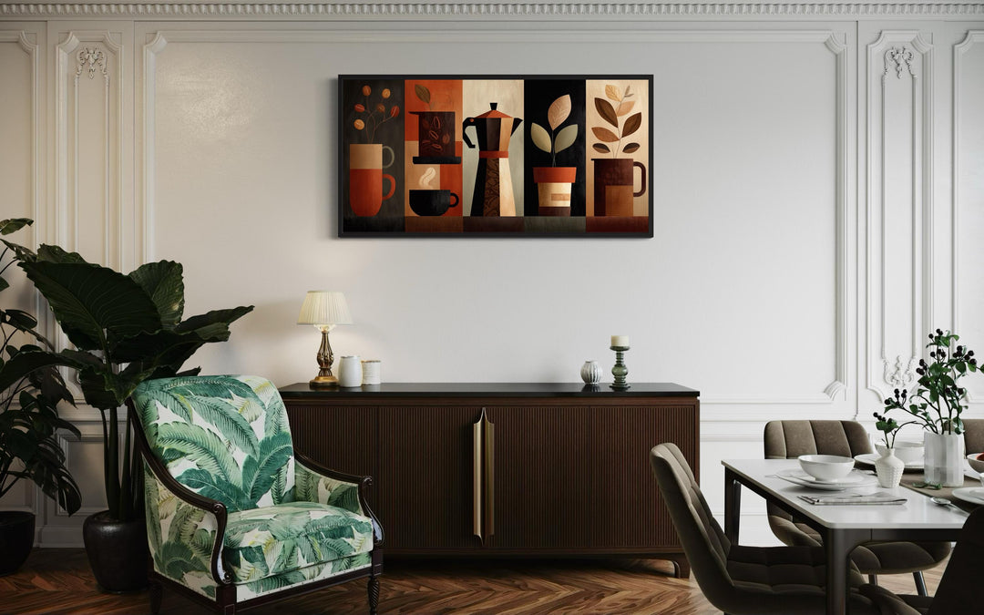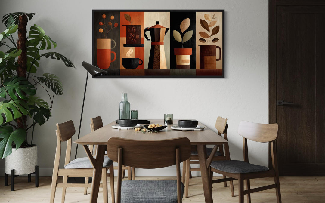 Die Farben dieser Leinwand mit Kaffeemotiv sind warm, gedämpft und bewusst retro und spiegeln die Töne wider, die man häufig in Keramik und Küchengeschirr aus der Mitte des Jahrhunderts findet. Rost-, Paprika-, Terrakotta-, Sand-, Schwarz- und Cremetöne verleihen diesem Stück eine behagliche, altbekannte Vertrautheit. Hinter den Formen befindet sich ein dunkelgrau-schwarzer Hintergrund, der die helleren Formen verankert und dem Layout eine kräftige grafische Präsenz verleiht. Die Becher, Pflanzen und Karaffen sind in soliden, matten Farben bemalt, die wie Keramikglasuren oder Vintage-Emaille aussehen. Kleine Details – wie Blattstiele, Dampflocken und Pflanzenformen – sind sauber und flach gehalten, wodurch alles ruhig und aufgeräumt wirkt. Diese Farbtöne wurden ausgewählt, um Wärme, Ausgewogenheit und Kontrast zu erzeugen und das Kunstwerk hervorzuheben, ohne laut oder grell zu wirken. Ein Spritzer Olivgrün in der Topfpflanze setzt einen natürlichen Akzent, der die ansonsten stark von Terrakotta geprägte Palette auflockert. Die Farbauswahl vermittelt ein Gefühl von gemütlichen Morgenstunden, gemeinsamen Mahlzeiten und funktionaler Schönheit – genau wie in einer Mid-Century-Küche. Die warme Atmosphäre und die gedämpfte Farbsättigung machen dieses Kaffee-Wandbild zu einer idealen Ergänzung für helle und dunkle Innenräume.
