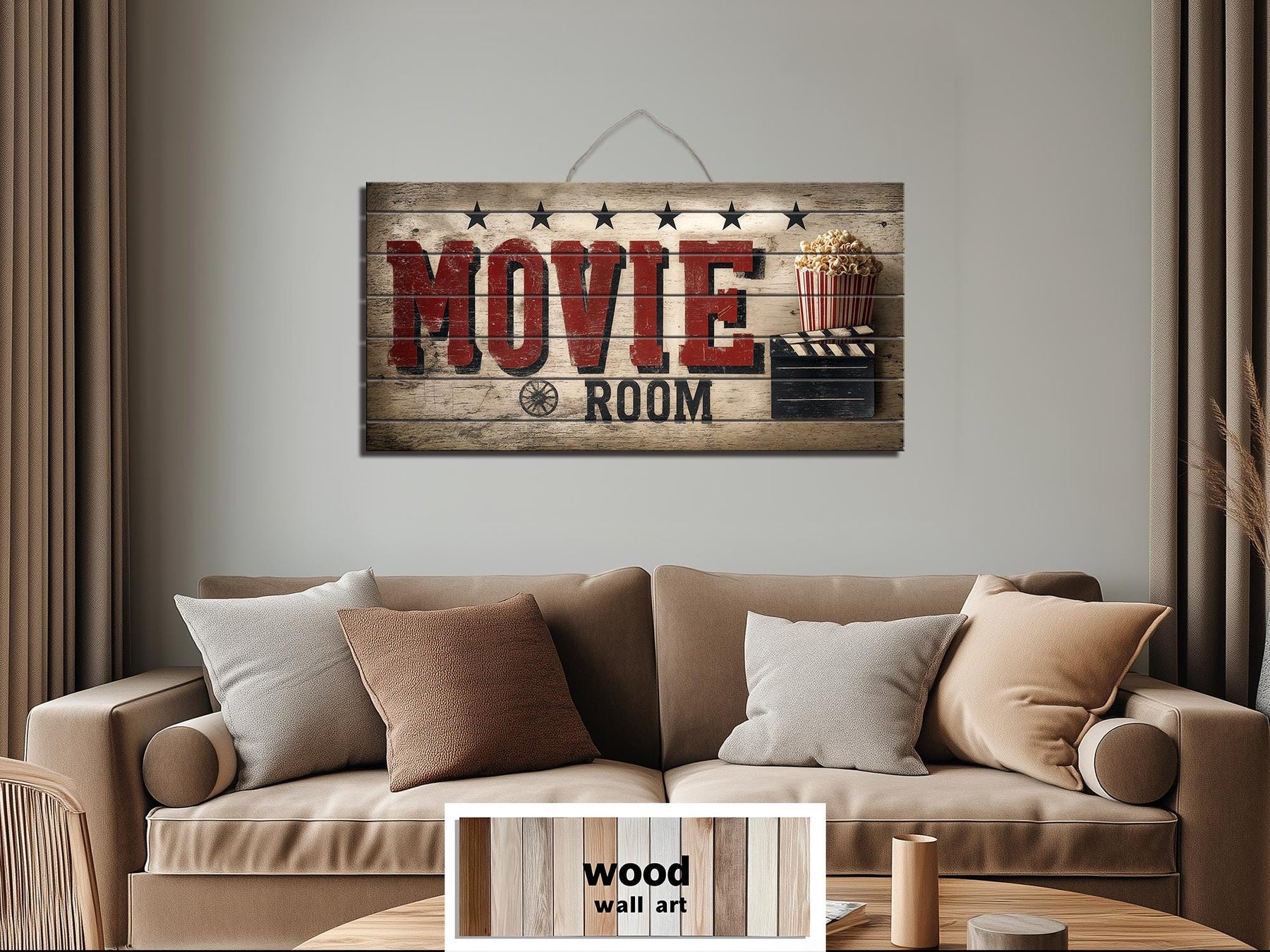 Dieses Wandbild fürs Heimkino wurde speziell für Räume mit bequemen Sitzen, warmem Licht und einer großen Leinwand entworfen, in denen sich ein exklusives Entertainment-Ambiente findet. Ob über einem Ledersofa oder an der Rückwand hinter Sesseln – das breite Format zentriert den Raum optisch und definiert dessen Zweck klar. Die Echtholzkonstruktion harmoniert perfekt mit Akustikpaneelen, dunklen Farben und Möbeln im Industrie- oder Landhausstil, die häufig in Medienräumen zu finden sind. Die Vintage-Optik verstärkt die Kinoatmosphäre und lässt den Raum eher wie eine private Vorführlounge als wie ein gewöhnliches Wohnzimmer wirken. Die Used-Optik passt ideal zu Metallleuchten, offenen Regalen und Filmplakaten. Die markante Typografie bleibt auch bei gedämpftem Licht gut lesbar und unterstreicht so die Identität des Raumes an Filmabenden. Dieses Wandbild eignet sich für Räume, die zum Entspannen, Genießen und Beisammensein einladen, weniger für formelle Empfänge. Die horizontale Form füllt die Wand aus, ohne mit der Leinwand zu konkurrieren, und sorgt so für ein harmonisches Gesamtbild. Es verleiht einem Raum, der oft von Technik dominiert wird, Persönlichkeit und Wärme. Das gesamte Heimkinoerlebnis wird durch unser rustikales Holzschild „Movie Room“ abgerundet.