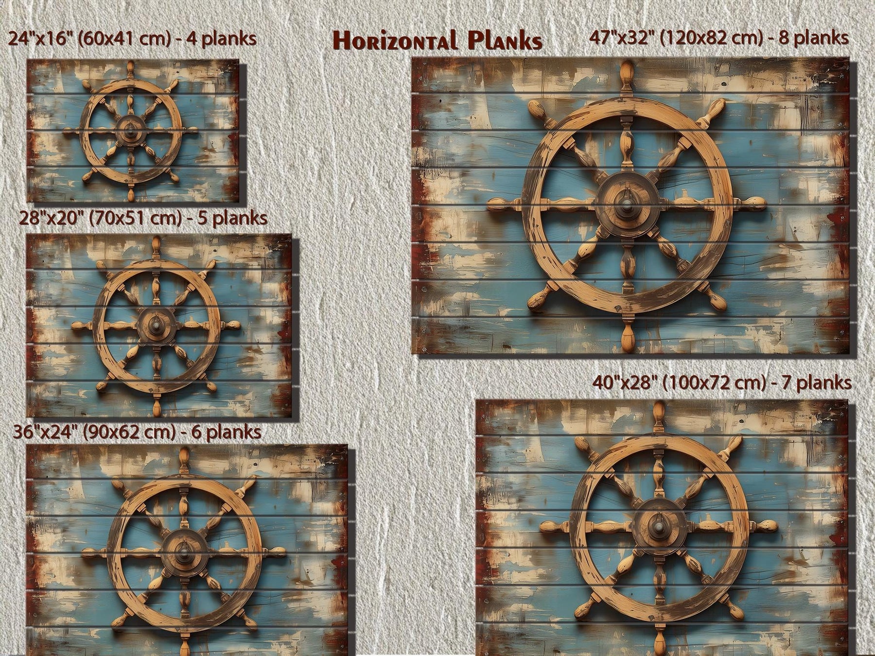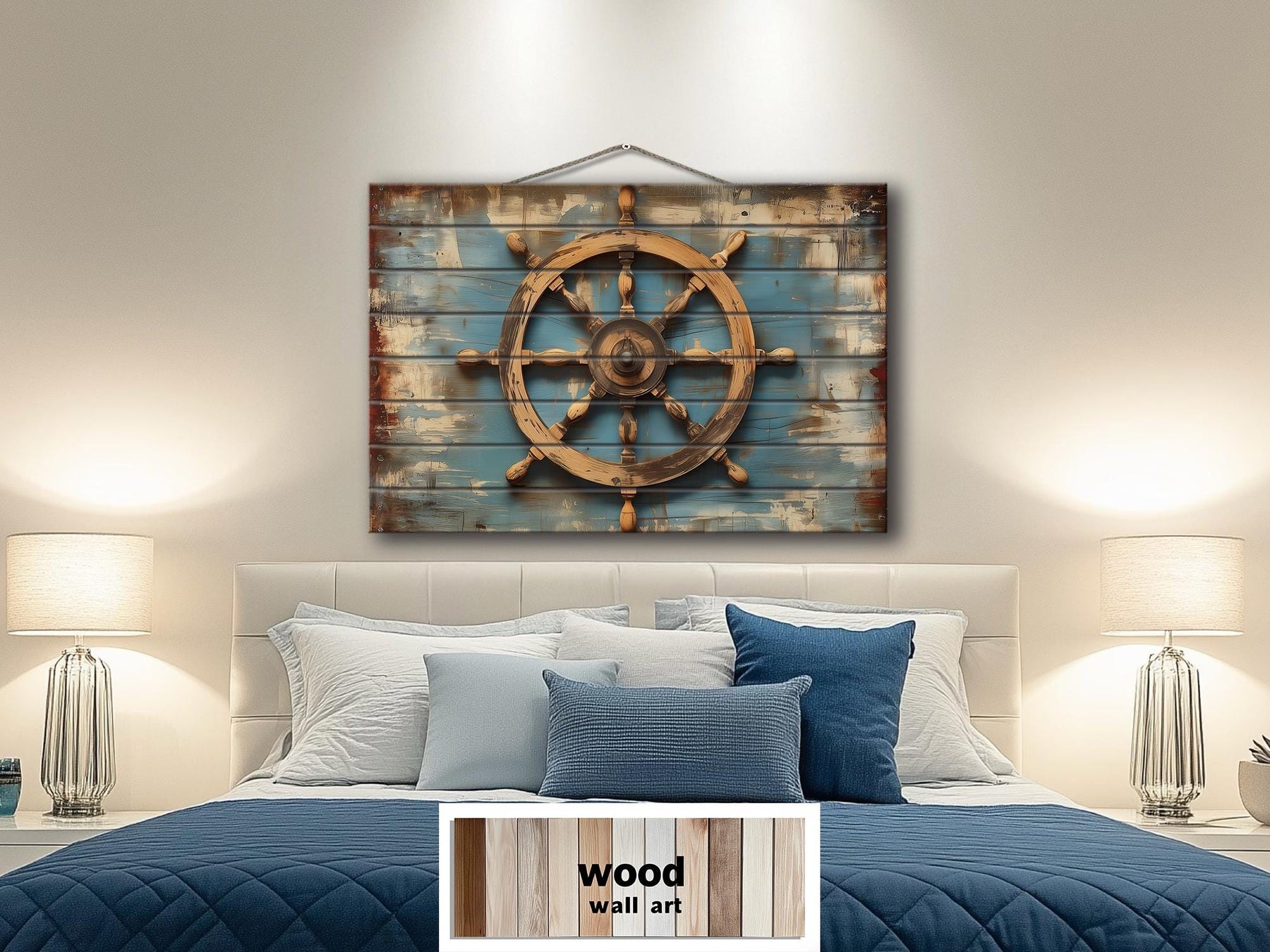 Die Farbpalette vereint vom Ozean inspirierte Blautöne, Türkisgrün, verwaschenes Türkis, Treibholzgrau und ein sanftes Sandbeige mit warmen Brauntönen, die für das Steuerrad selbst verwendet wurden. Der „abgenutzte“ Hintergrund vereint übereinanderliegende Farbschichten und verwitterte Spuren, die sonnengebleicht und vom Meer ausgewaschen wirken, doch der Druck bleibt klar und fühlt sich glatt an. Die gedeckten Töne vermeiden grelle Strandfarben und setzen stattdessen auf Küstenfarben, die authentisch und gealtert wirken. Das braune Steuerrad hat eine natürliche Holzmaserung, die durch subtile Schatten kontrastiert wird und ihm vor den helleren Brettern Tiefe verleiht. Die Nuancen von Türkis und Meeresgrün imitieren oxidierte Bootsfarbe und gealterte Dockpfähle und verleihen dem Design Charakter, ohne es zu dominieren. Dank dieser Farbtöne lässt sich das Kunstwerk hervorragend mit gewebten Texturen, marineblauen Zierkissen, Rattan, Messingakzenten oder weiß getünchten Möbeln kombinieren. Nichts in der Palette wirkt künstlich oder plastisch – die Farben erinnern an salzige Meeresluft, Treibholz und die Spuren der Witterung im Hafen. Die Kombination aus kühlen und warmen Farbtönen macht das Möbelstück vielseitig einsetzbar, sowohl in dunklen als auch in hellen Räumen, insbesondere in solchen, die von Küstenhäusern, Seehäusern oder Seebadtavernen inspiriert sind. Das Design wirkt durchdacht und vielschichtig, nicht flach oder digital einfach, sodass es selbst in minimalistischen Räumen eine edle Note erhält. Diese raffinierte Farbpalette sorgt dafür, dass es als maritimes Holzdekor und nicht nur als verspielte Wanddekoration wirkt.